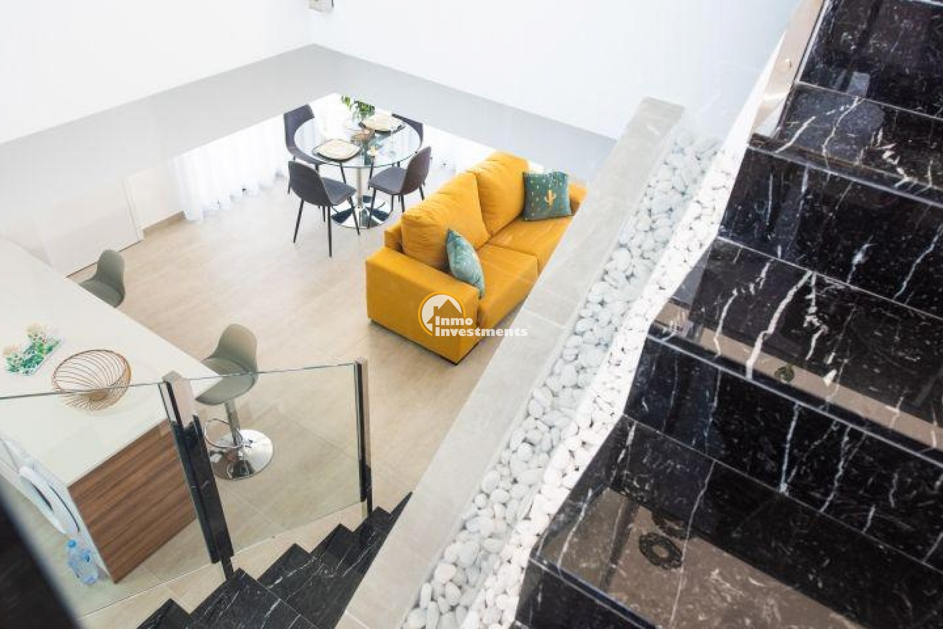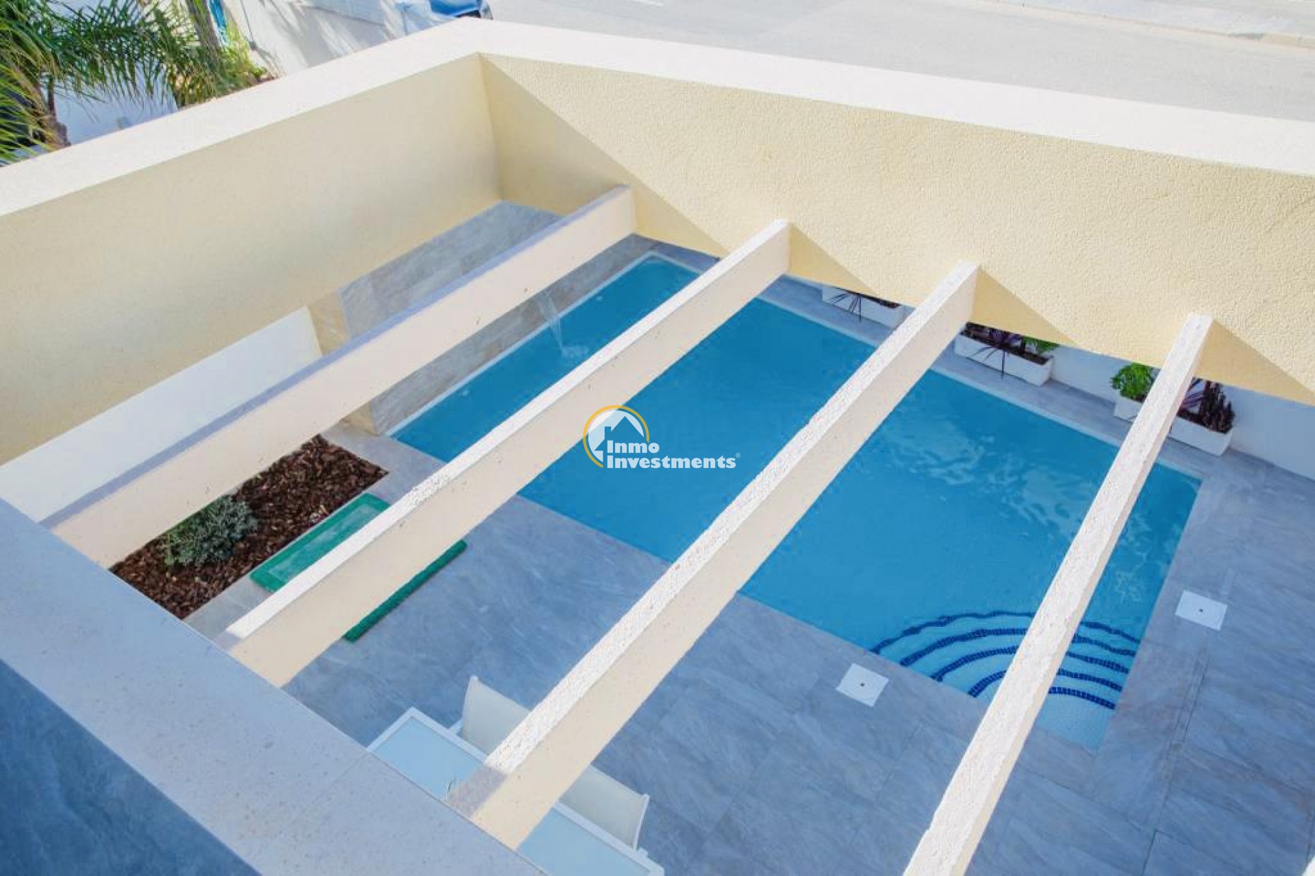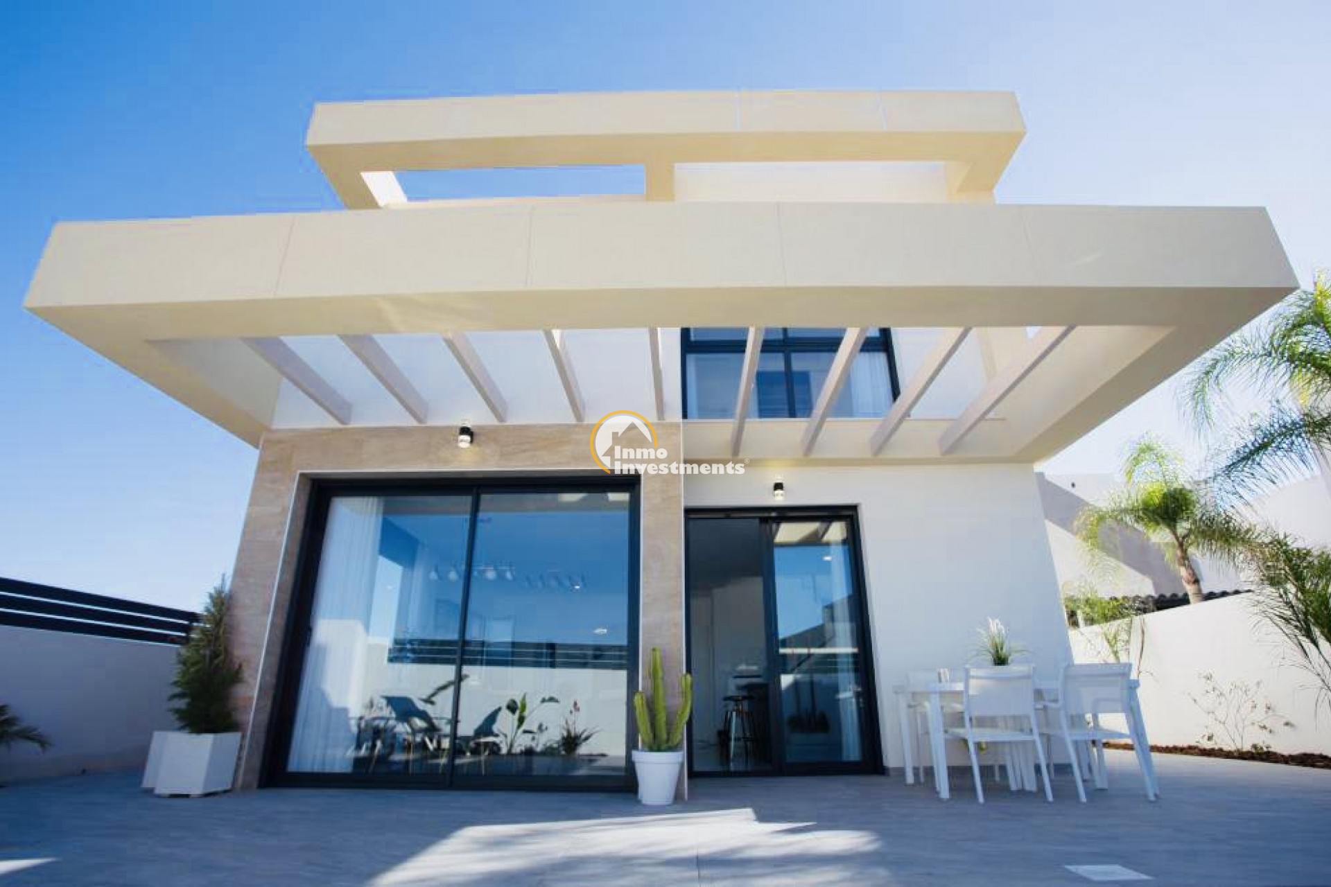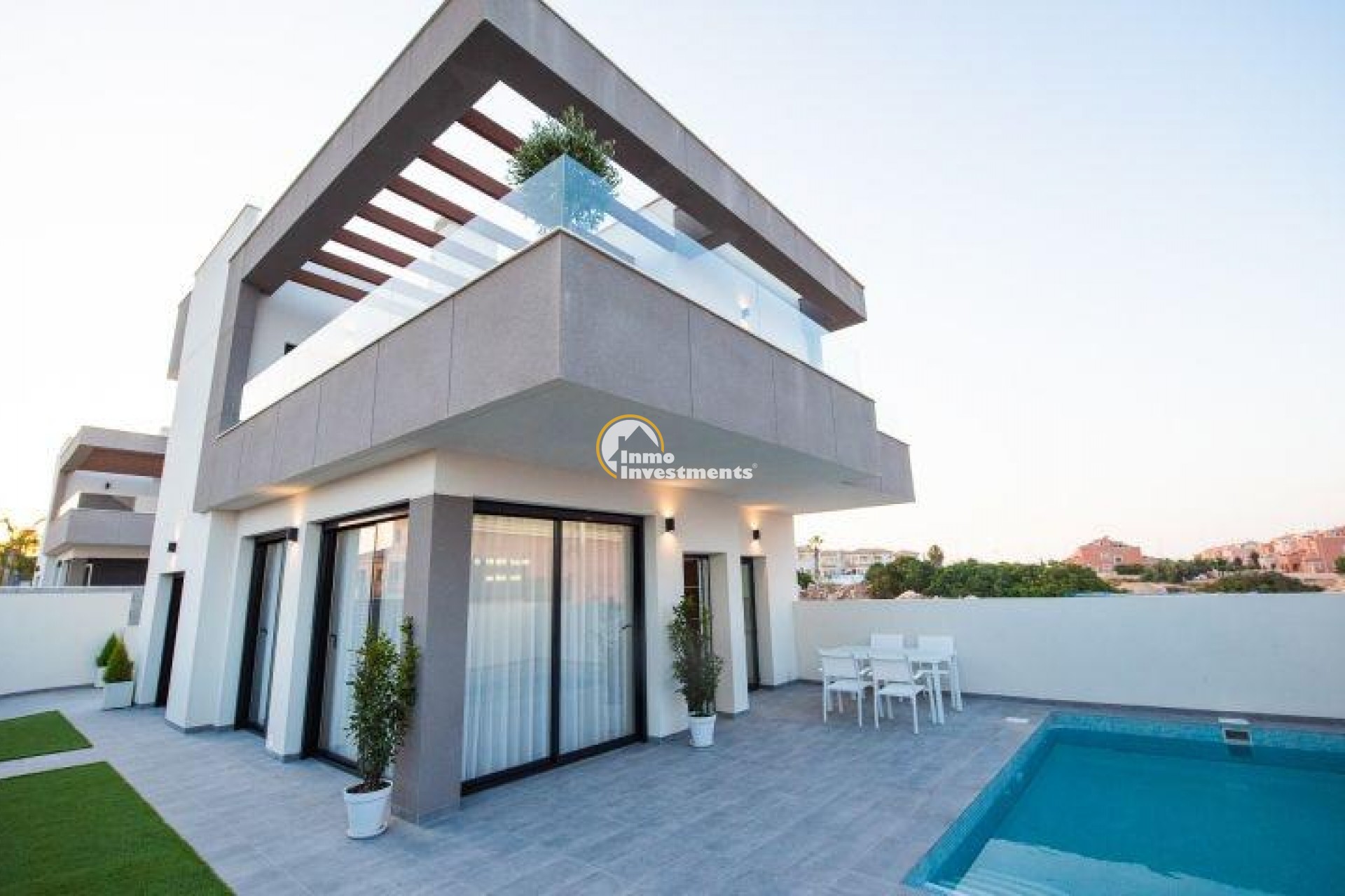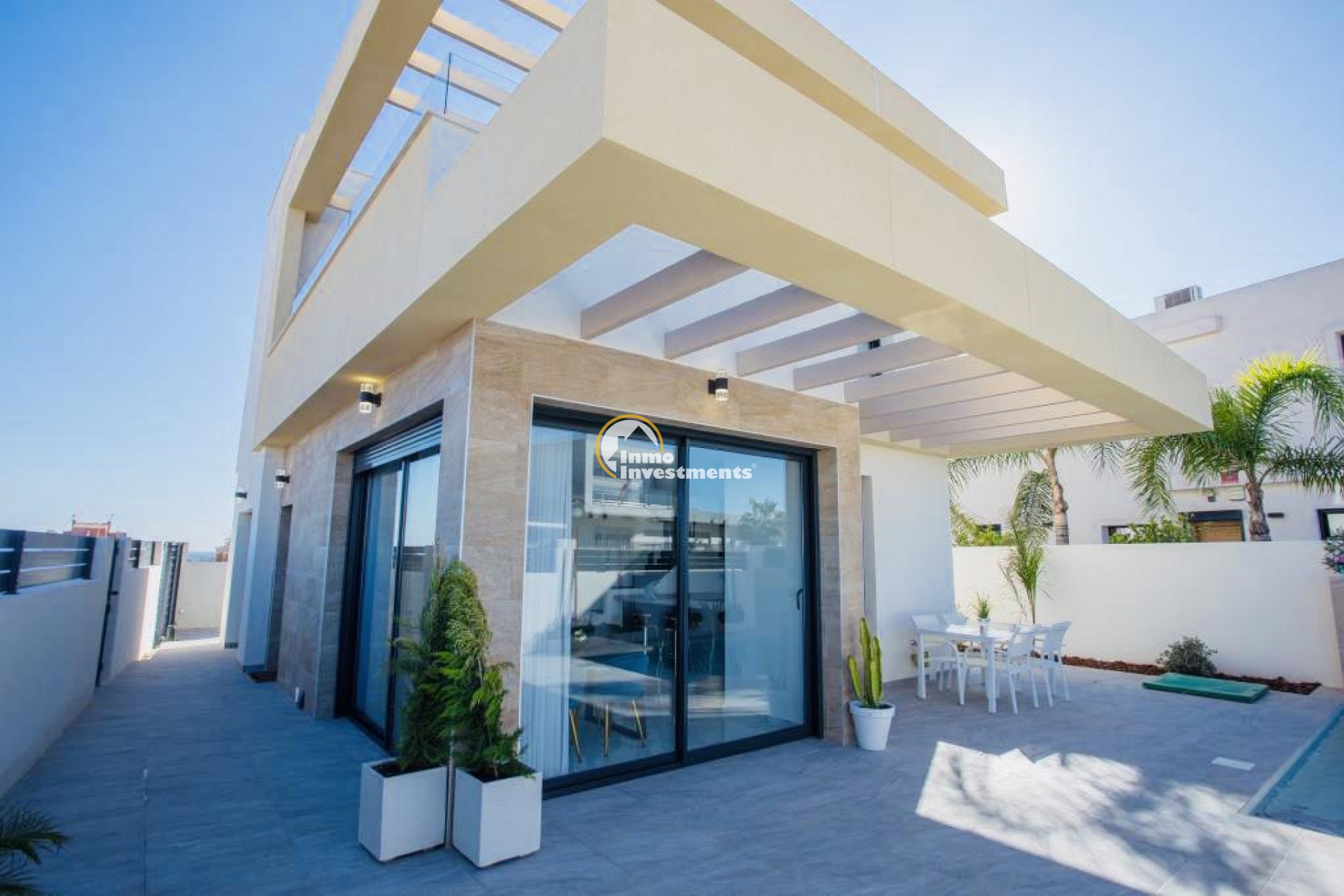 New construction villas located in Los Montesinos (South of Alicante).~~Villas with 3 bedrooms, 2 bathrooms, 1 toilet, private pool and solarium.~Distributed in 2 levels:~- The ground floor has a living-dining room integrated with the kitchen, patio, toilets, 1 main bedroom with dressing room, 1 bathroom, terrace and private pool.~- The first floor has 2 bedrooms, 1 bathroom, terraces.~- Solarium~The house has a great luminosity and good design.~~INCLUDED IN THE PRICE:~Swimming pool.~Pre-installation A / C.~Garden Artificial Grass~Solarium.~Car door motorization.~Ceramic hob, oven and fume extractor~Underfloor heating in the bathrooms~Shower screens~Video intercom~Motorized aluminum blinds~~Ideal location to enjoy the tranquility with all the services, restaurants, pharmacies, etc ... just 2 minutes walk.~~Surrounded by several Golf Courses of Great Prestige and very close to the beaches of Guardamar and Torrevieja. The nearby nature reserves and their lakes are perfect for bird watching, walking, cycling and horse riding.~~Los Montesinos are located between the salt lakes of Torrevieja and La Mata, creating a unique and healthy lifestyle.~~Distance to the sea 8km, to the Golf 5 km and to Alicante Airport 29 km.