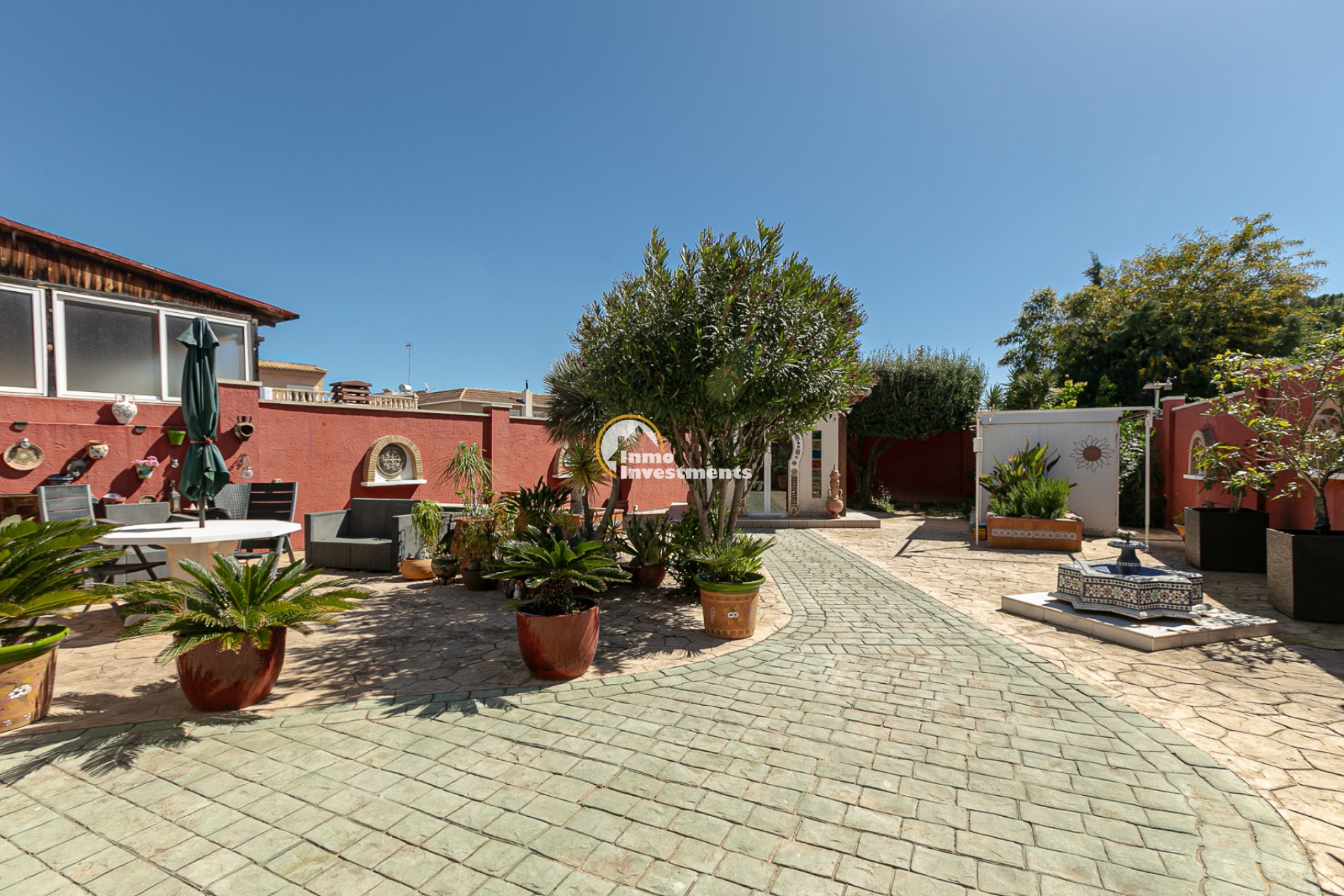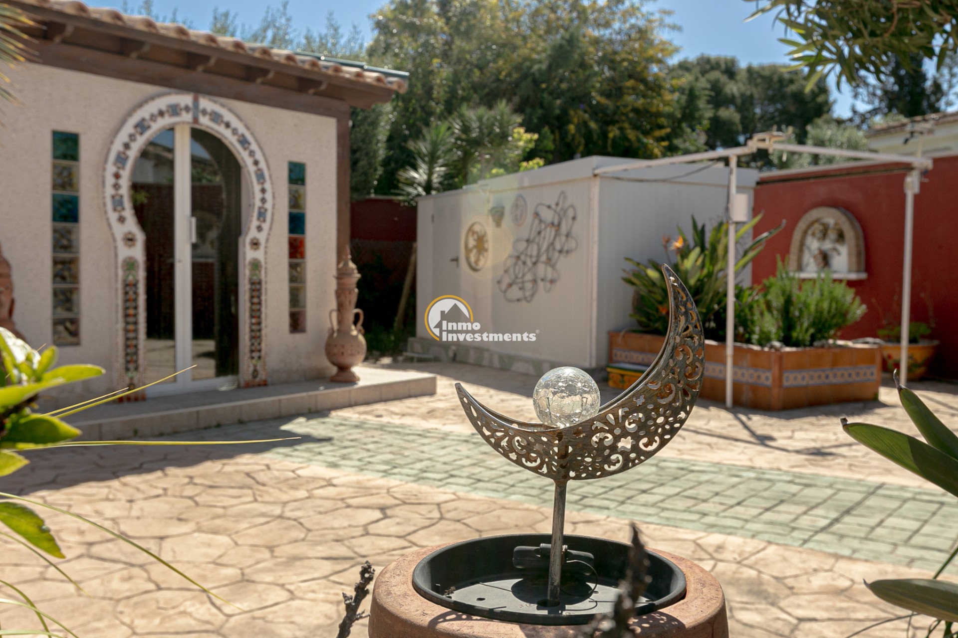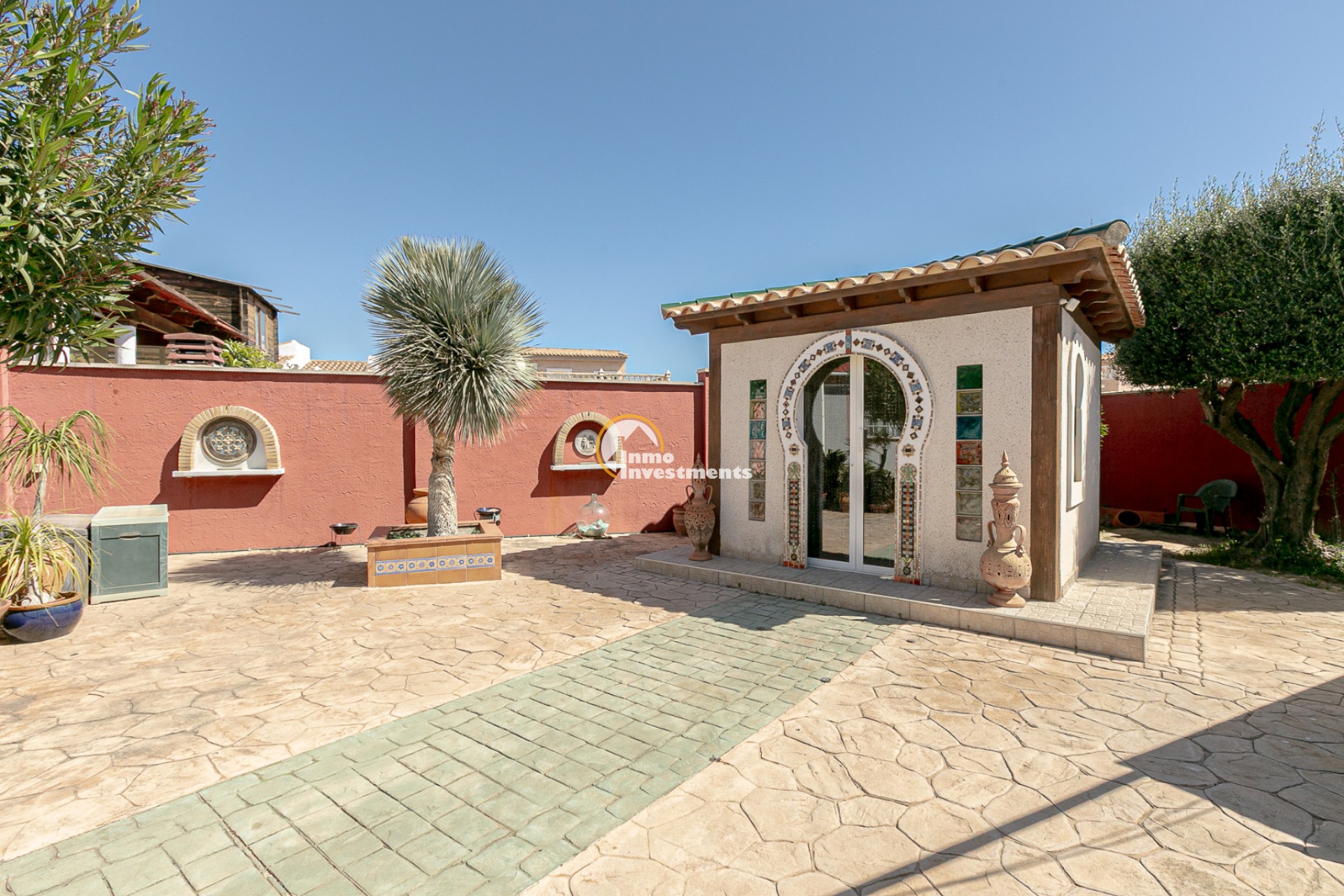 At the front, there is a spacious plot with multiple possibilities: a charming summer house decorated in Moroccan style, an additional storage room, and an aluminium shed, perfect for extra storage. There is also enough space to build a private pool, and there are no community fees.