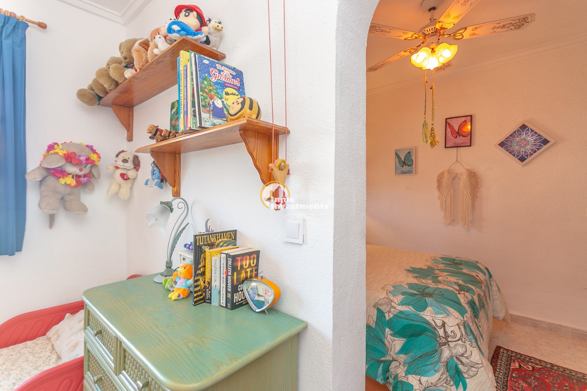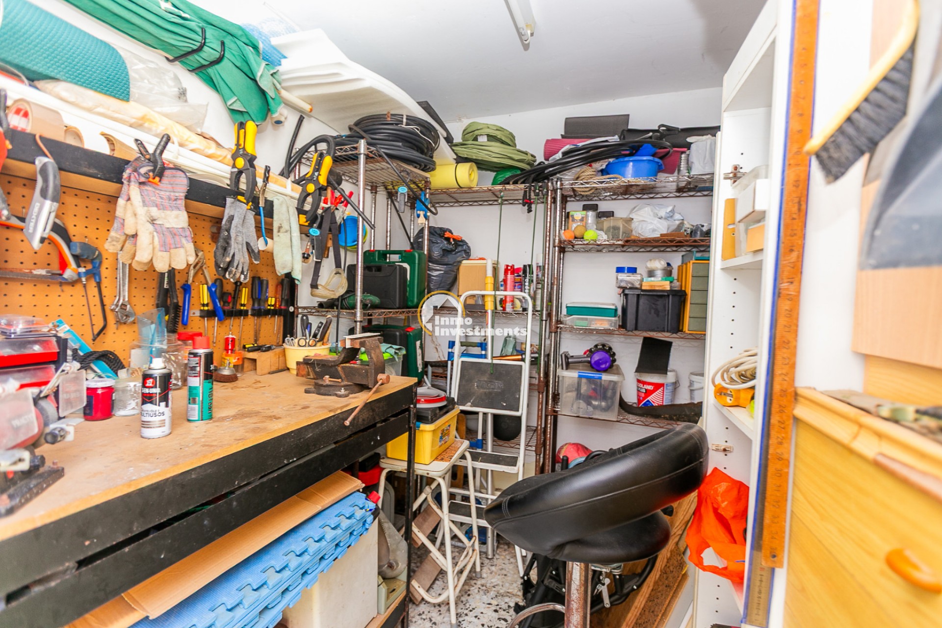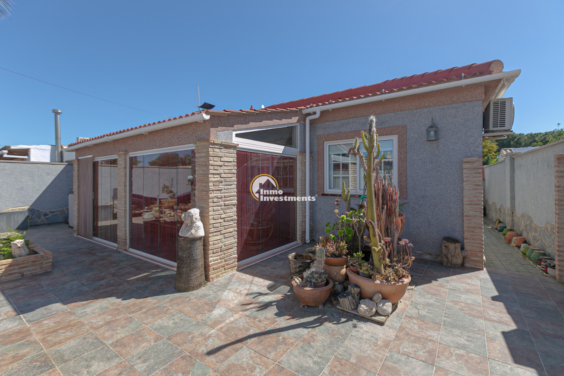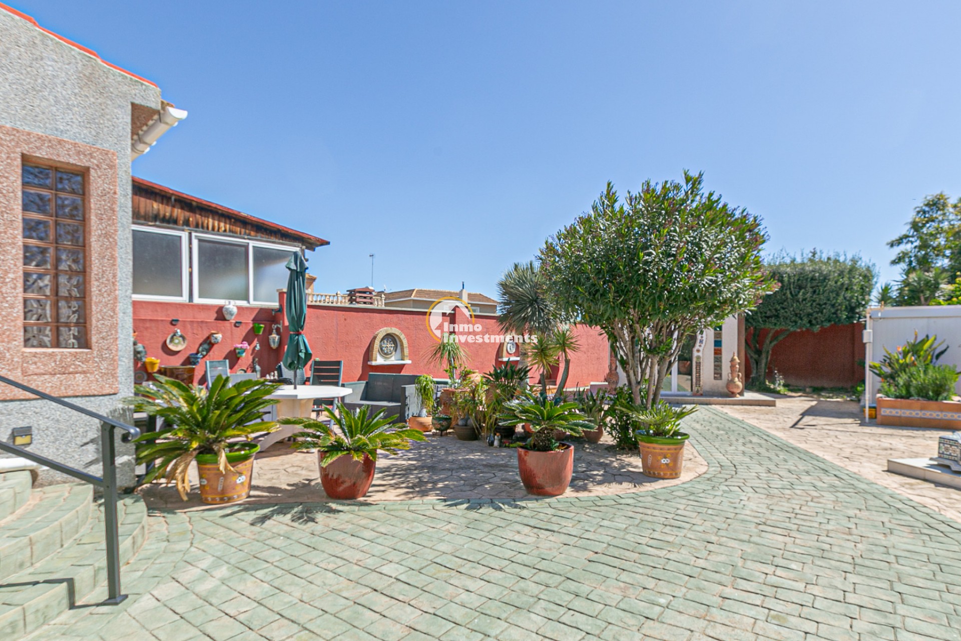 At the front, there is a spacious plot with multiple possibilities: a charming summer house decorated in Moroccan style, an additional storage room, and an aluminium shed, perfect for extra storage. There is also enough space to build a private pool, and there are no community fees.