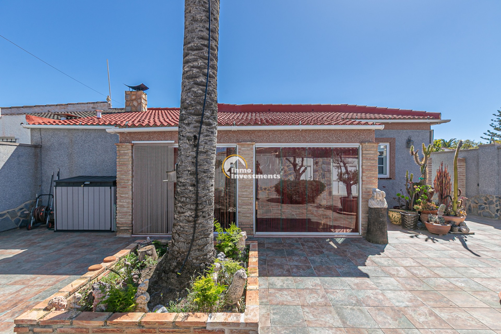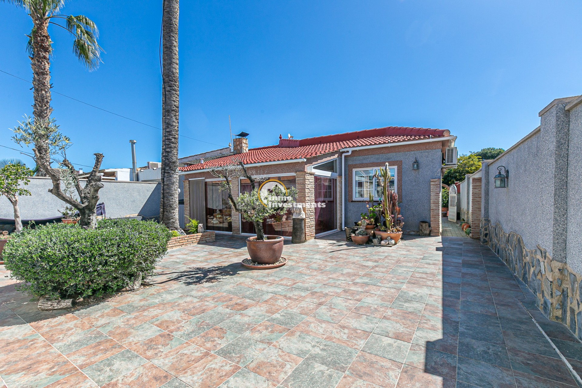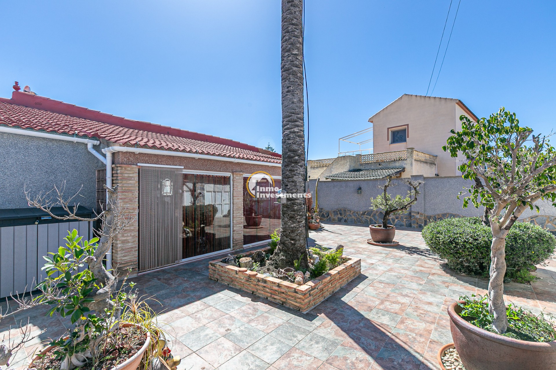 The property has an independent entrance and a fully tiled plot, making it very practical and low maintenance. Upon entering, you are welcomed by a beautiful garden featuring an impressive palm tree and an olive tree, adding a Mediterranean touch from the very beginning.