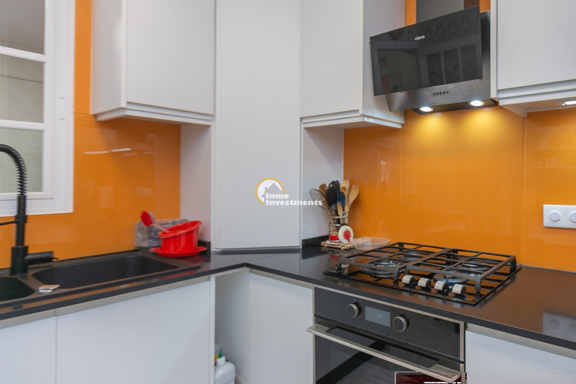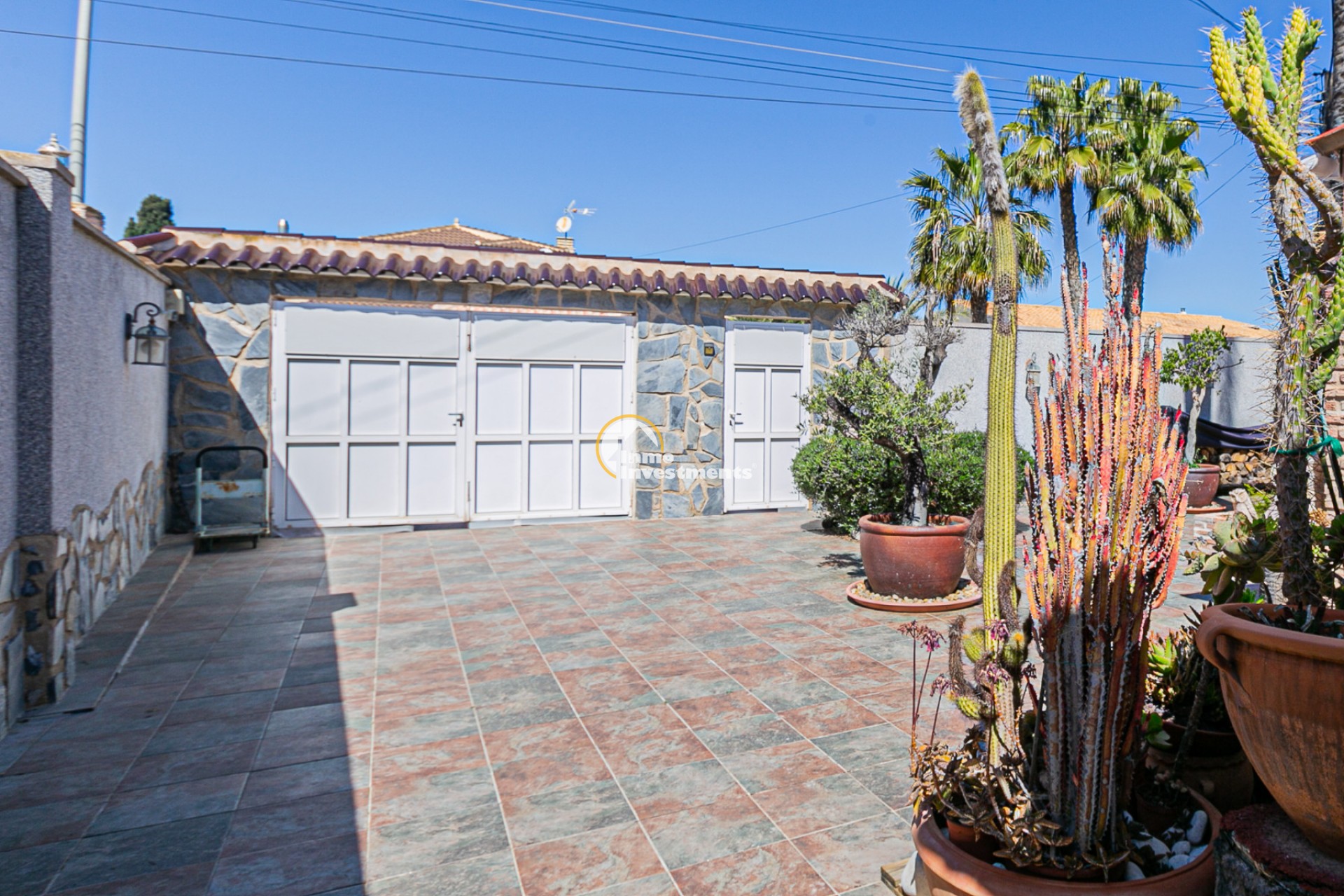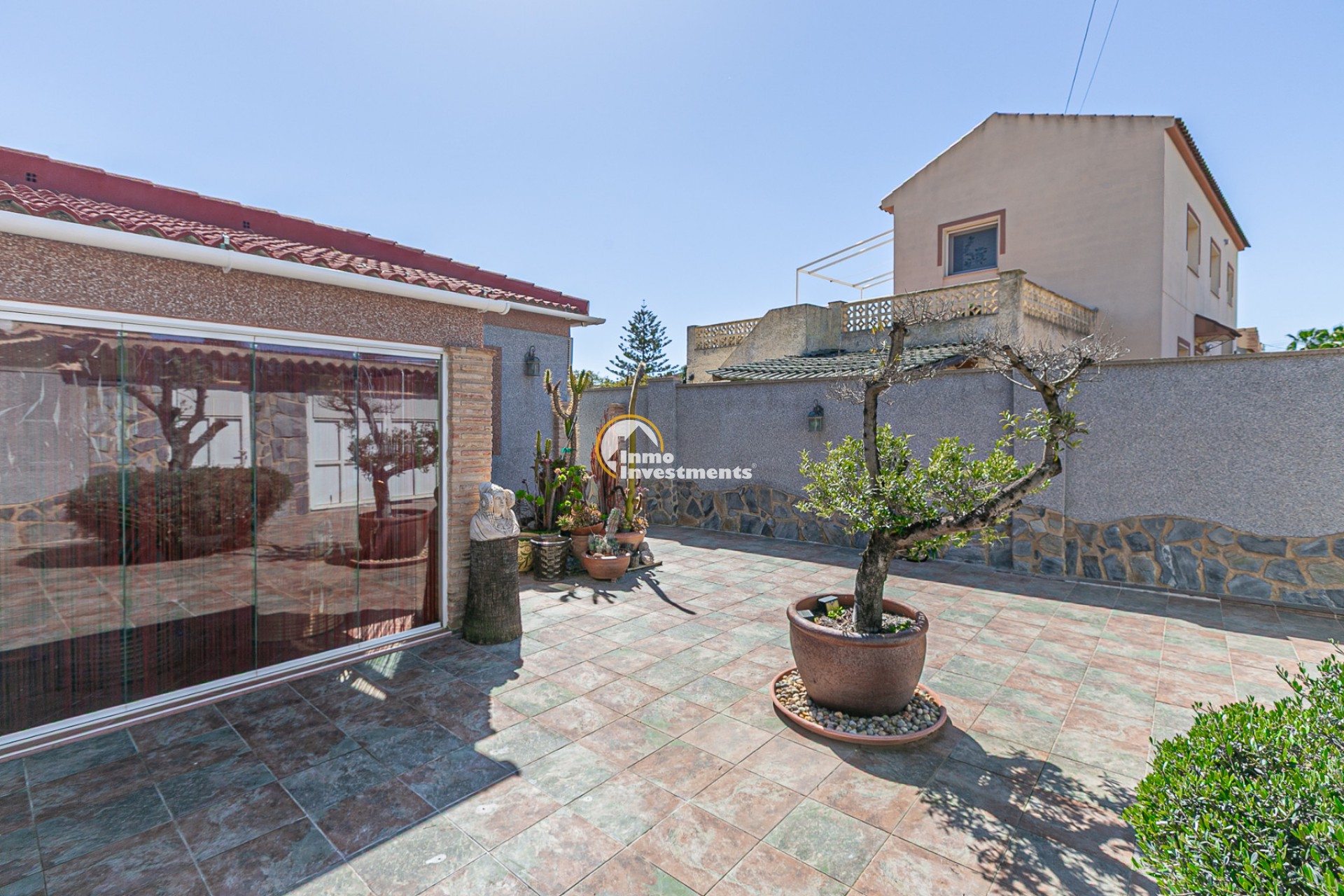 The property has an independent entrance and a fully tiled plot, making it very practical and low maintenance. Upon entering, you are welcomed by a beautiful garden featuring an impressive palm tree and an olive tree, adding a Mediterranean touch from the very beginning.