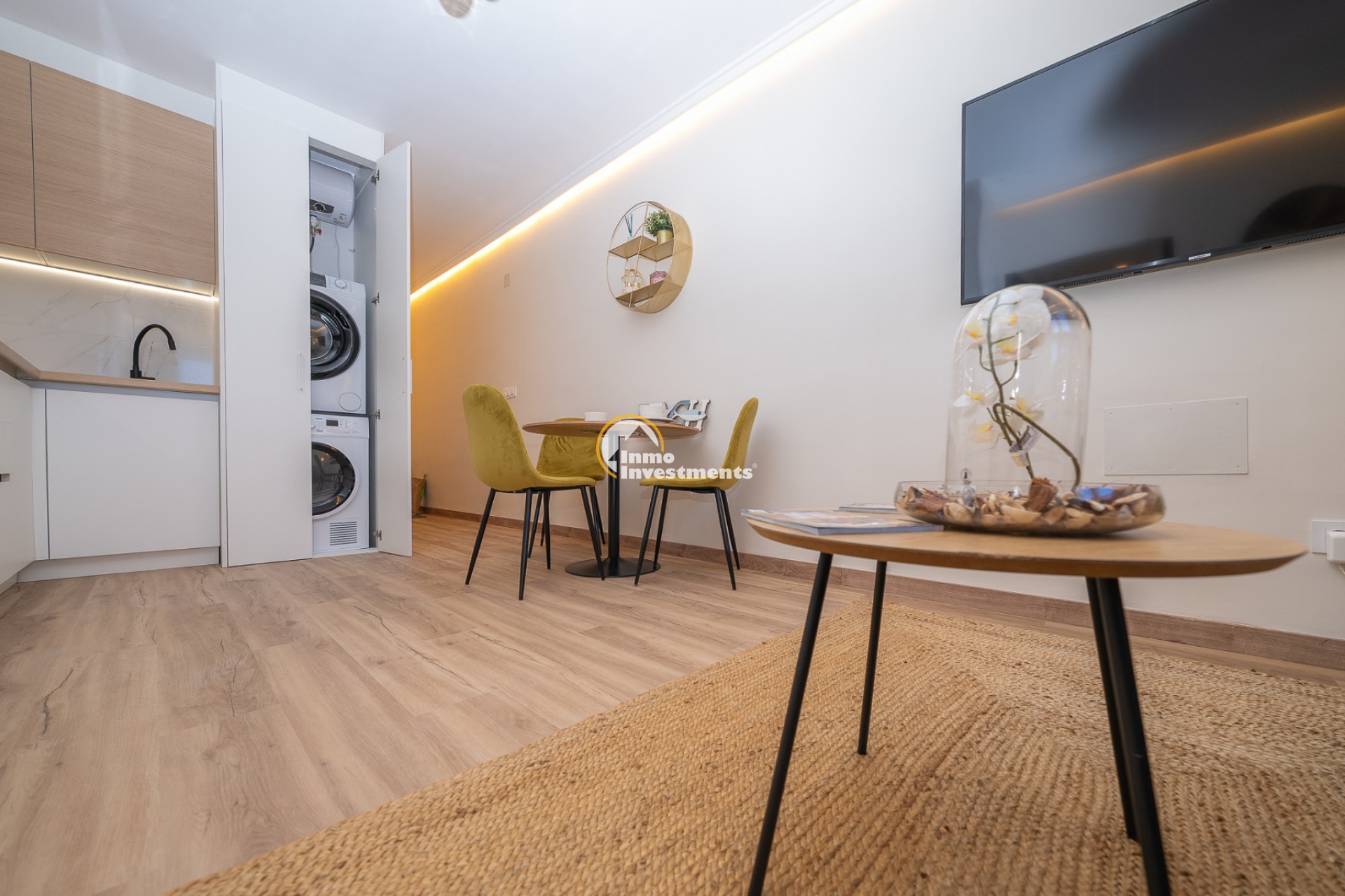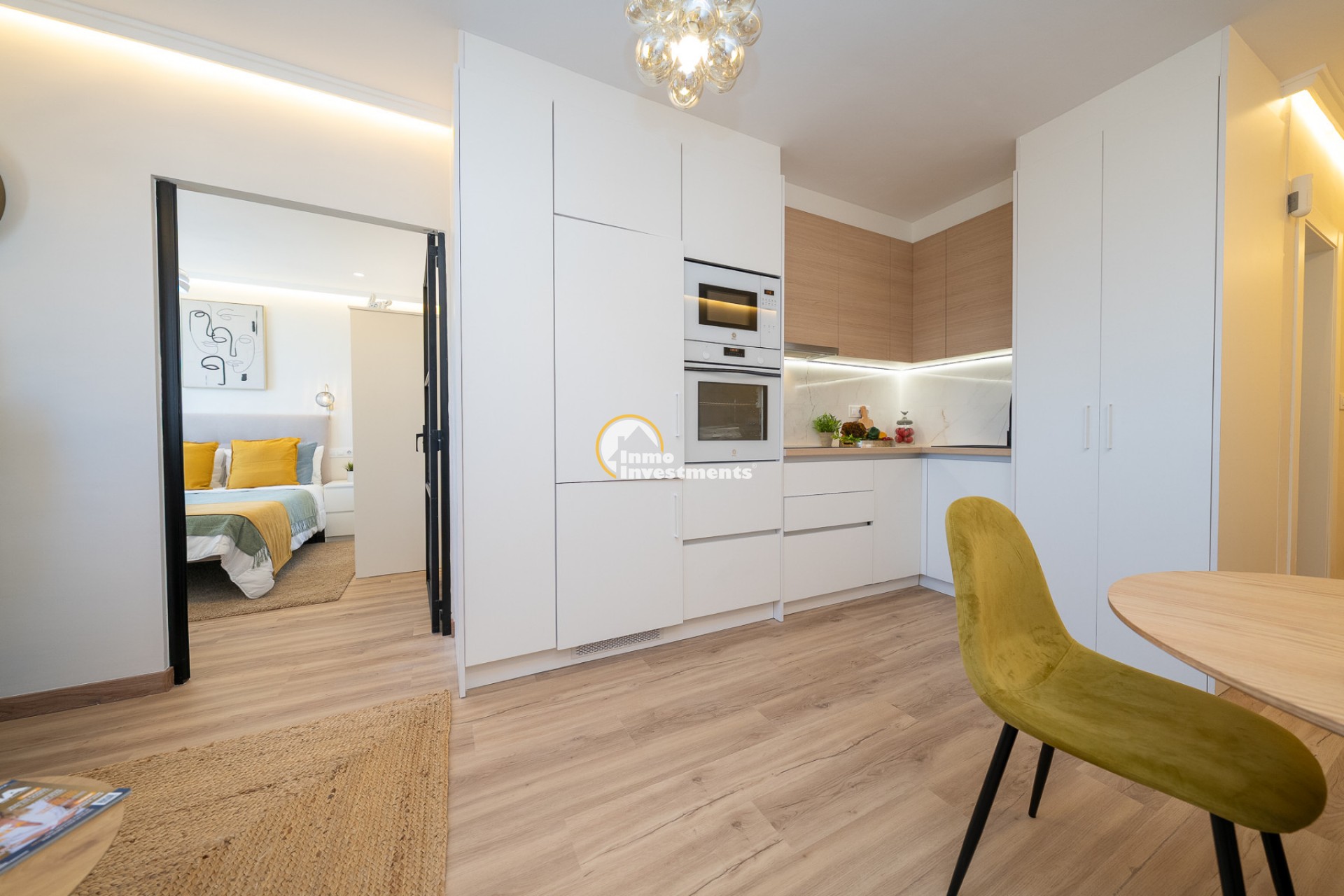 Lägenheten har ett ljust vardagsrum och matplats i öppen planlösning, som ansluter till ett fullt utrustat öppet kök med gott om förvaringsutrymme. Köket är utrustat med nya integrerade vitvaror av hög kvalitet, inklusive kyl/frys, diskmaskin, tvättmaskin och torktumlare.