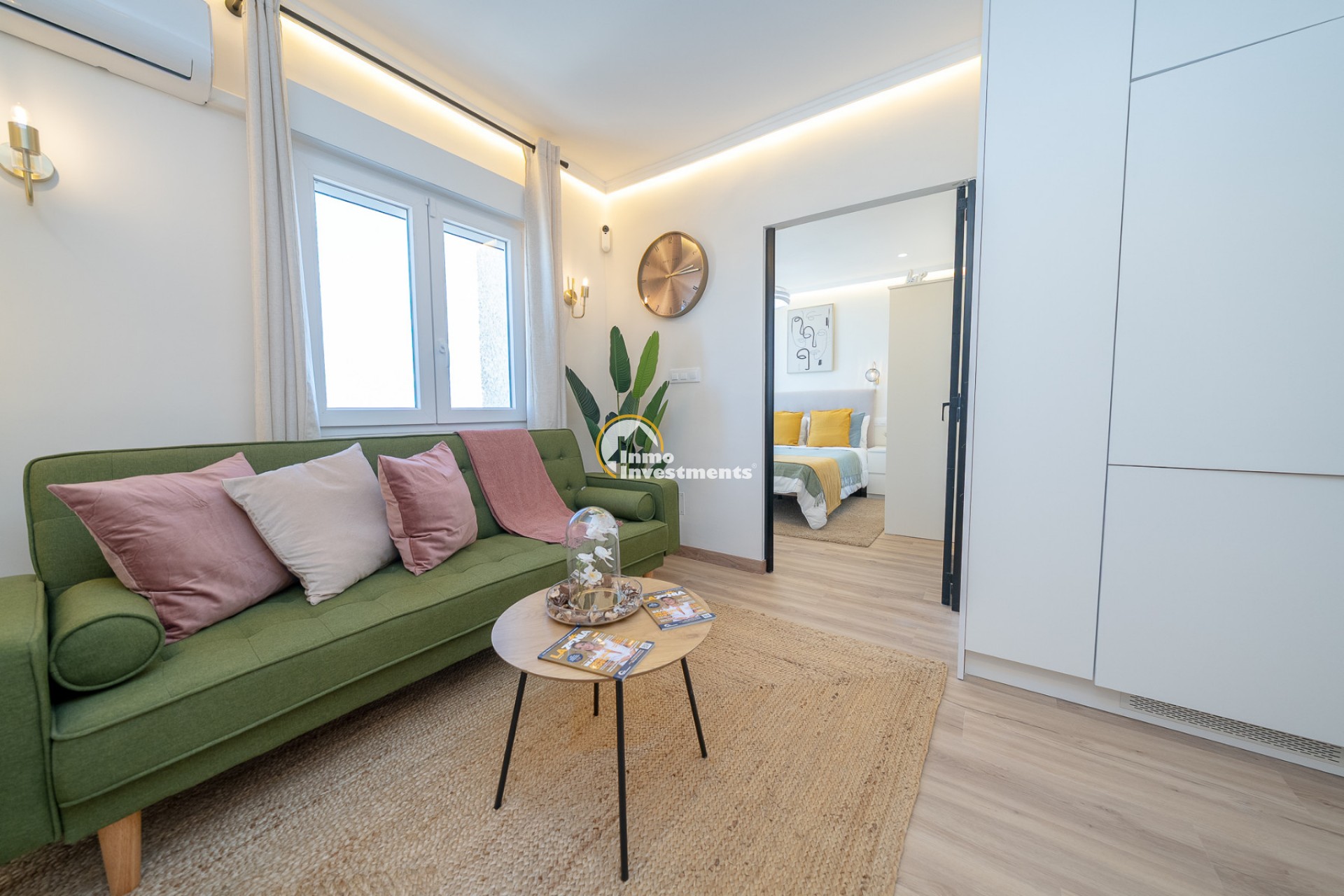 Det dubbelrum som utgör sovrummet har takfläkt med integrerad belysning, medan vardagsrummet är utrustat med luftkonditionering. Bostaden har även larmsystem och ett modernt badrum.