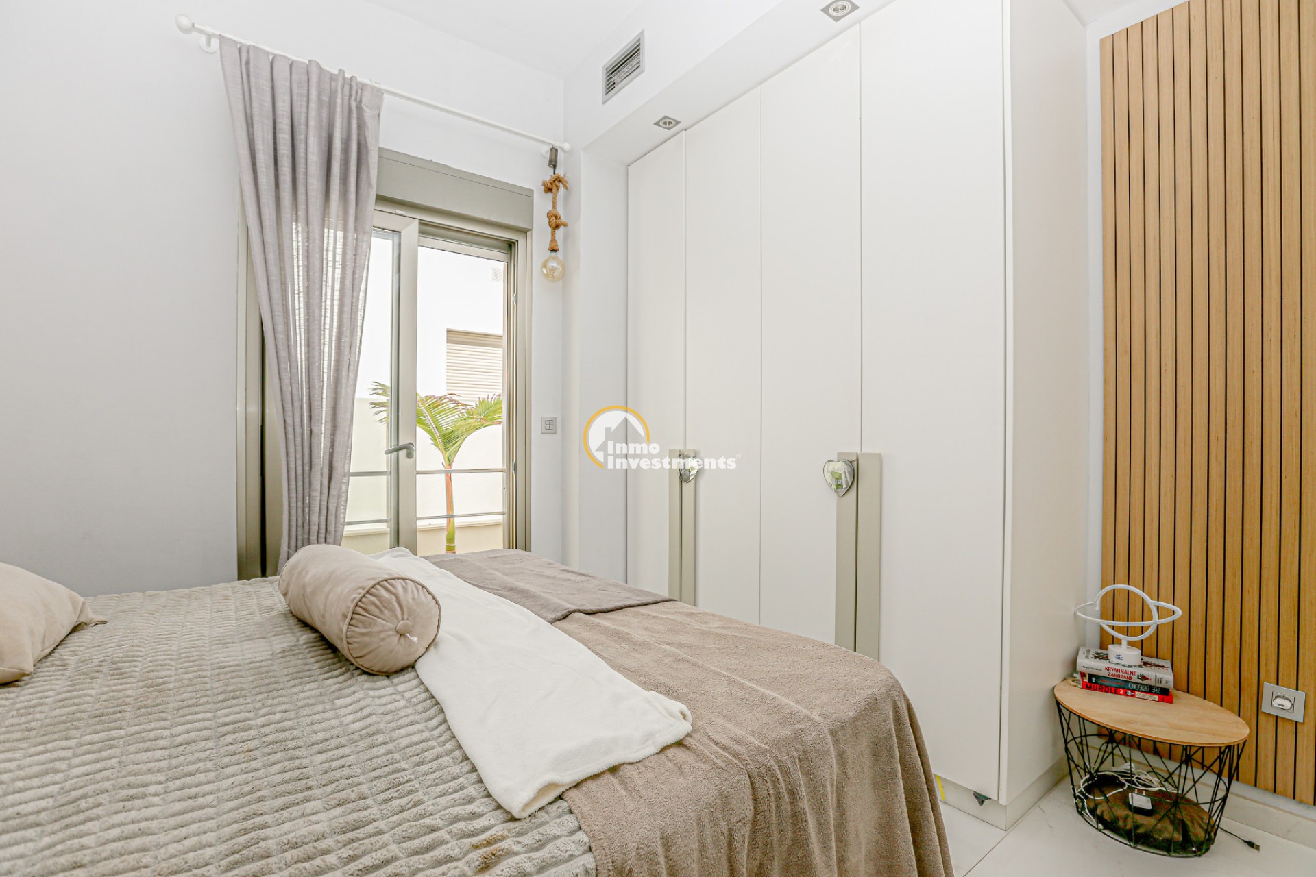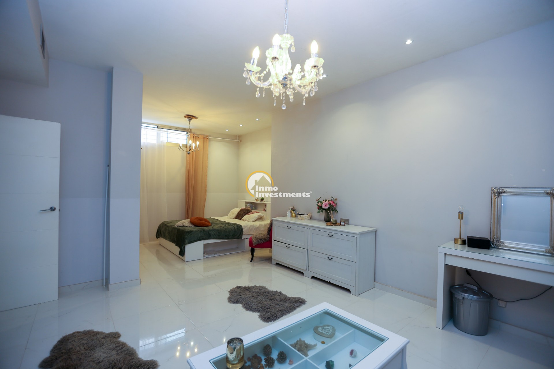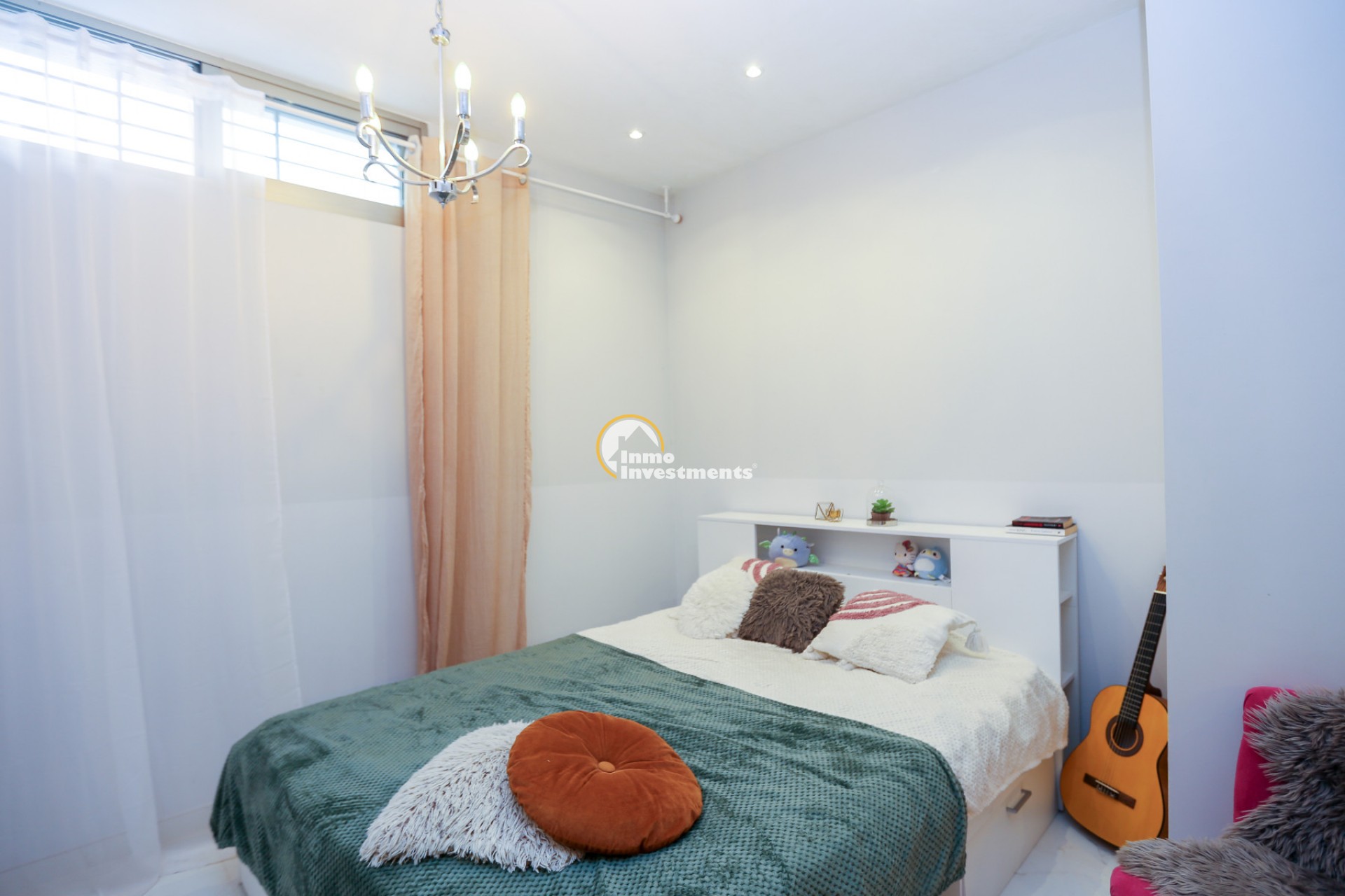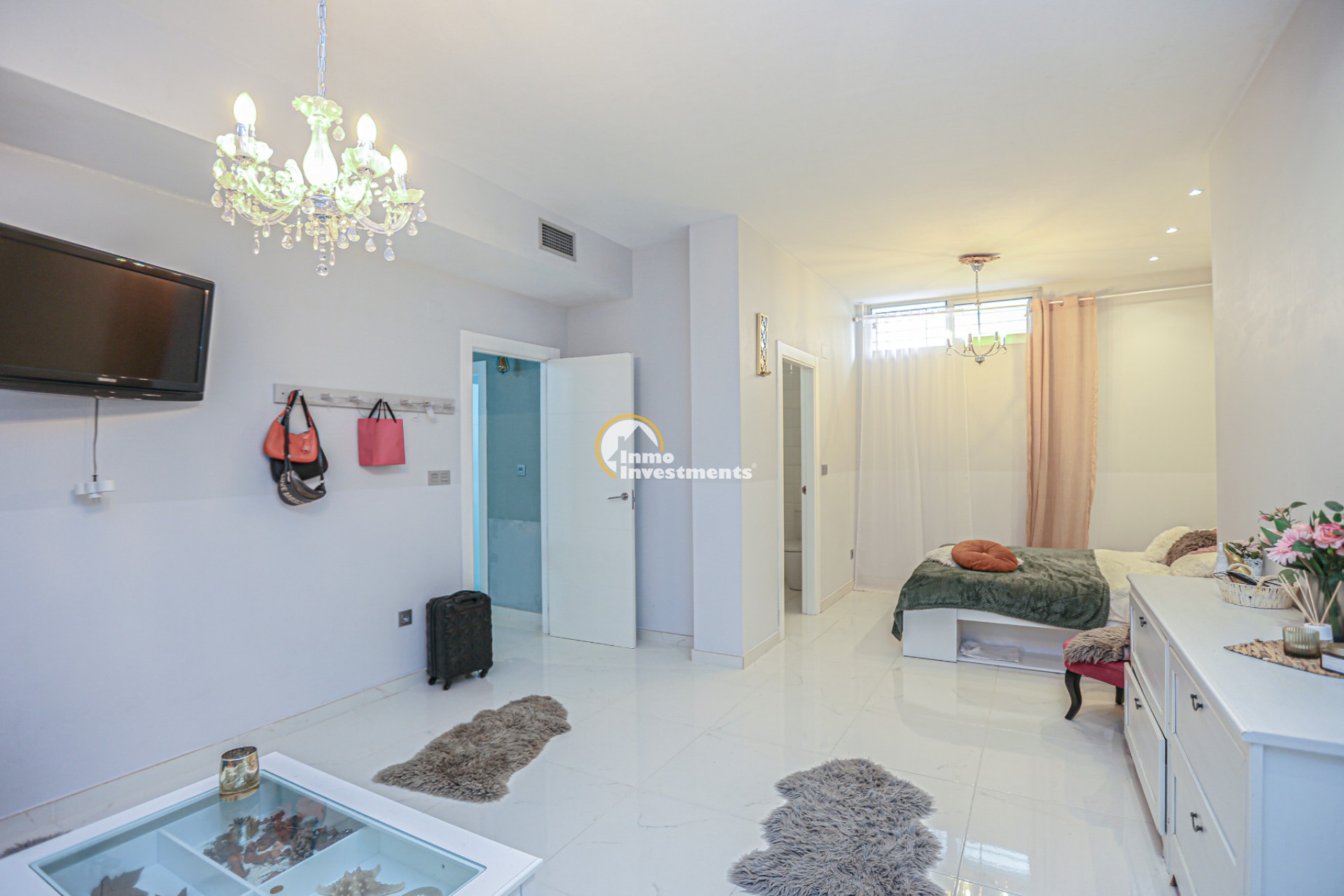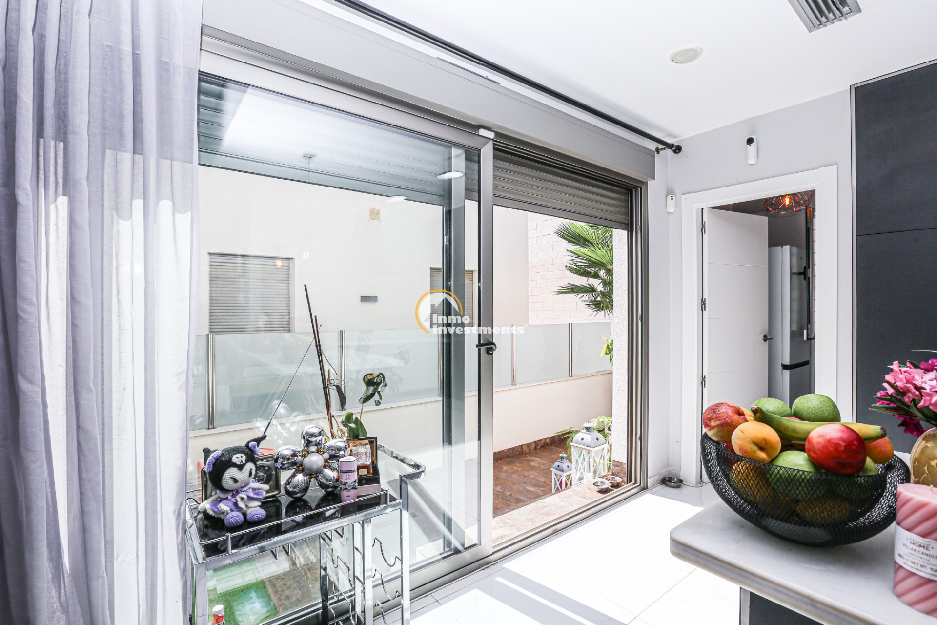 Inne leder en liten hall till det första sovrummet med eget badrum och utgång till trädgården. Till vänster finns det ljusa och rymliga vardagsrummet/matsalen, kopplat till ett modernt fullt utrustat kök med frukostbar och direkt utgång till tomten. En annan hall förbinder ytterligare två sovrum samt ett badrum. Alla fönster har elektriska persienner.