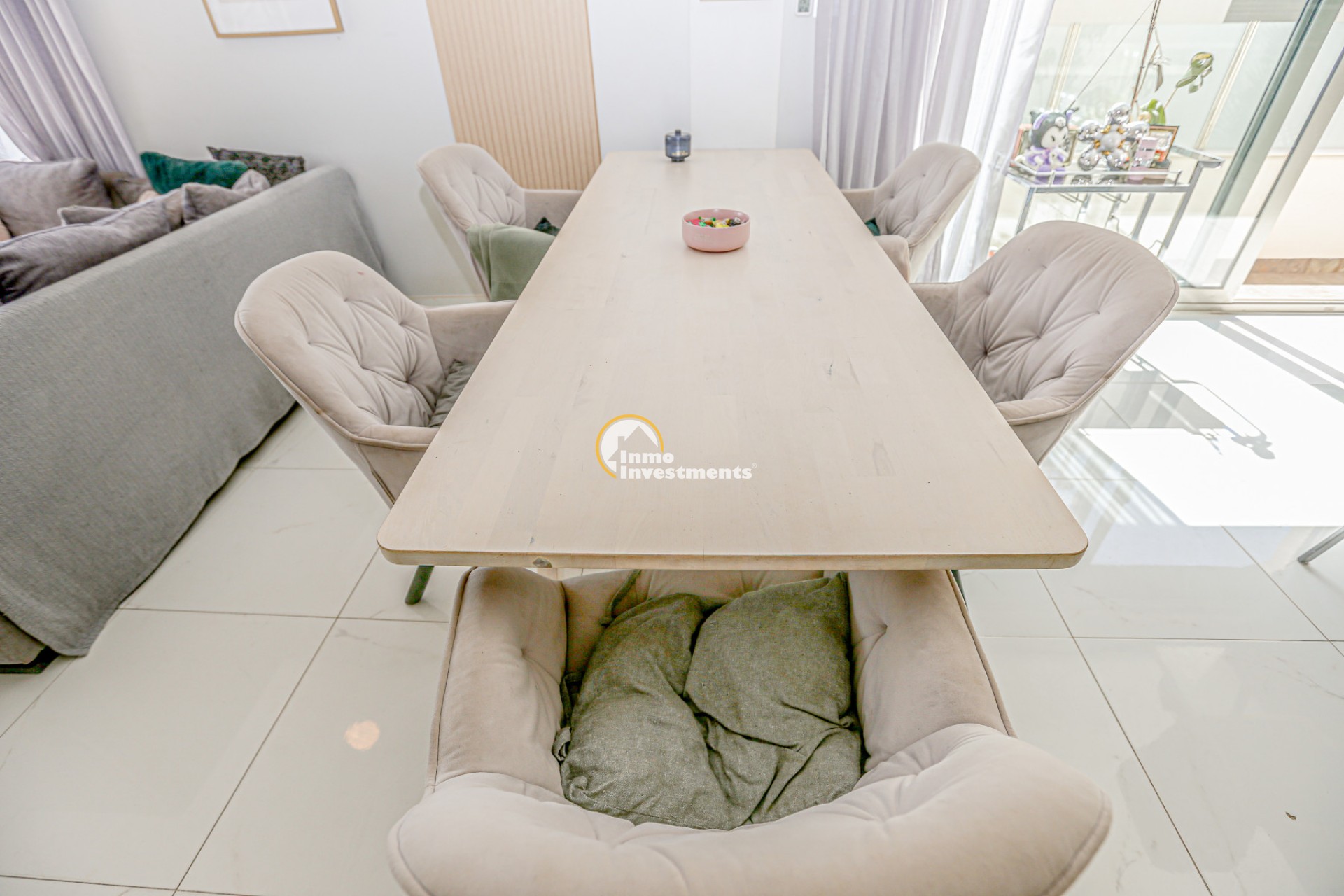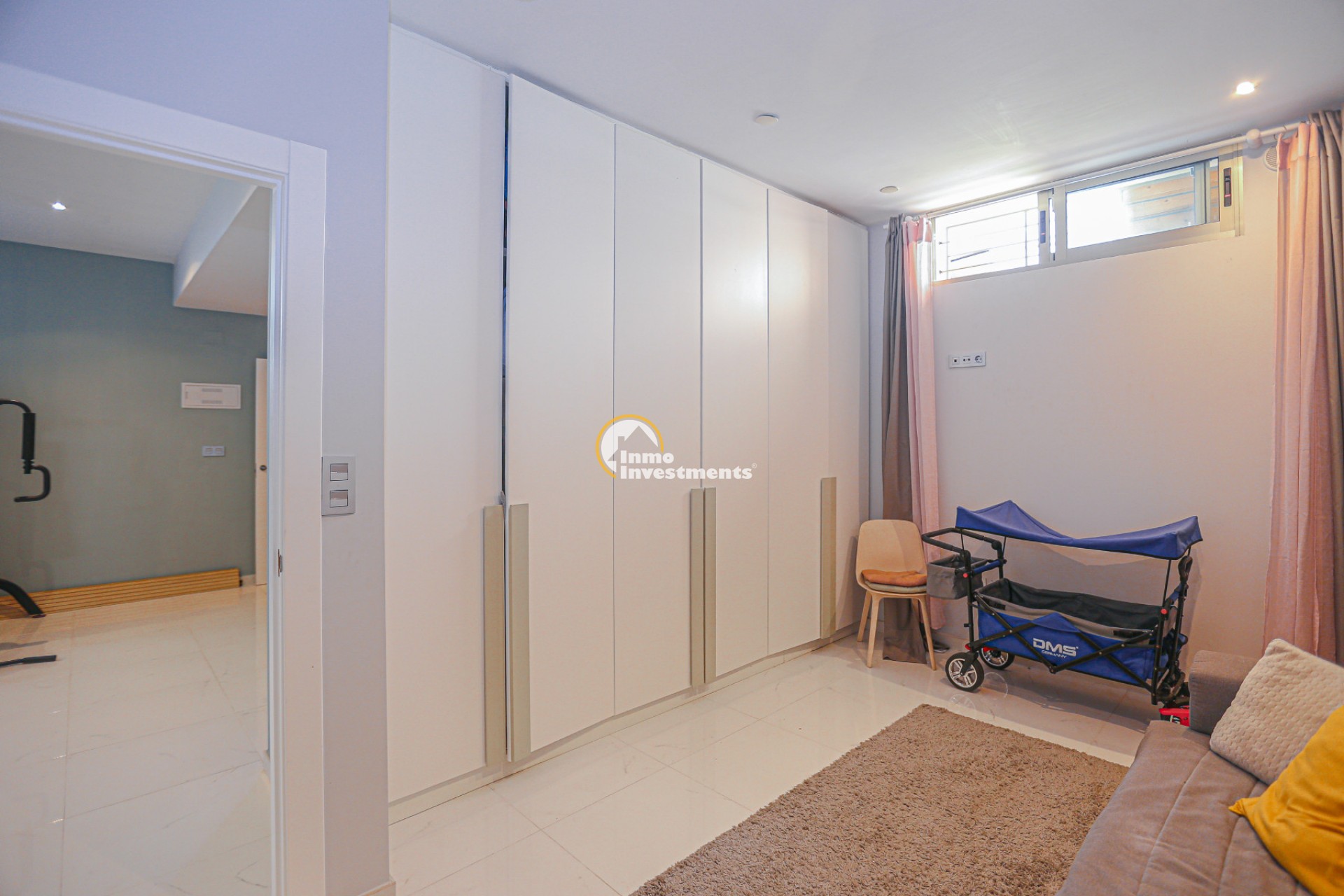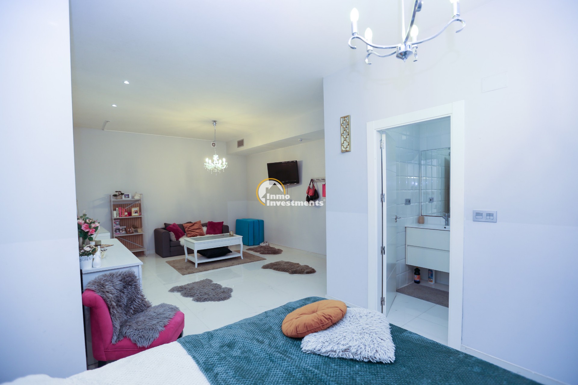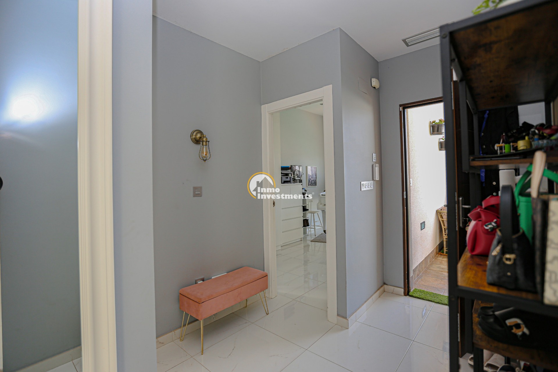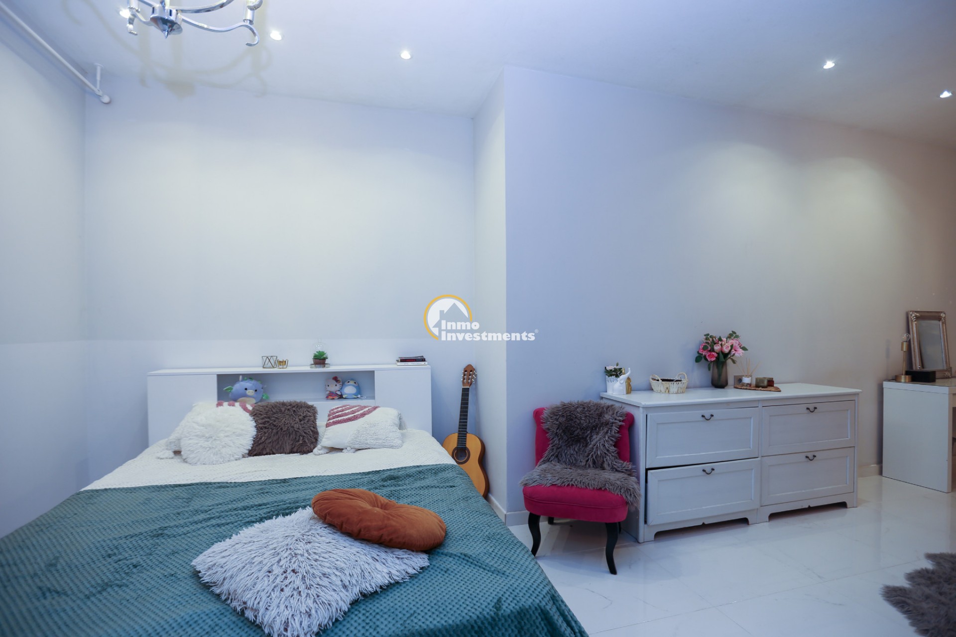 Inne leder en liten hall till det första sovrummet med eget badrum och utgång till trädgården. Till vänster finns det ljusa och rymliga vardagsrummet/matsalen, kopplat till ett modernt fullt utrustat kök med frukostbar och direkt utgång till tomten. En annan hall förbinder ytterligare två sovrum samt ett badrum. Alla fönster har elektriska persienner.