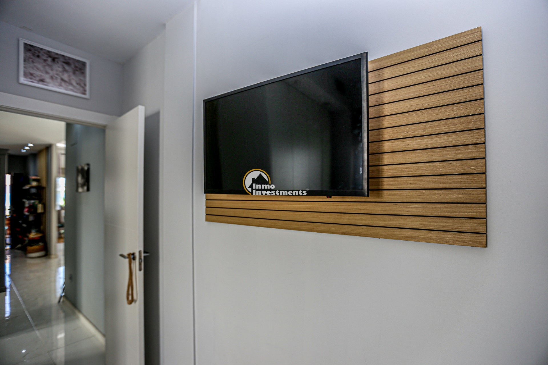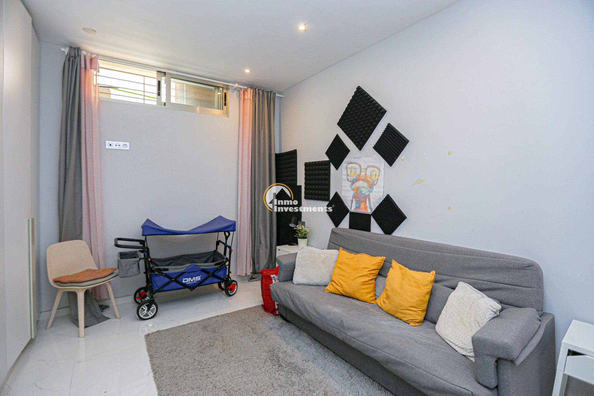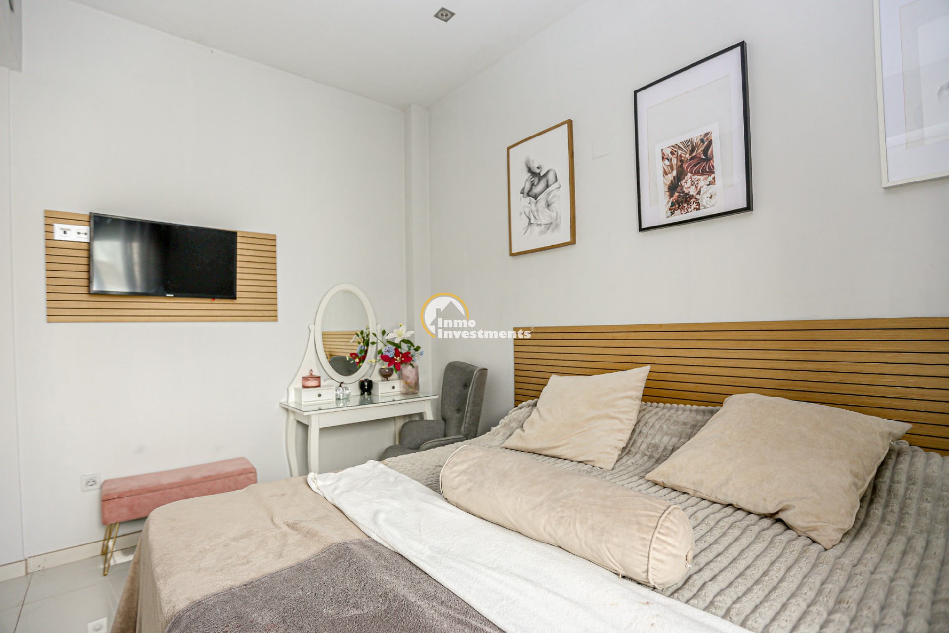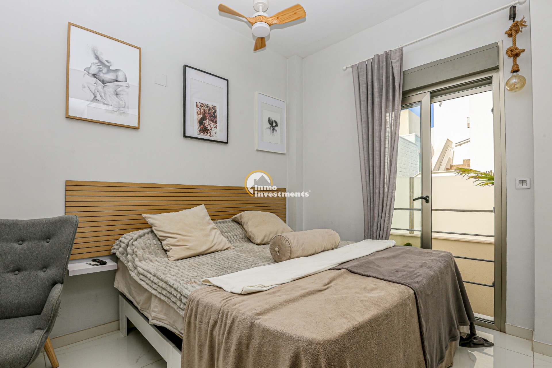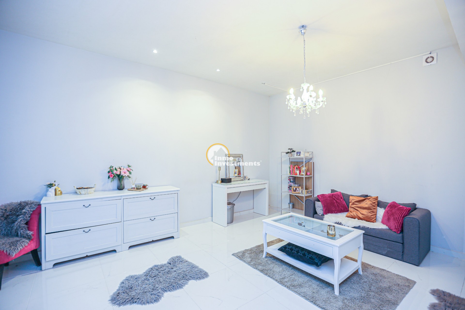 Inne leder en liten hall till det första sovrummet med eget badrum och utgång till trädgården. Till vänster finns det ljusa och rymliga vardagsrummet/matsalen, kopplat till ett modernt fullt utrustat kök med frukostbar och direkt utgång till tomten. En annan hall förbinder ytterligare två sovrum samt ett badrum. Alla fönster har elektriska persienner.