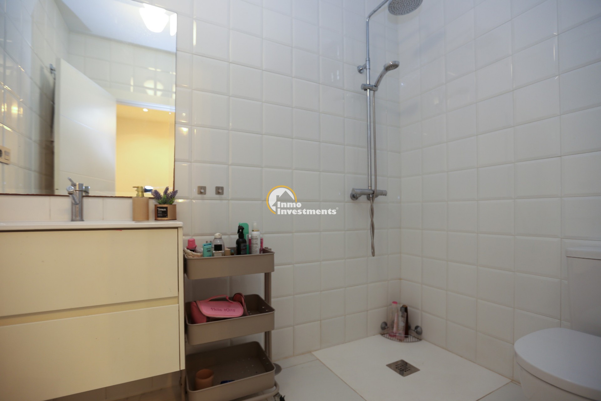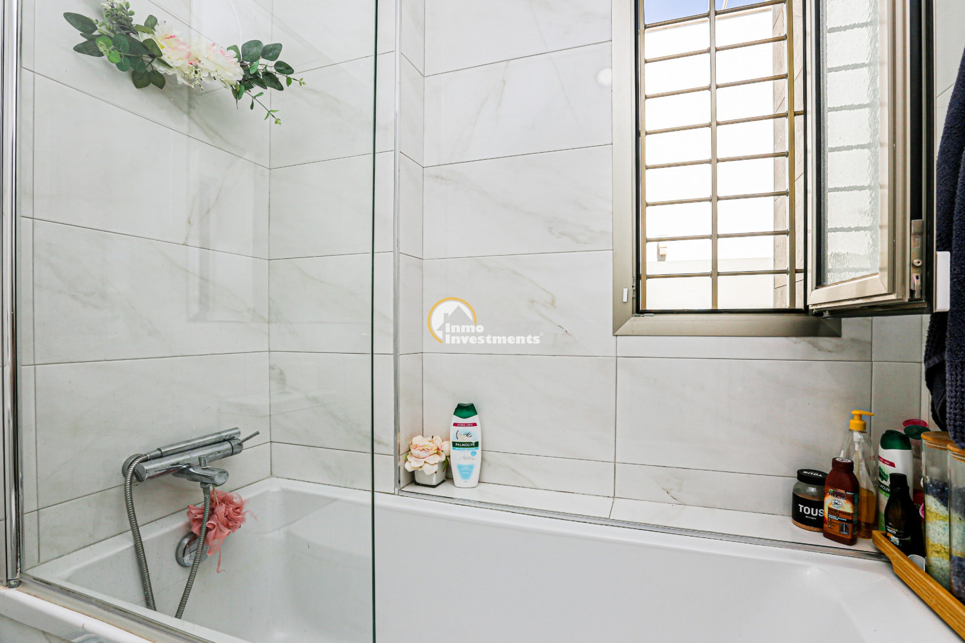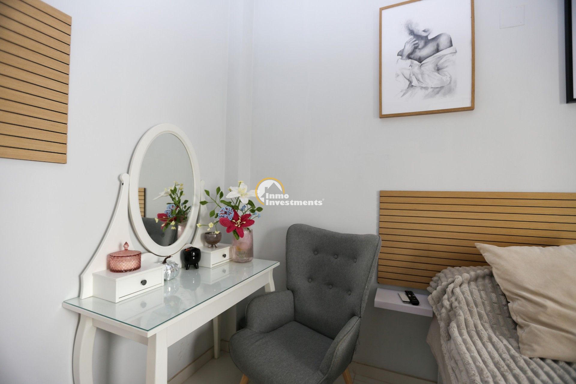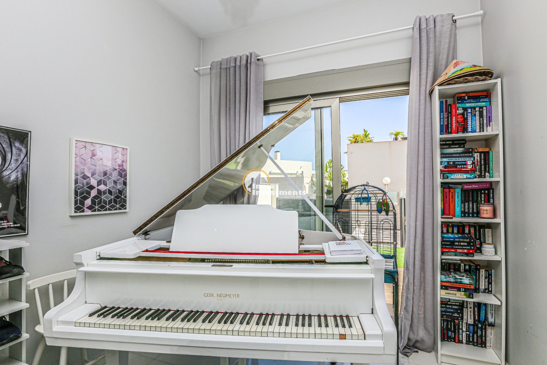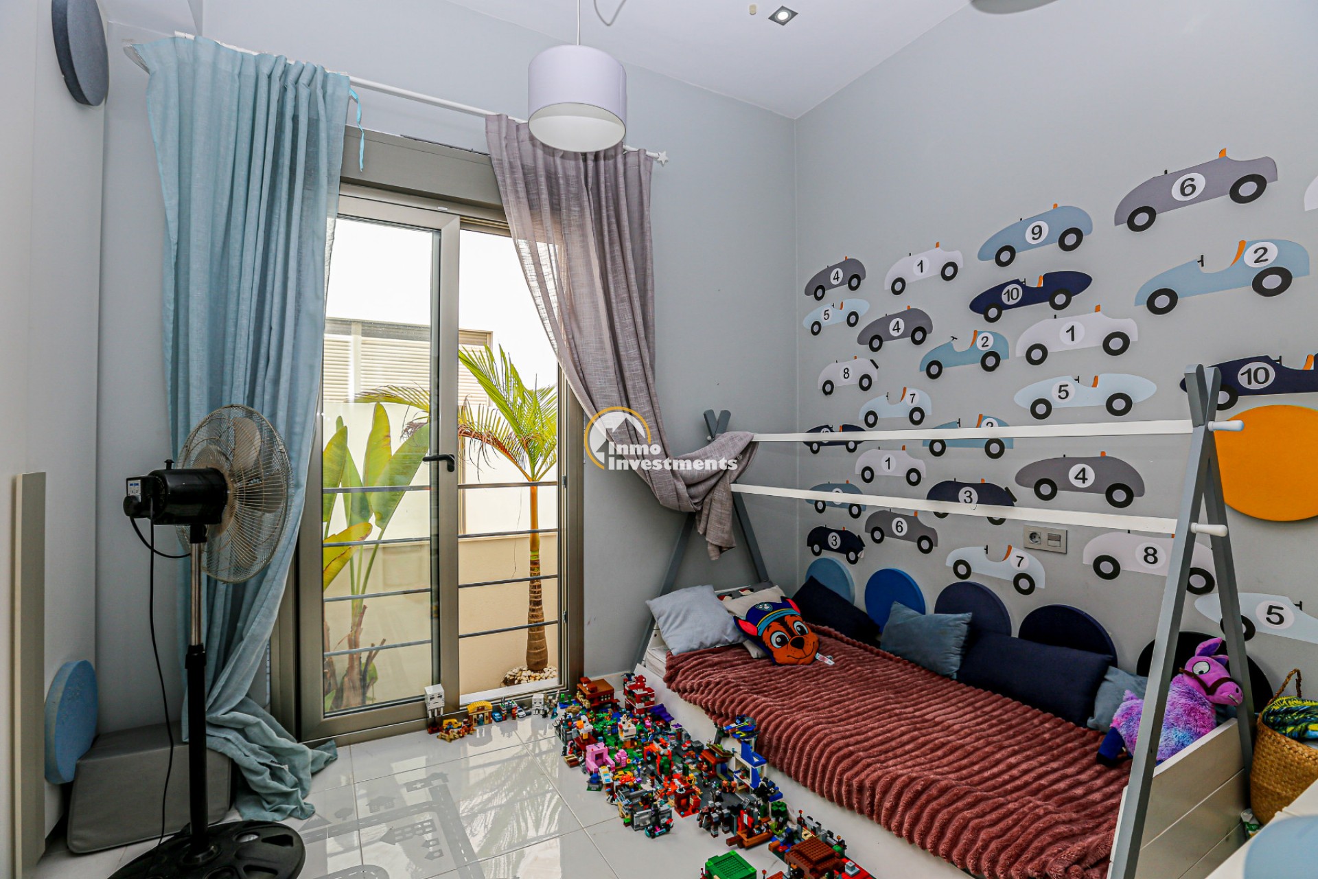 Inne leder en liten hall till det första sovrummet med eget badrum och utgång till trädgården. Till vänster finns det ljusa och rymliga vardagsrummet/matsalen, kopplat till ett modernt fullt utrustat kök med frukostbar och direkt utgång till tomten. En annan hall förbinder ytterligare två sovrum samt ett badrum. Alla fönster har elektriska persienner.