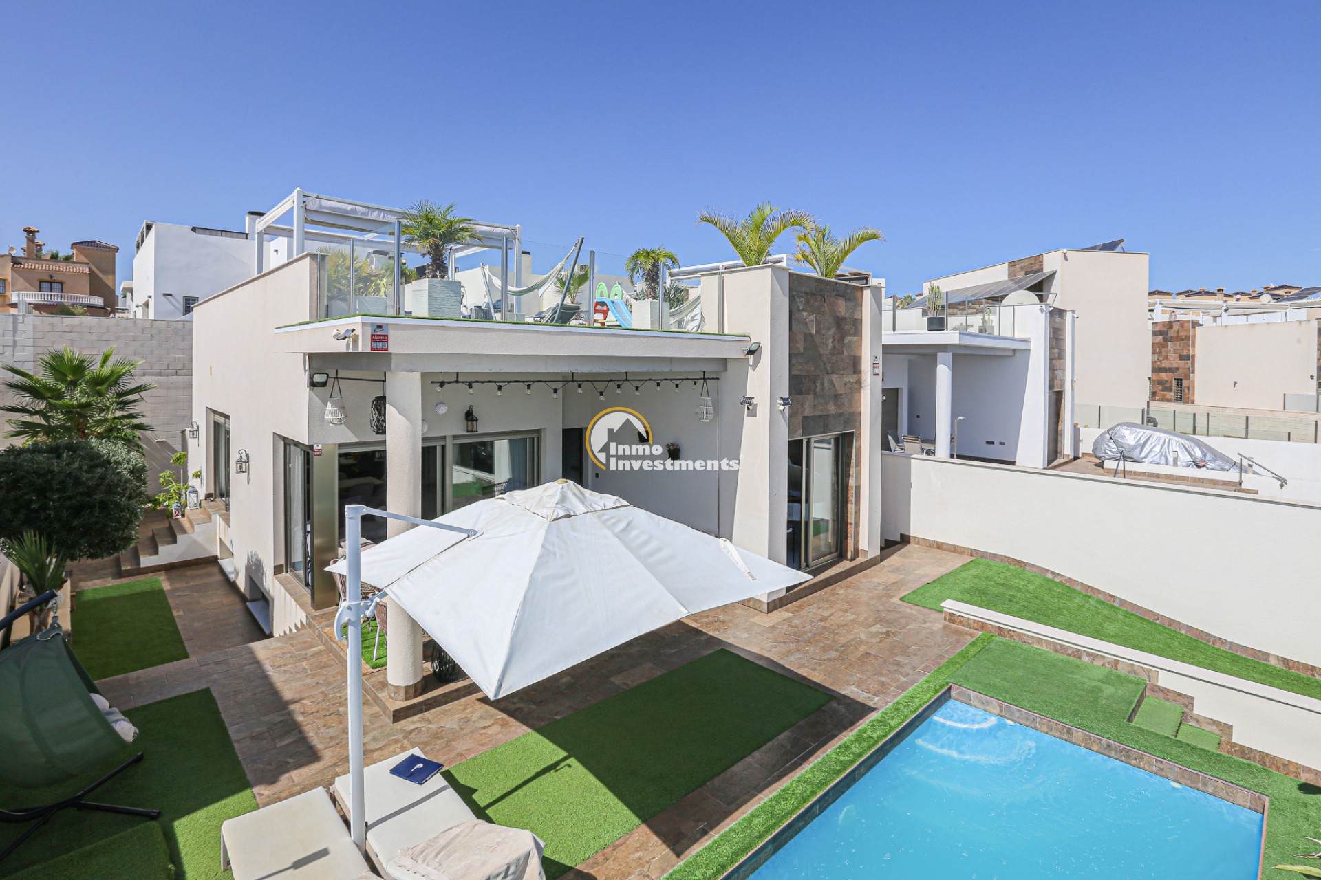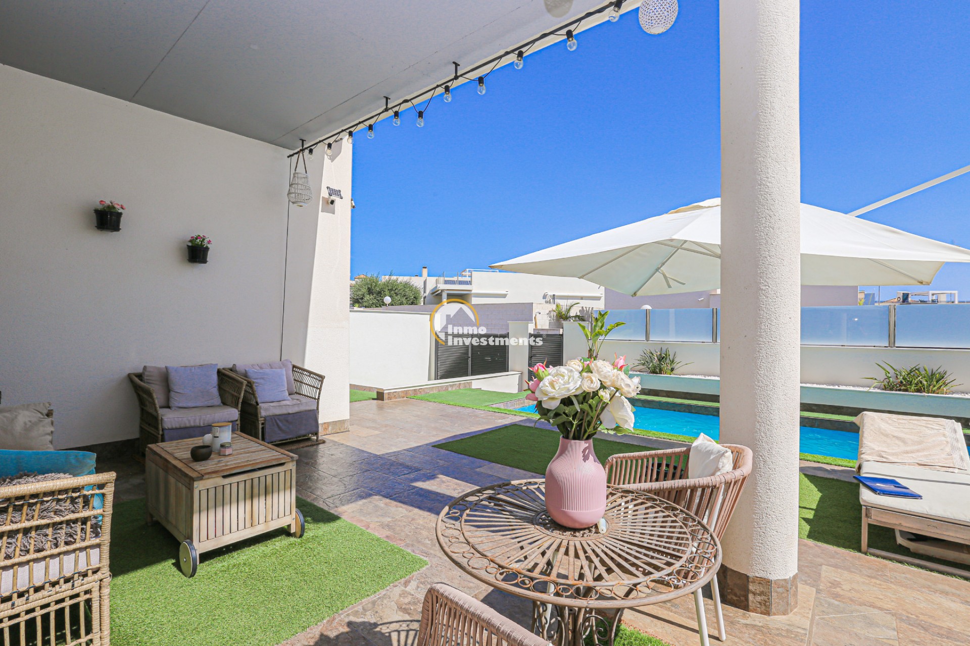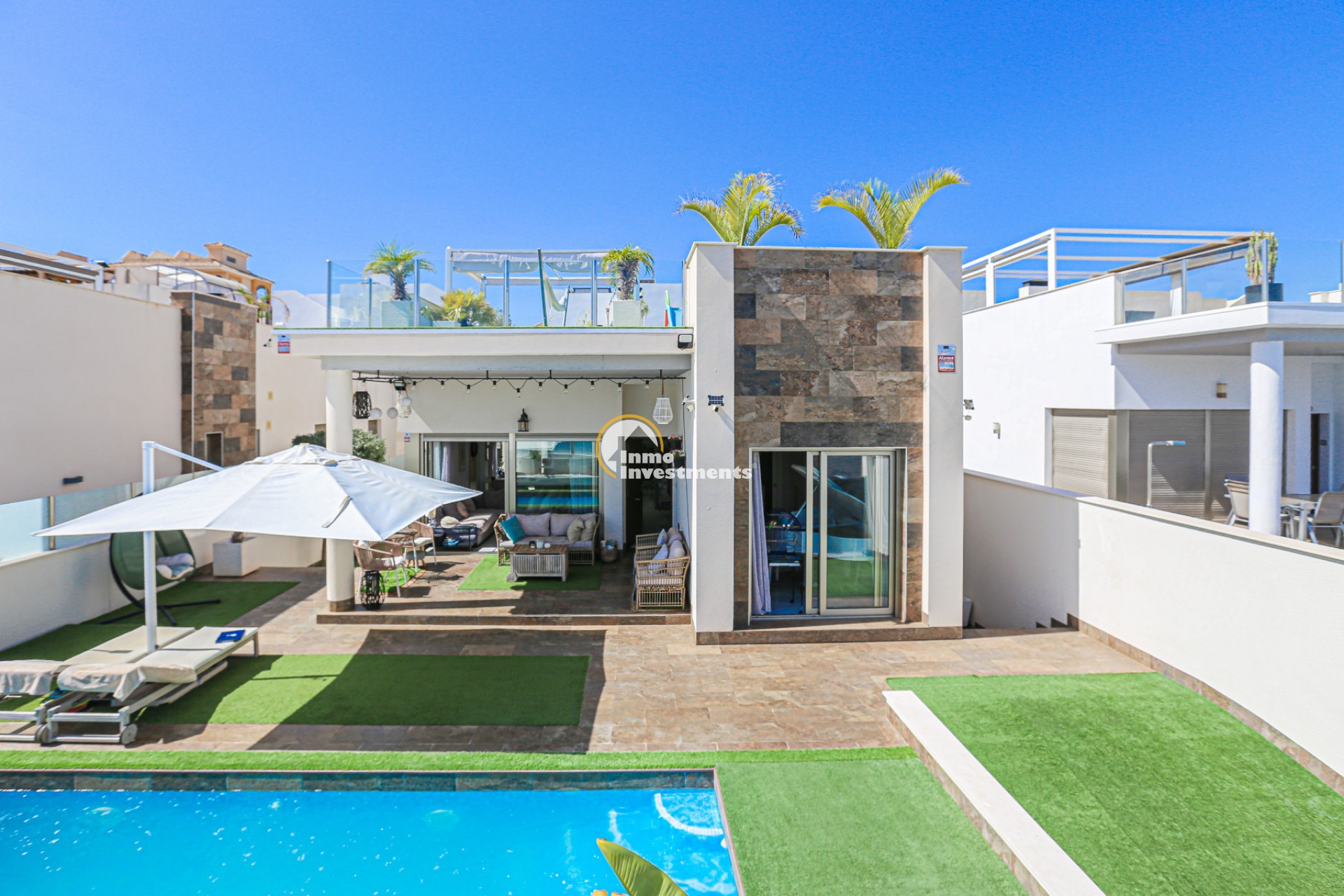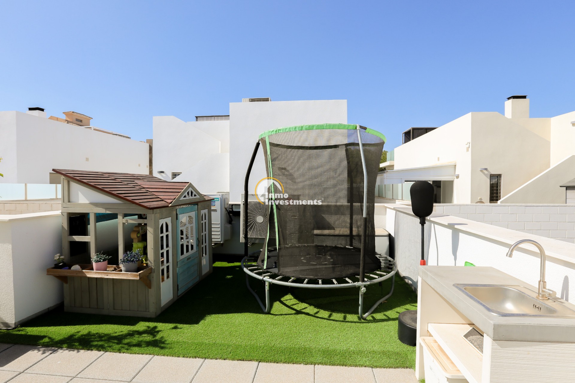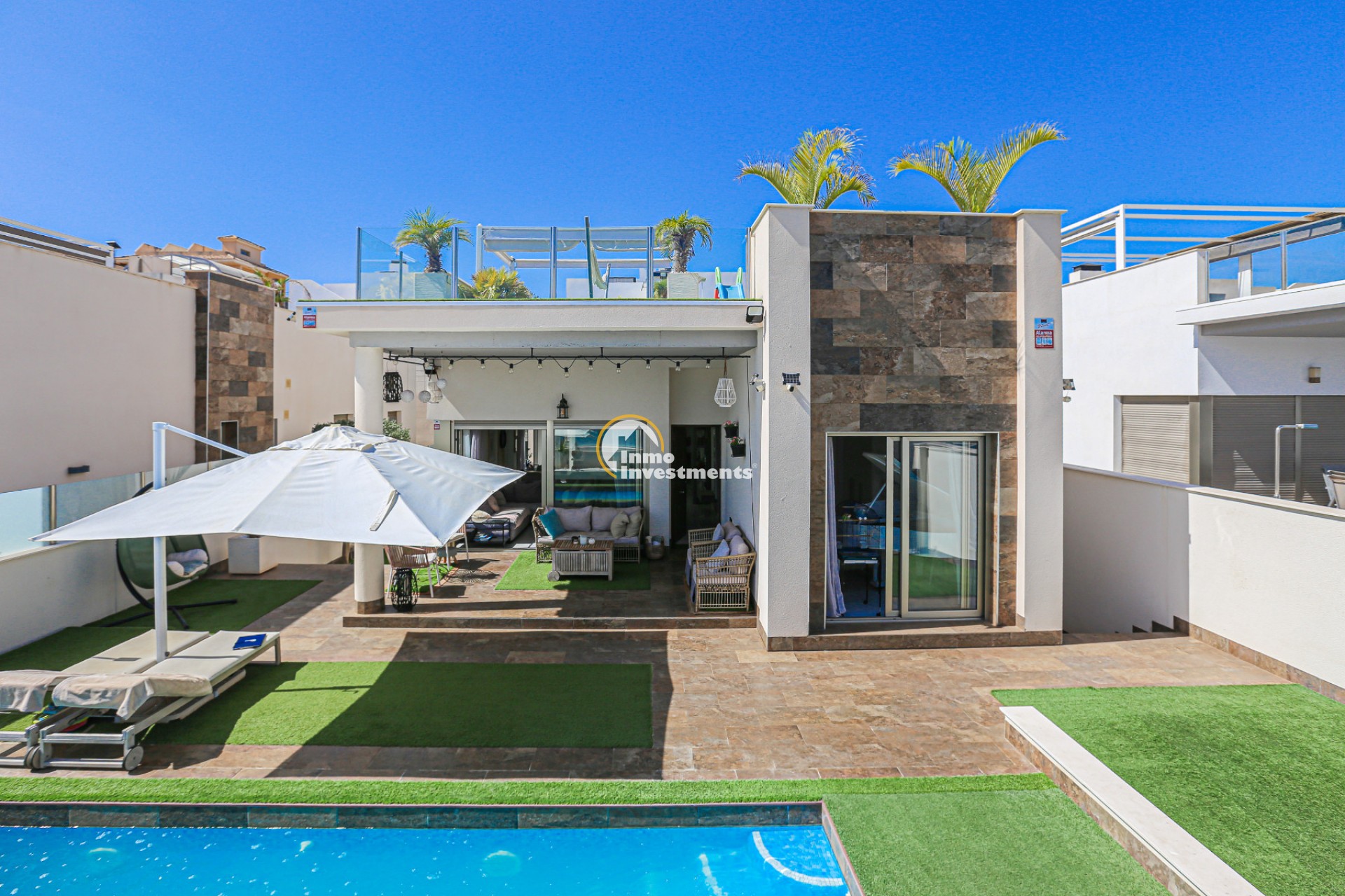 Den rymliga och lättskötta tomten har flera ytor med konstgräs, en privat pool och ett stort solarium – perfekt för att njuta av Medelhavets solsken året runt. På takterrassen finns ett praktiskt handfat och möjlighet att bygga en fullt utrustad sommarkök. Ett markis gör det möjligt att äta frukost, lunch eller middag utomhus med familj och vänner. Framför huvudentrén finns dessutom en täckta veranda.