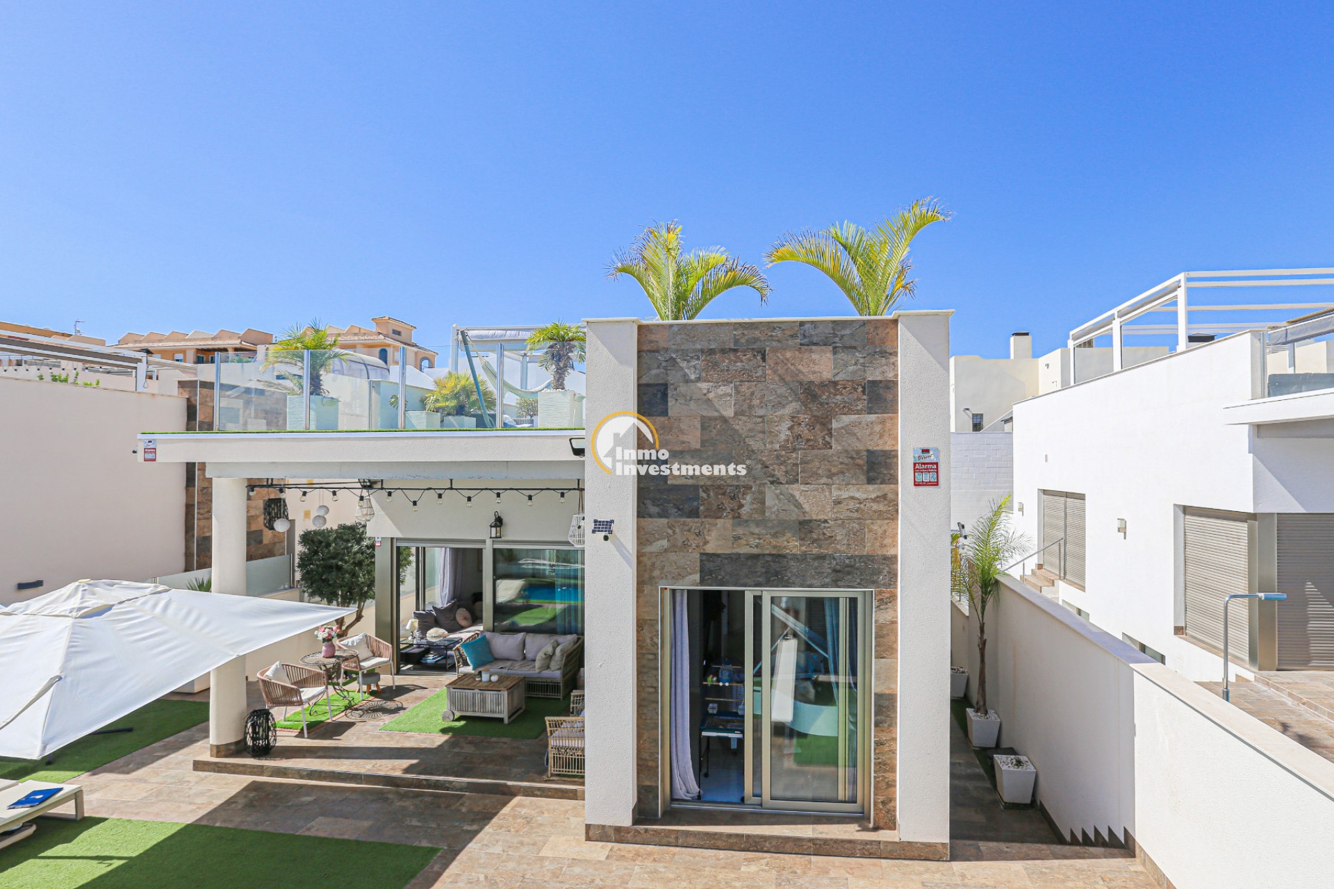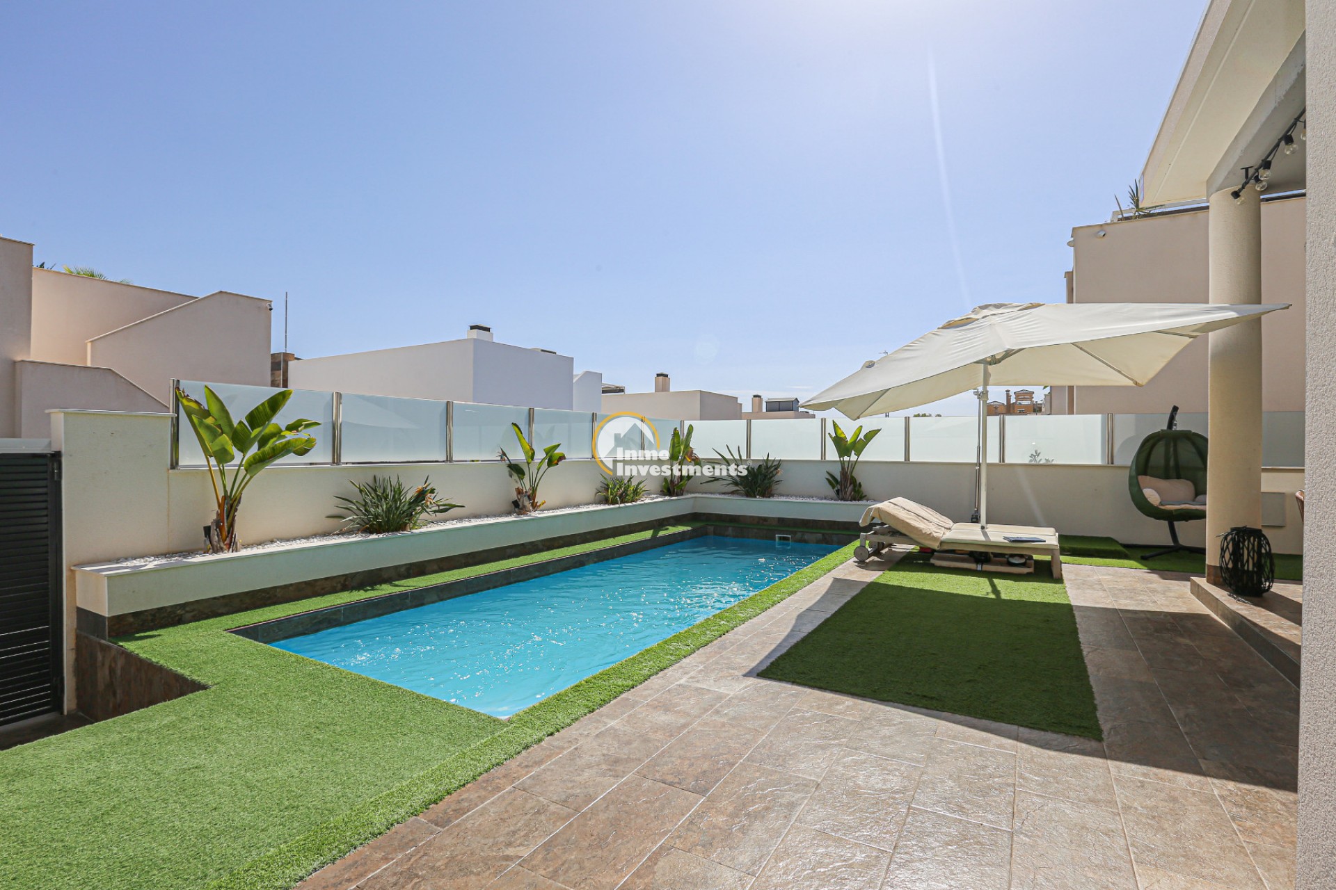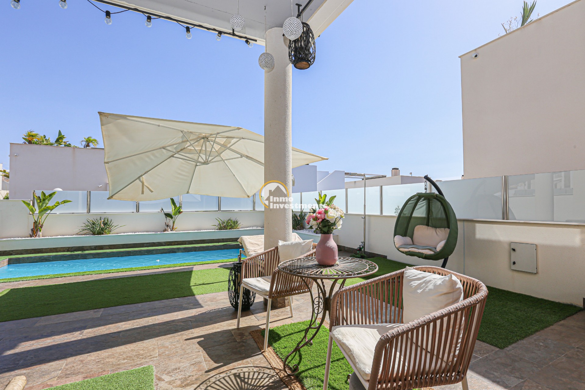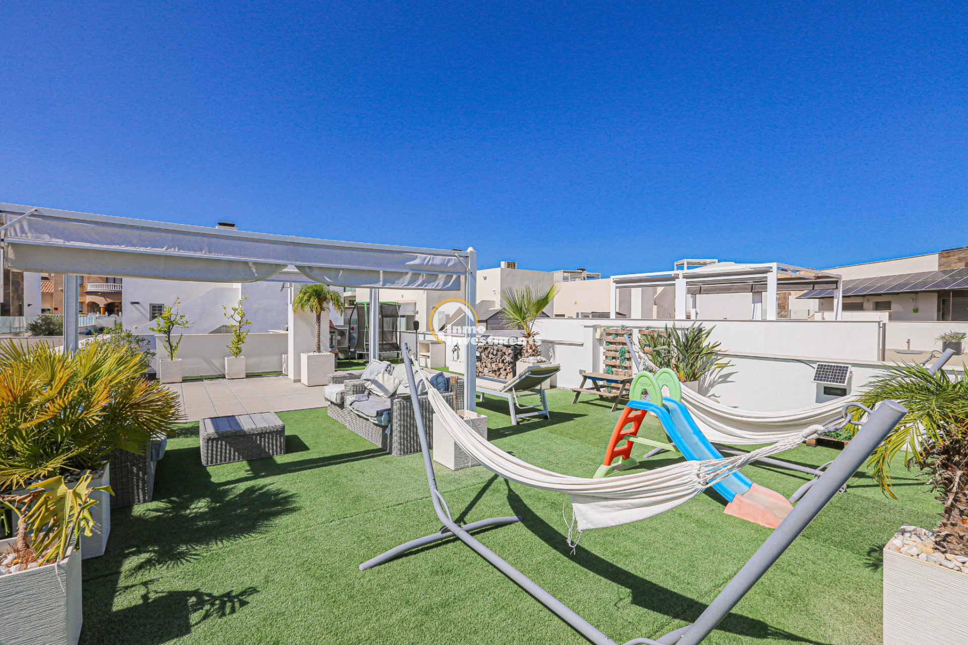 Den rymliga och lättskötta tomten har flera ytor med konstgräs, en privat pool och ett stort solarium – perfekt för att njuta av Medelhavets solsken året runt. På takterrassen finns ett praktiskt handfat och möjlighet att bygga en fullt utrustad sommarkök. Ett markis gör det möjligt att äta frukost, lunch eller middag utomhus med familj och vänner. Framför huvudentrén finns dessutom en täckta veranda.