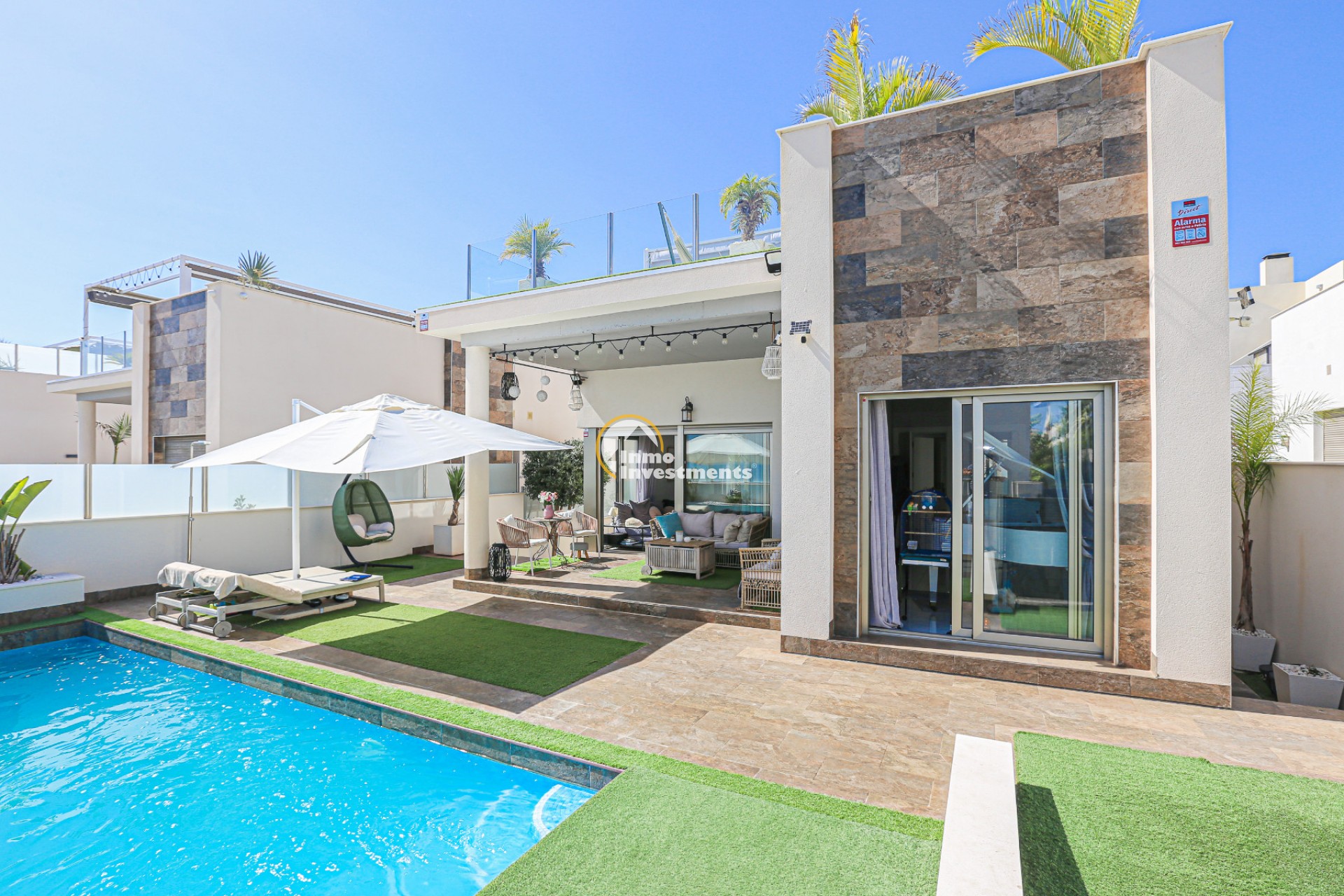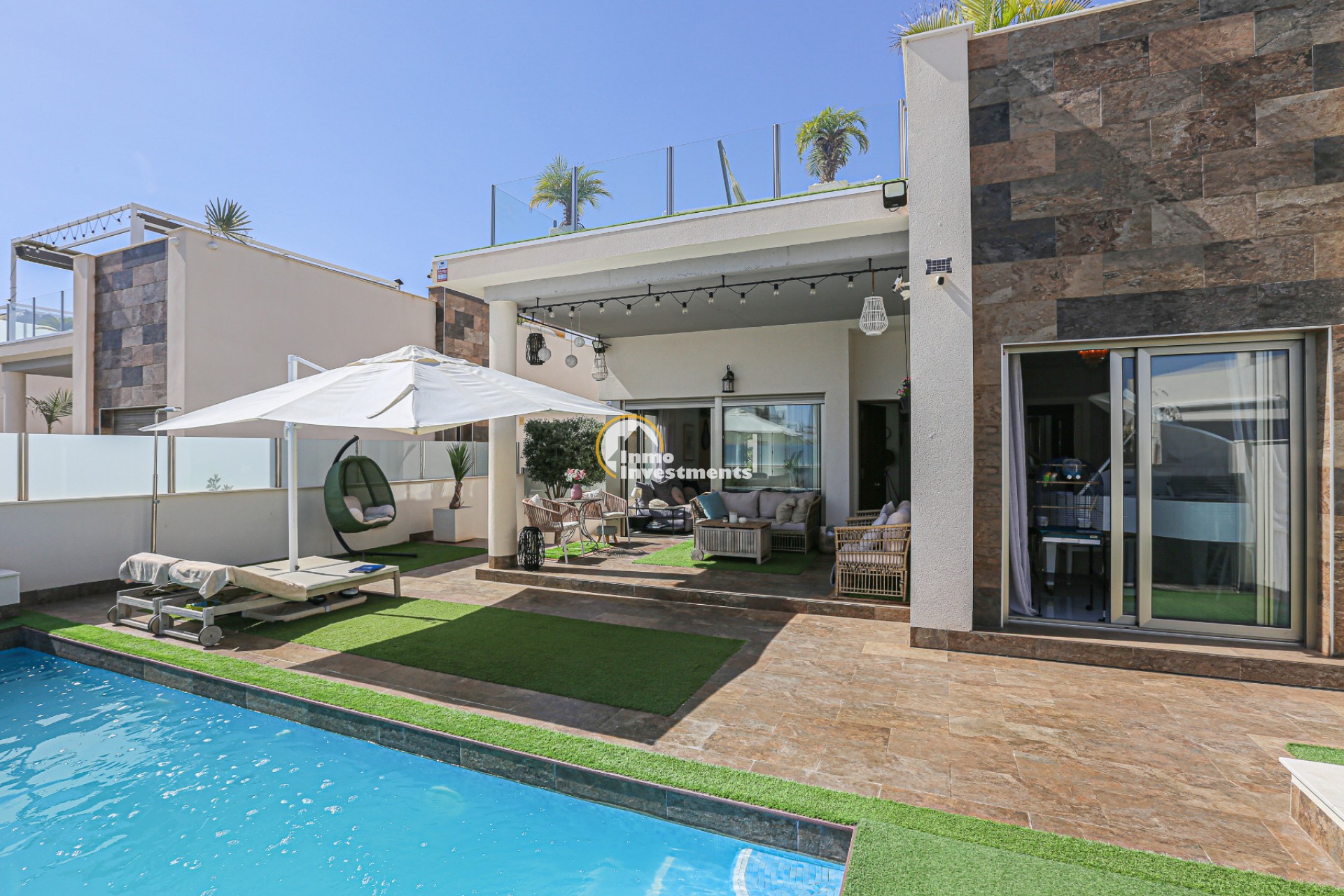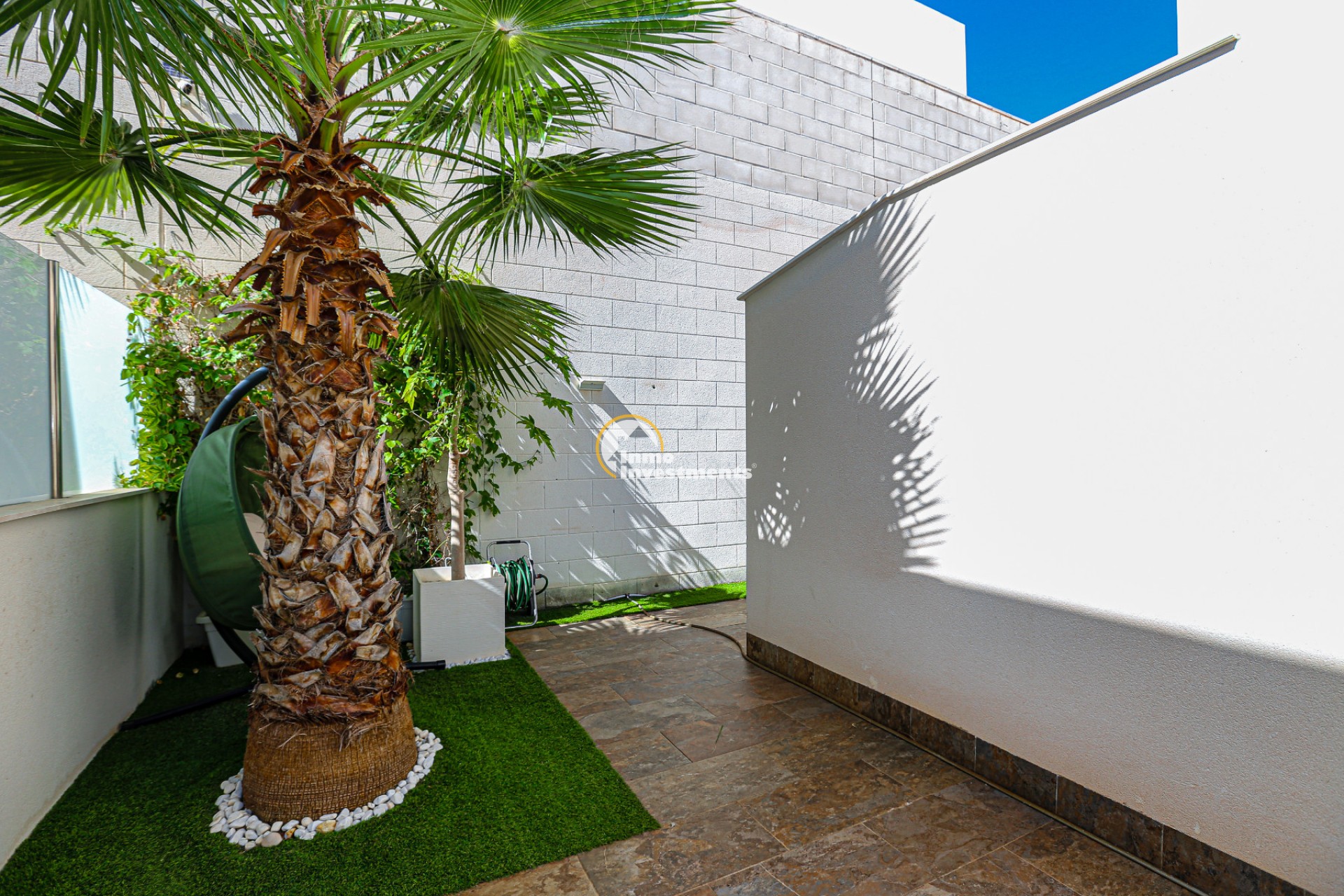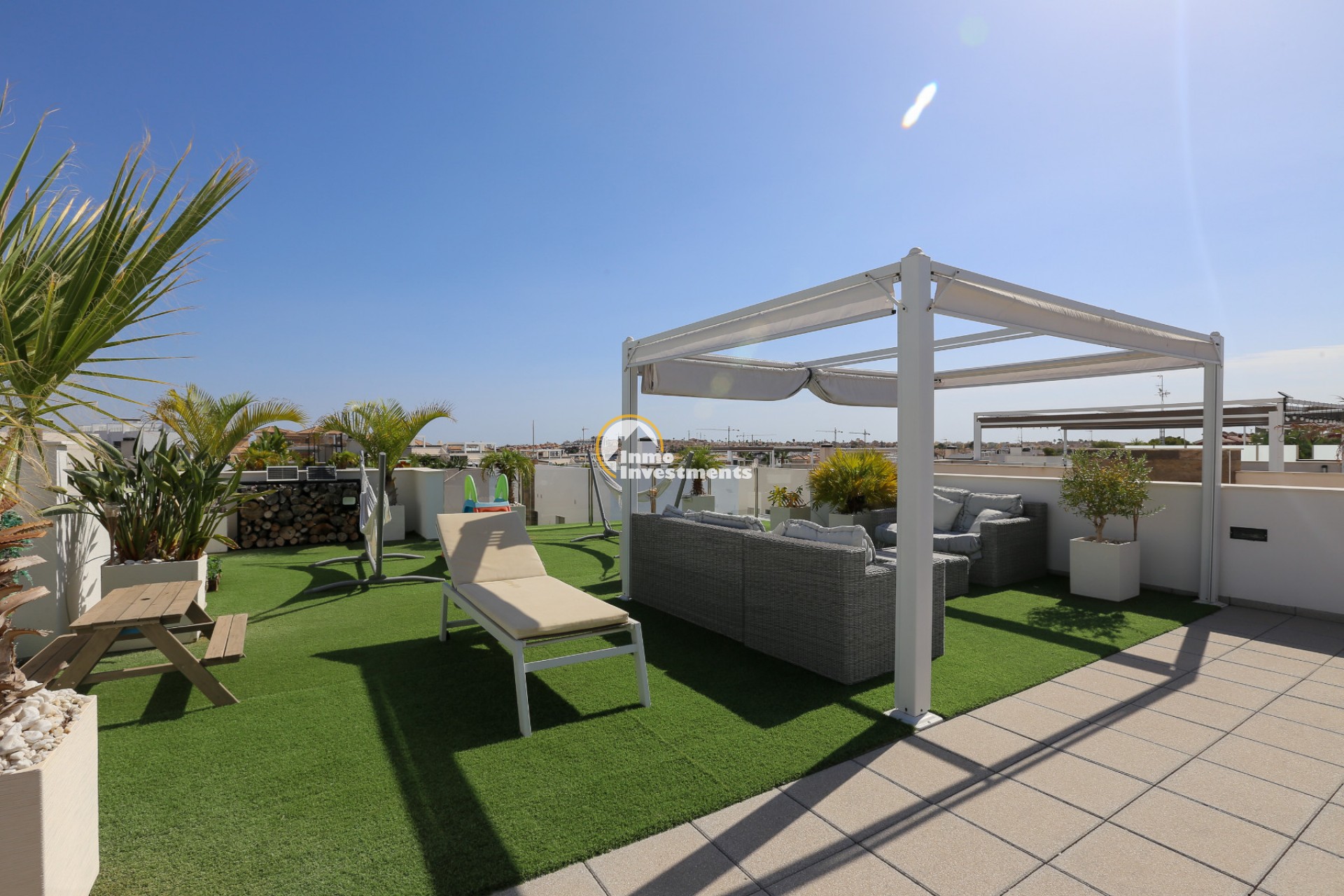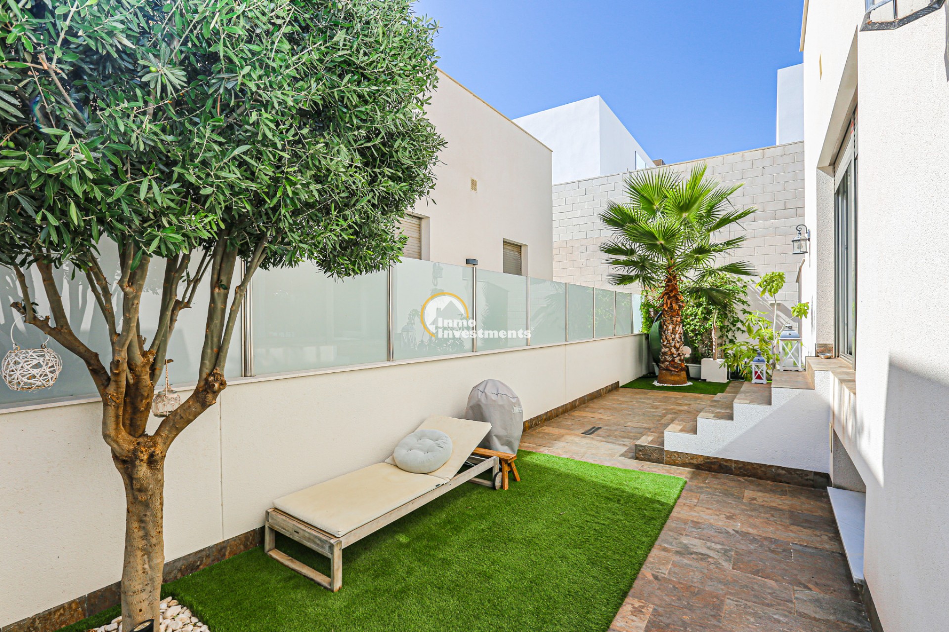 Den rymliga och lättskötta tomten har flera ytor med konstgräs, en privat pool och ett stort solarium – perfekt för att njuta av Medelhavets solsken året runt. På takterrassen finns ett praktiskt handfat och möjlighet att bygga en fullt utrustad sommarkök. Ett markis gör det möjligt att äta frukost, lunch eller middag utomhus med familj och vänner. Framför huvudentrén finns dessutom en täckta veranda.