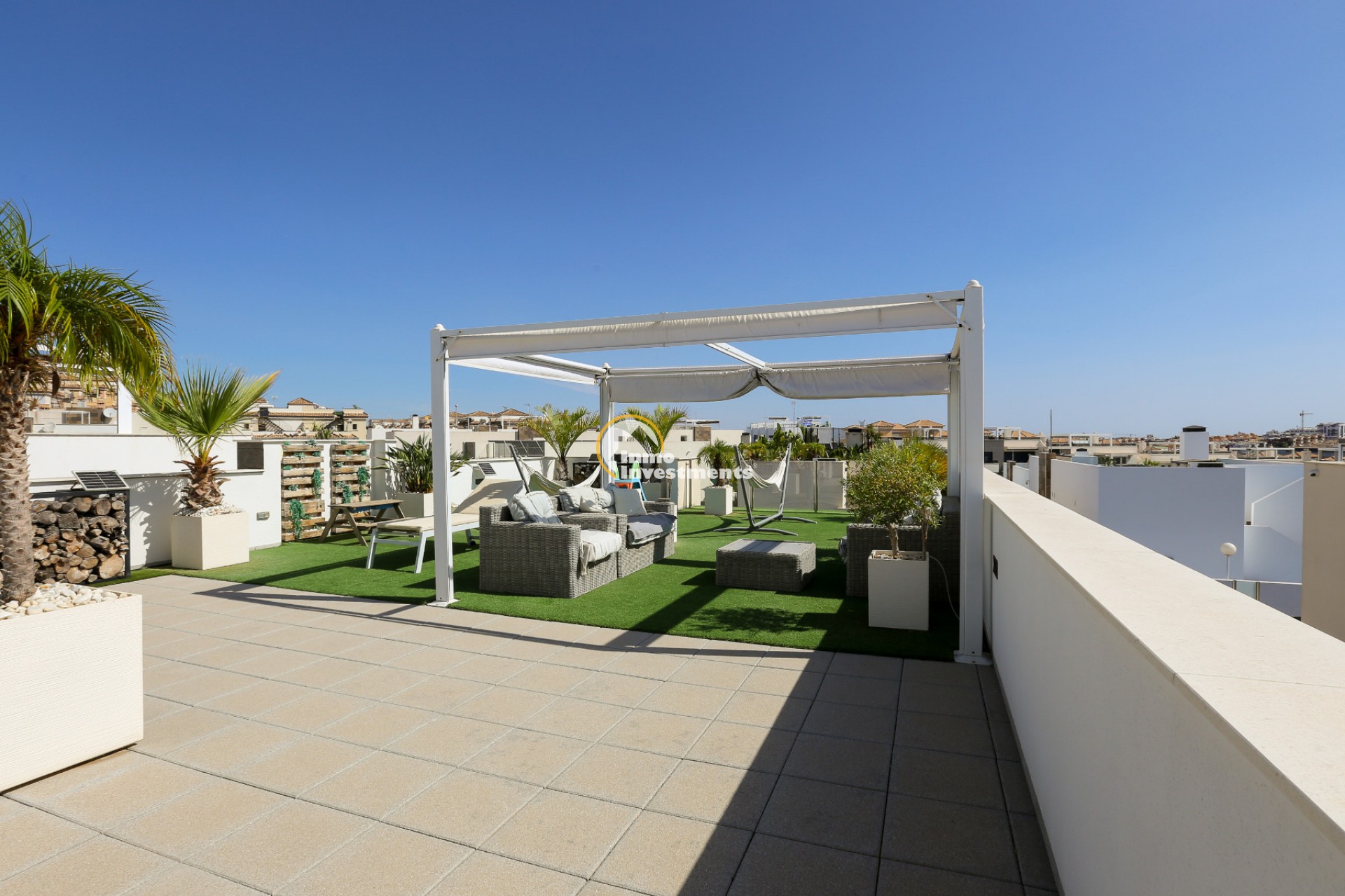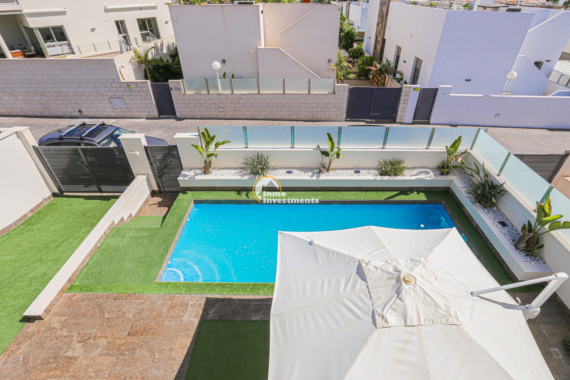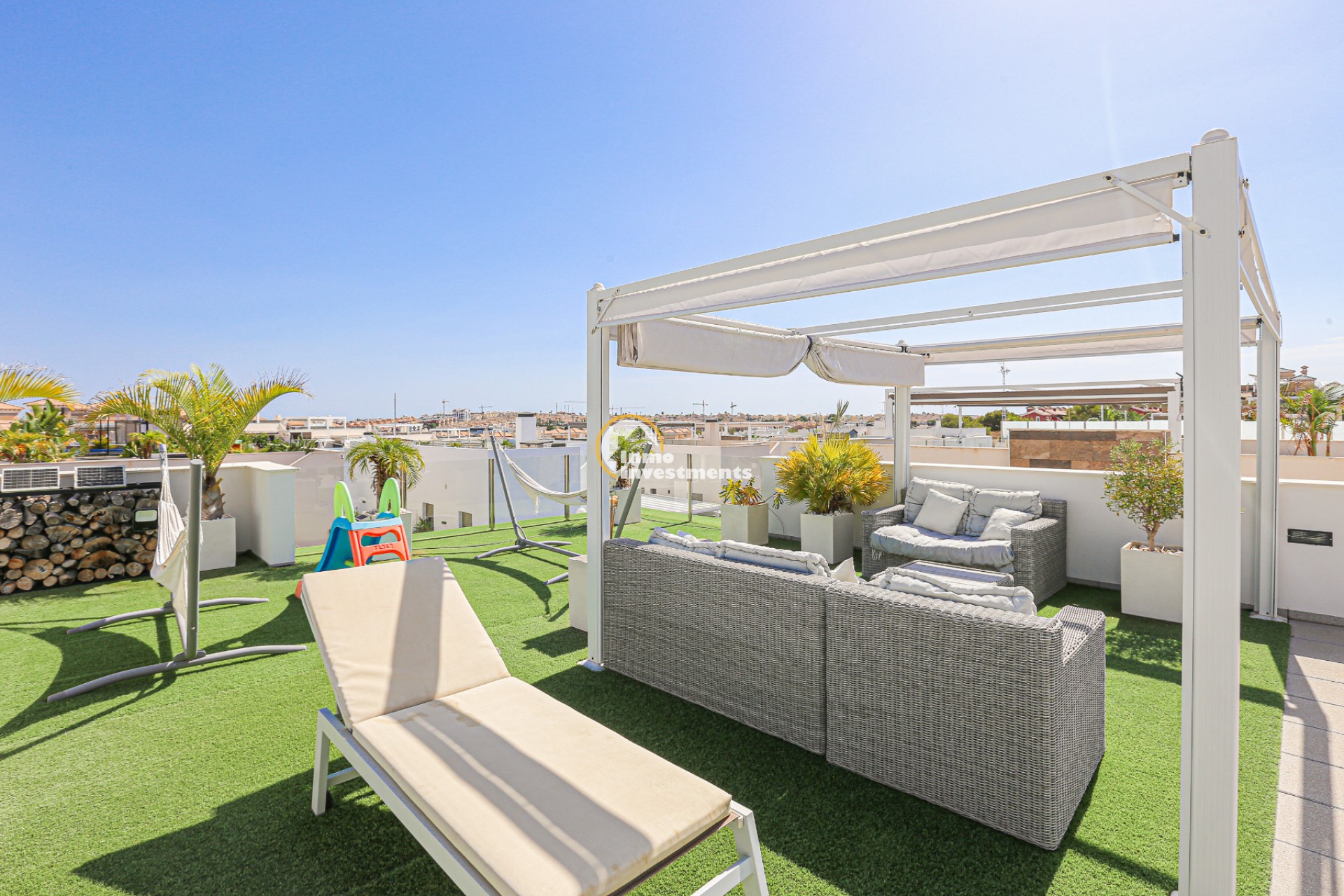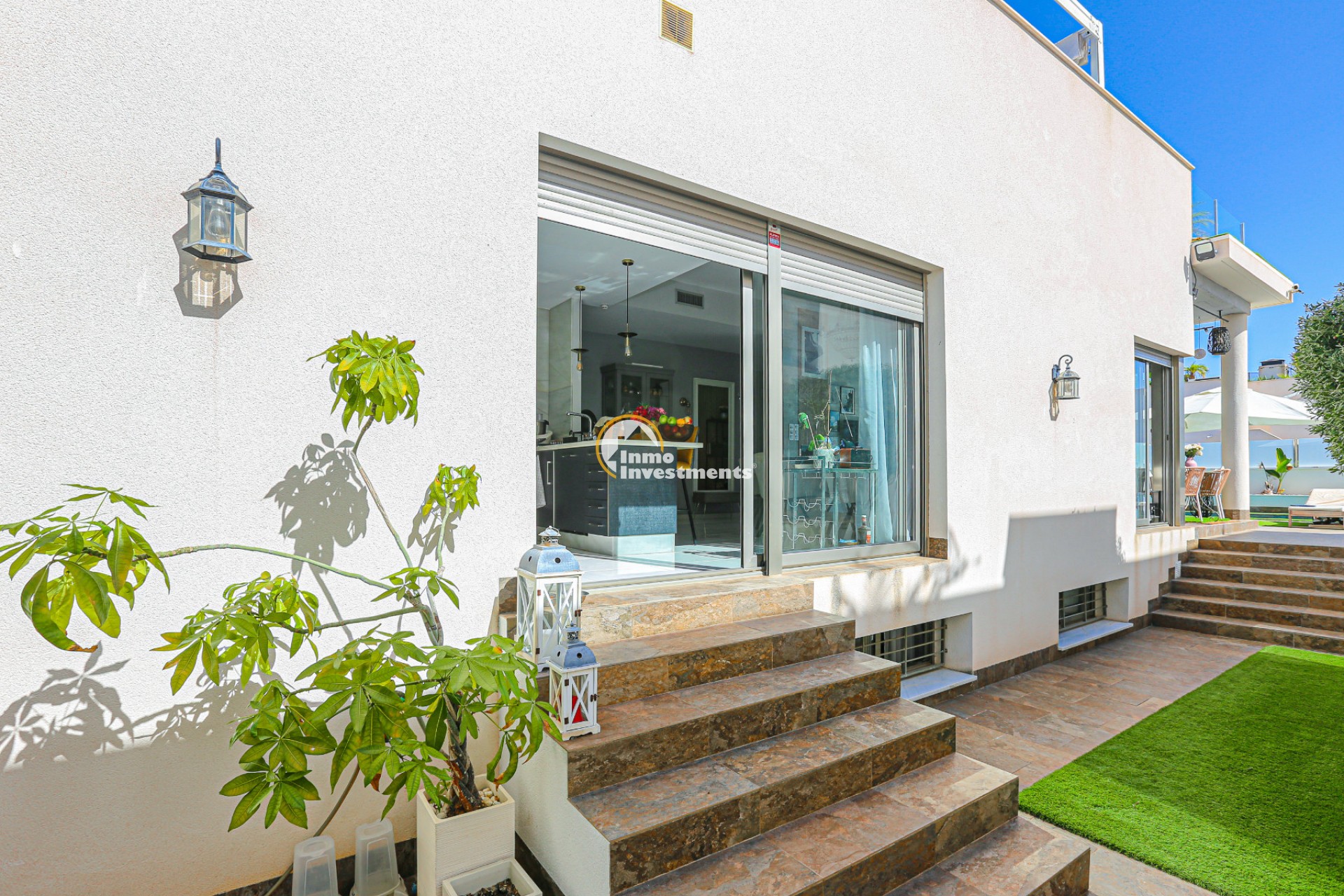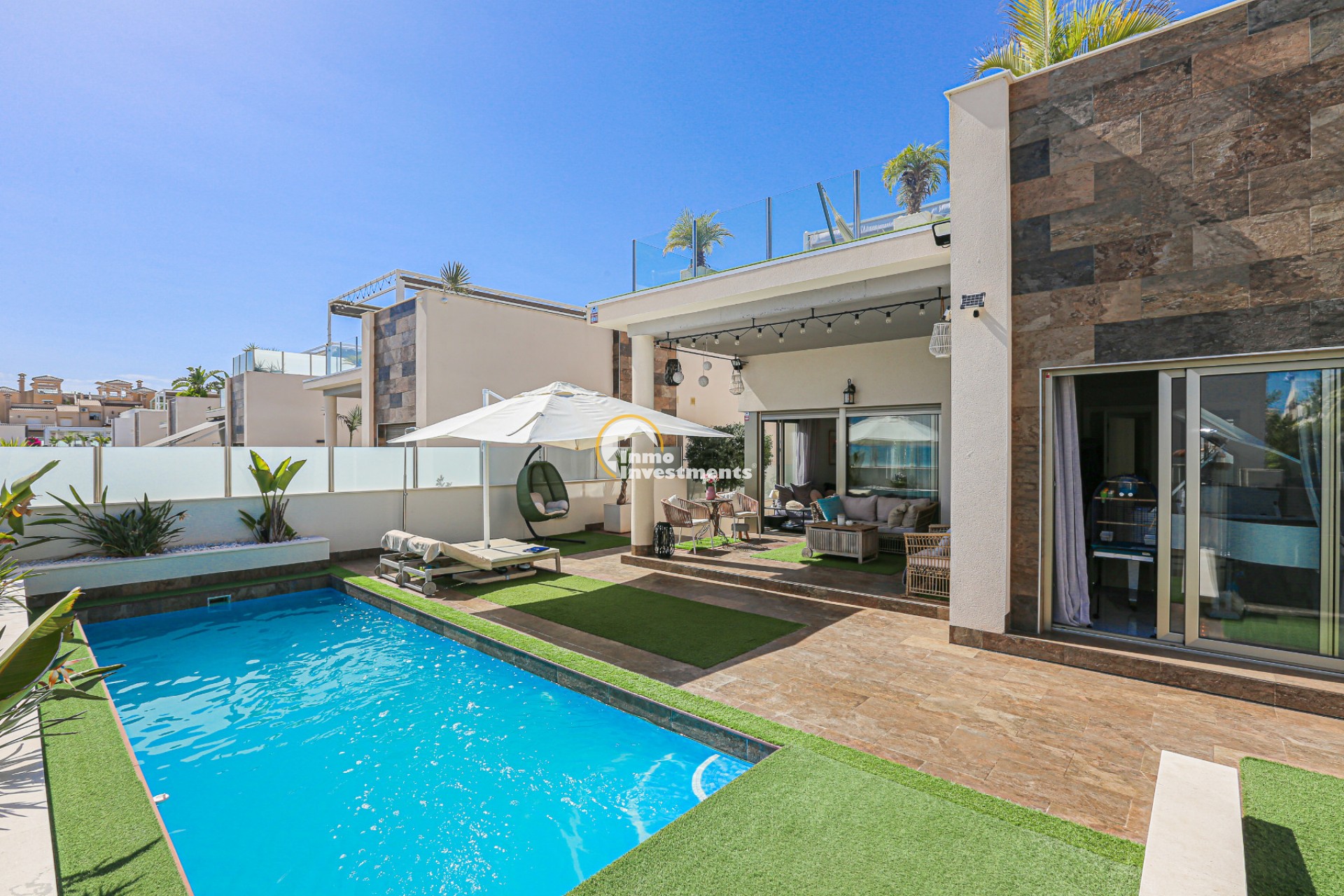Den rymliga och lättskötta tomten har flera ytor med konstgräs, en privat pool och ett stort solarium – perfekt för att njuta av Medelhavets solsken året runt. På takterrassen finns ett praktiskt handfat och möjlighet att bygga en fullt utrustad sommarkök. Ett markis gör det möjligt att äta frukost, lunch eller middag utomhus med familj och vänner. Framför huvudentrén finns dessutom en täckta veranda.