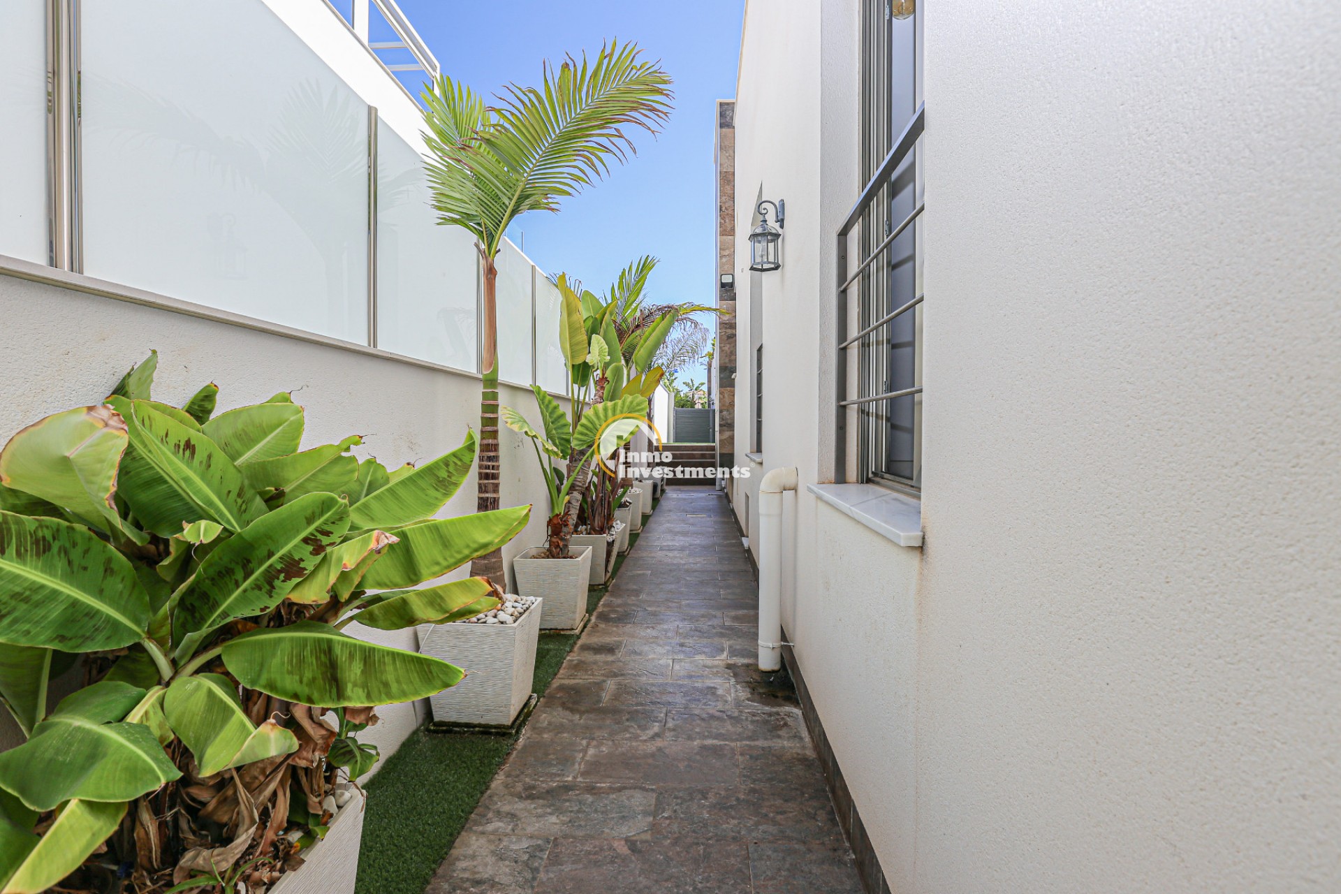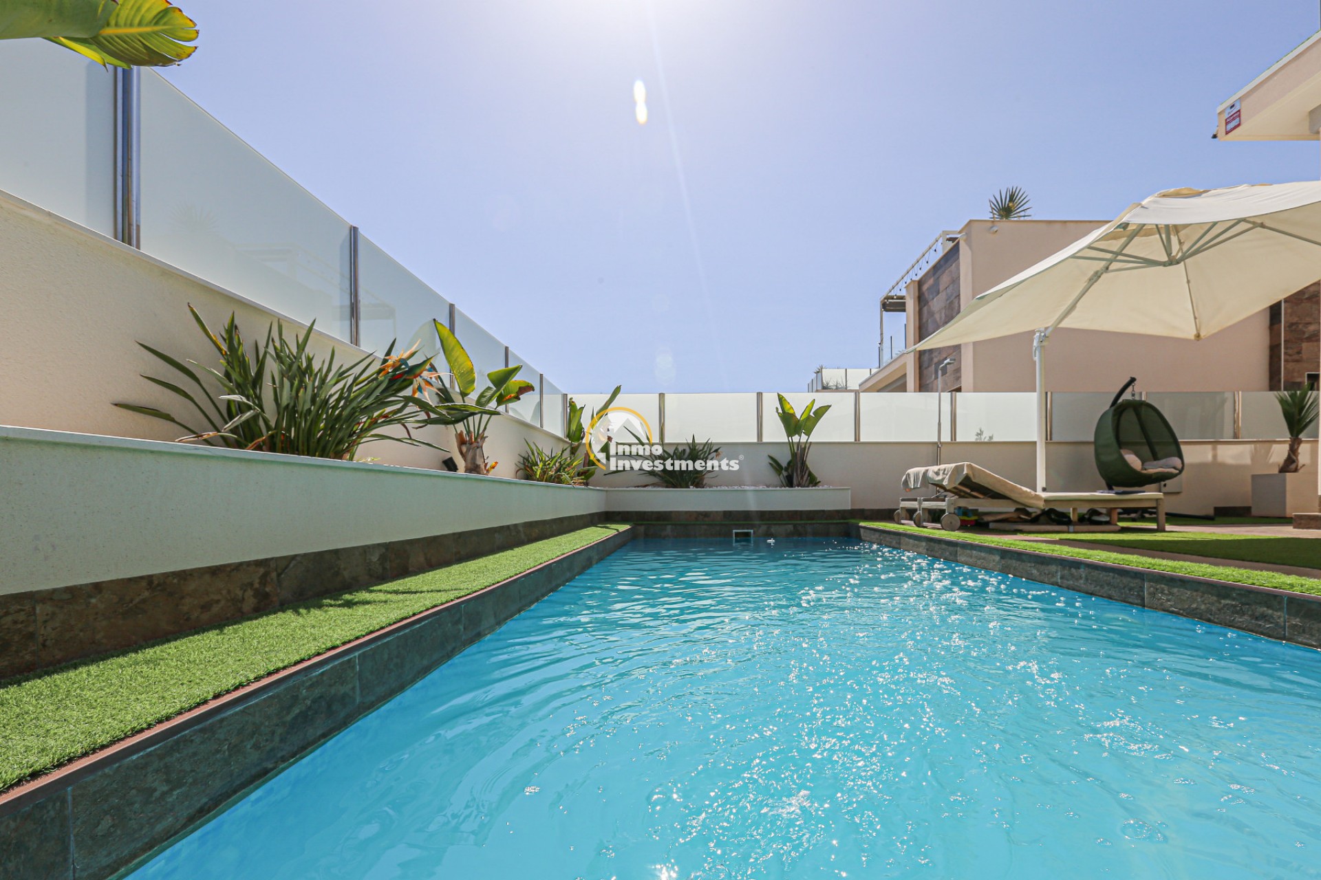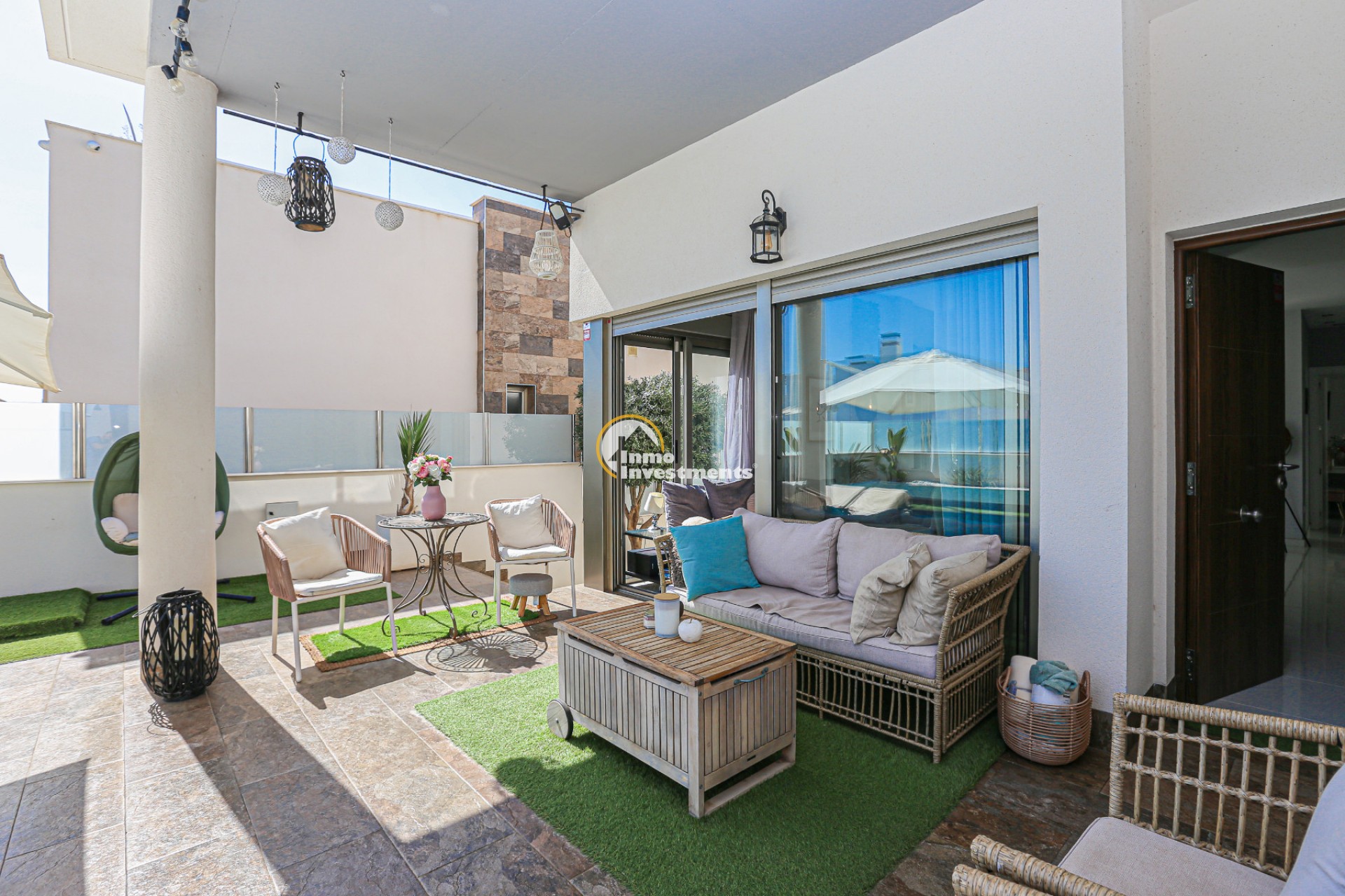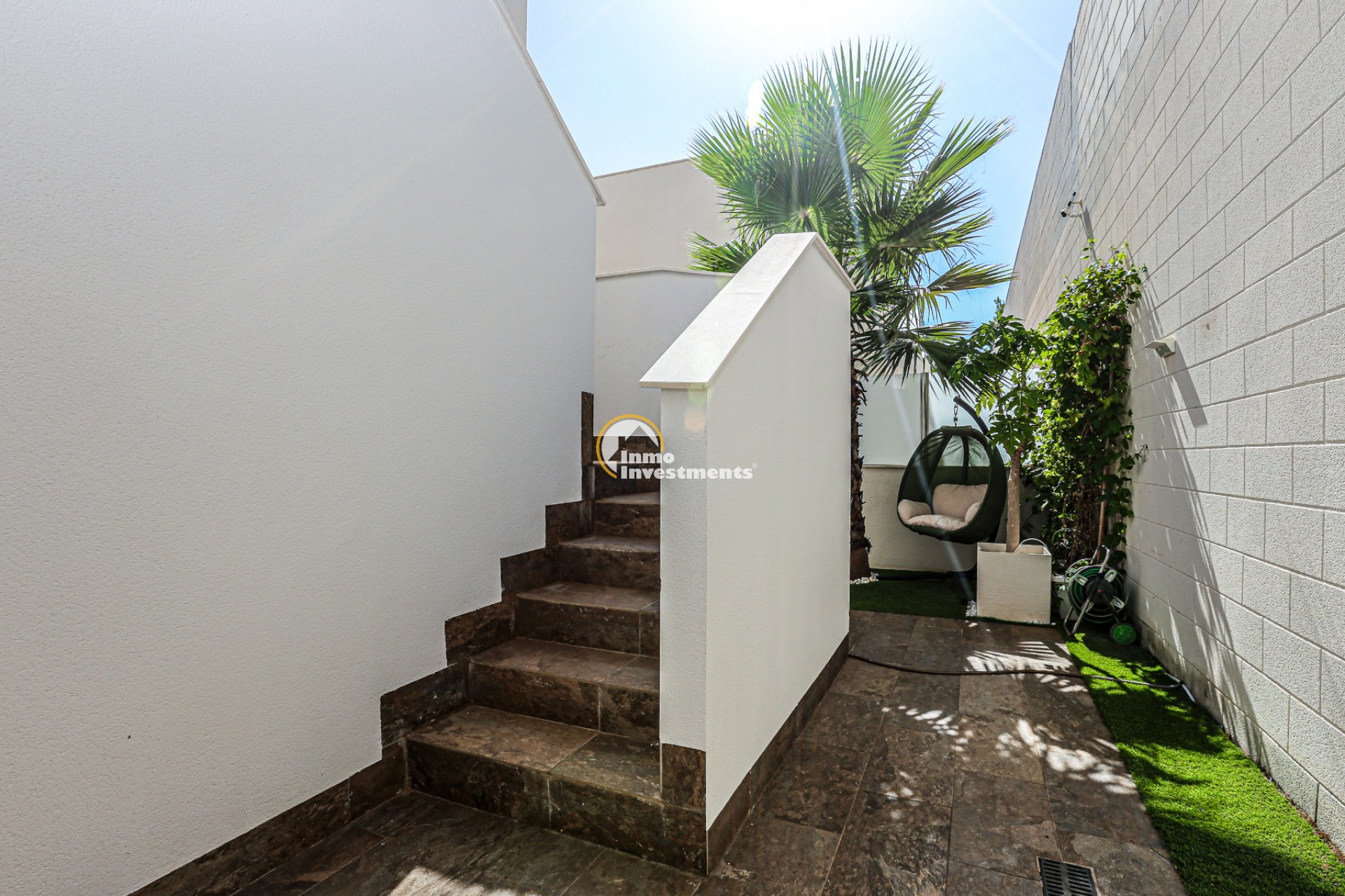 Den rymliga och lättskötta tomten har flera ytor med konstgräs, en privat pool och ett stort solarium – perfekt för att njuta av Medelhavets solsken året runt. På takterrassen finns ett praktiskt handfat och möjlighet att bygga en fullt utrustad sommarkök. Ett markis gör det möjligt att äta frukost, lunch eller middag utomhus med familj och vänner. Framför huvudentrén finns dessutom en täckta veranda.