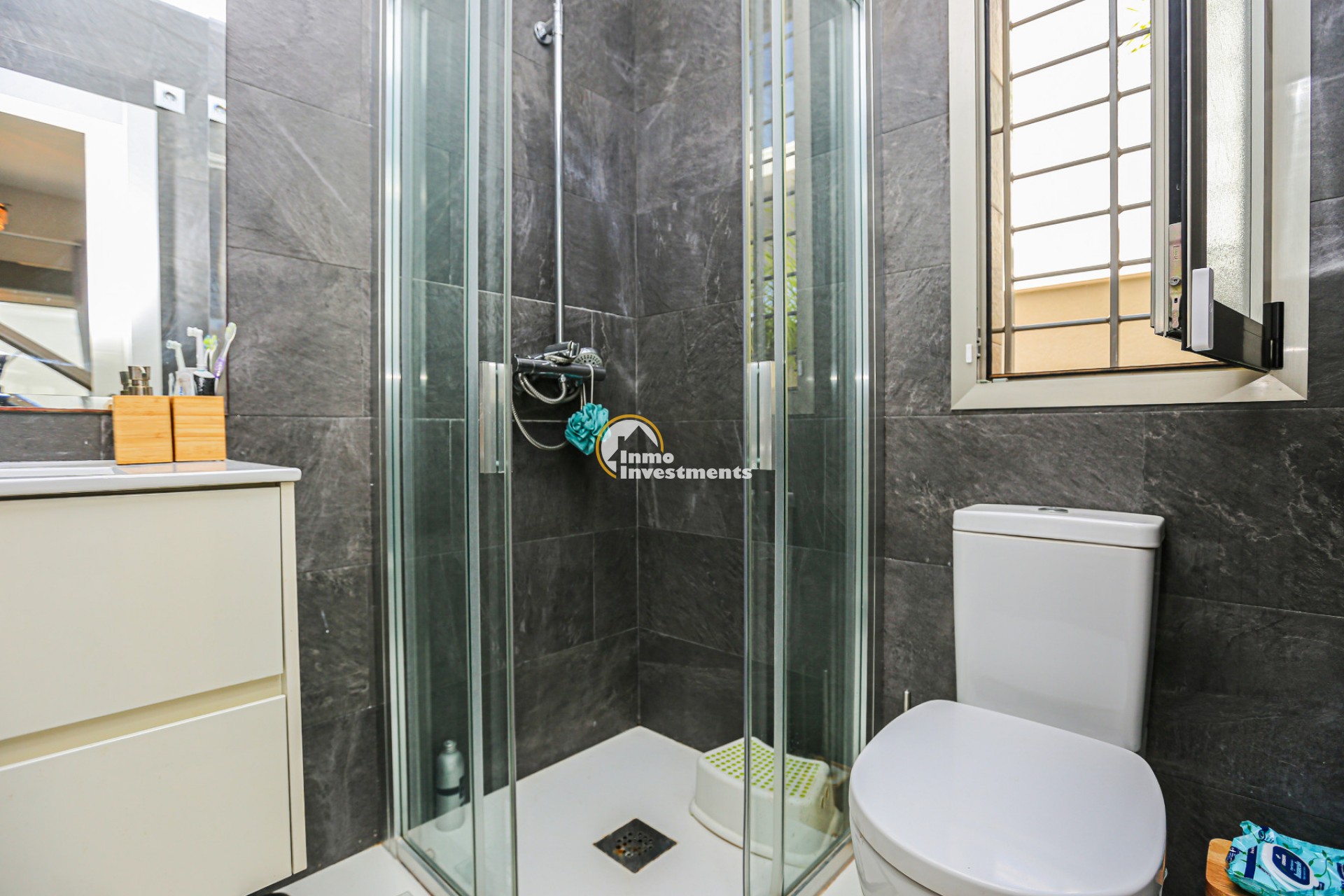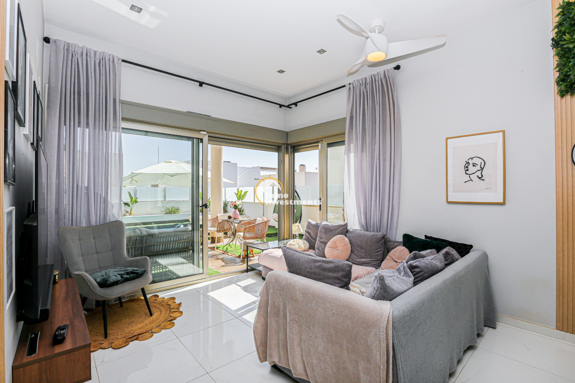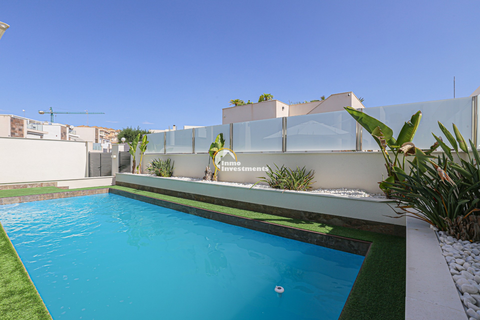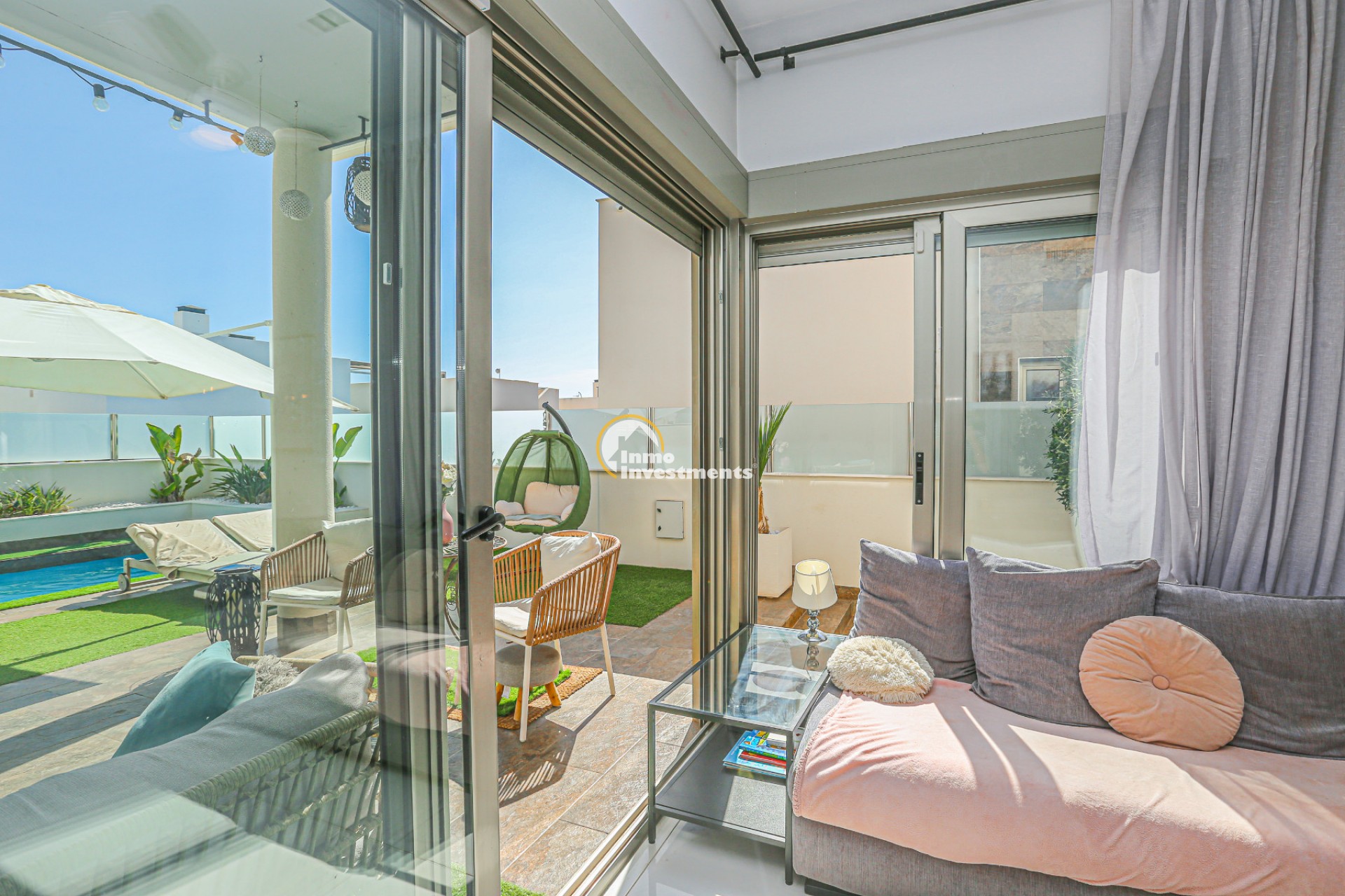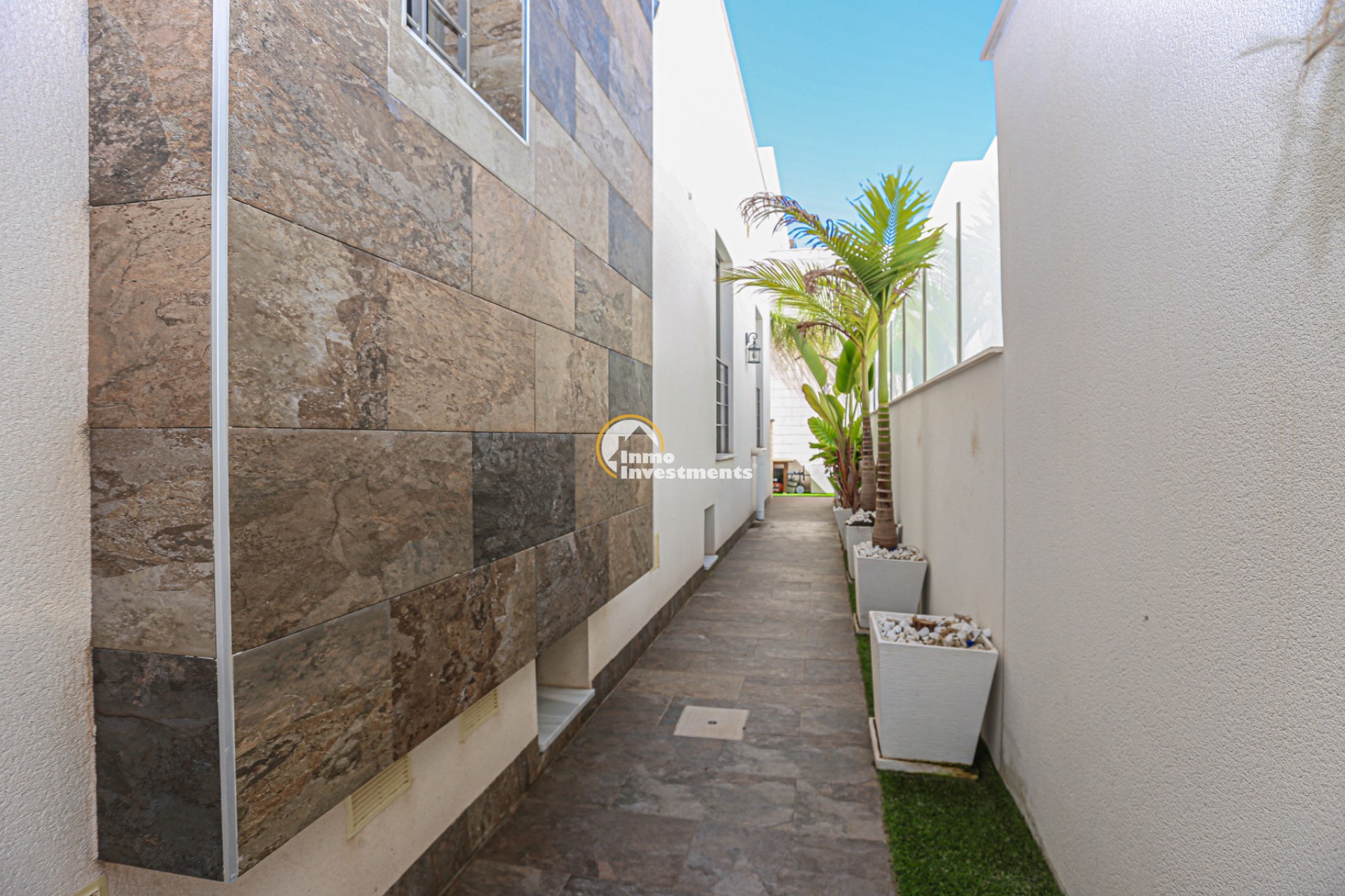 Den rymliga och lättskötta tomten har flera ytor med konstgräs, en privat pool och ett stort solarium – perfekt för att njuta av Medelhavets solsken året runt. På takterrassen finns ett praktiskt handfat och möjlighet att bygga en fullt utrustad sommarkök. Ett markis gör det möjligt att äta frukost, lunch eller middag utomhus med familj och vänner. Framför huvudentrén finns dessutom en täckta veranda.