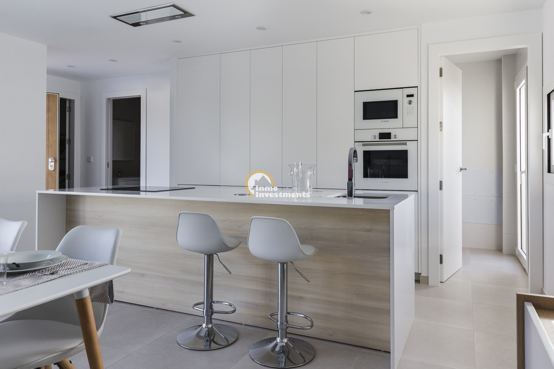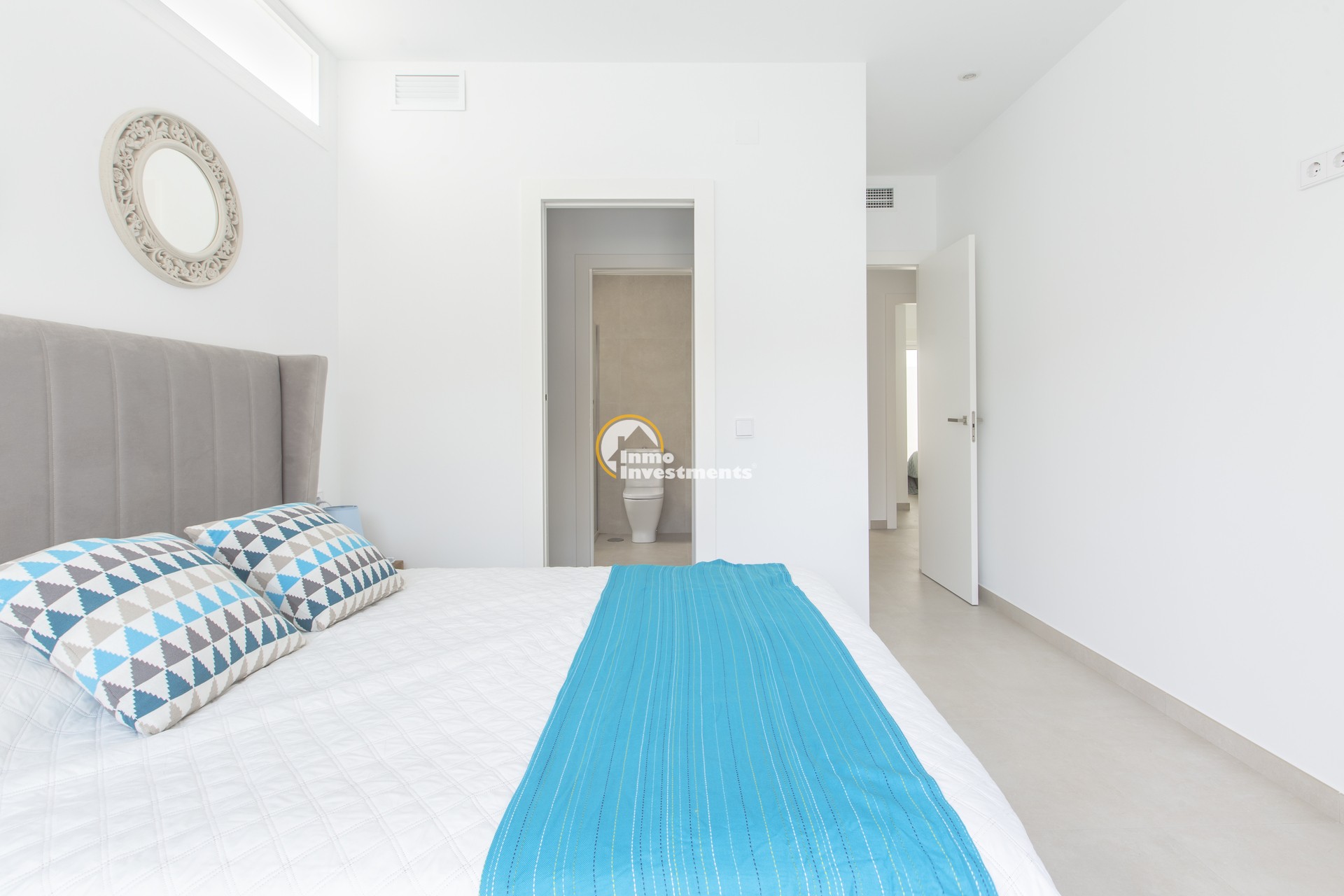 Villornas interiör är utformad för att maximera komfort och funktionalitet. På bottenvåningen finns ett ljust vardagsrum med kök i öppen planlösning, utrustat med moderna apparater och högkvalitativa material. Vardagsrummet har direkt tillgång till terrassen och poolen, vilket skapar ett öppet och genomskinligt utrymme som är perfekt för det dagliga livet. På denna våning finns också ett sovrum med dubbelsäng med inbyggd garderob och ett komplett badrum. På första våningen finns två rymliga sovrum, det ena med inbyggd garderob och det andra med omklädningsrum och eget badrum, vilket ger ett privat och bekvämt utrymme. Högkvalitativa ytskikt och detaljerad design garanterar en lyxig och modern boendeupplevelse. Med en boyta på 105 m² är interiören utformad för att erbjuda en mysig och funktionell miljö.