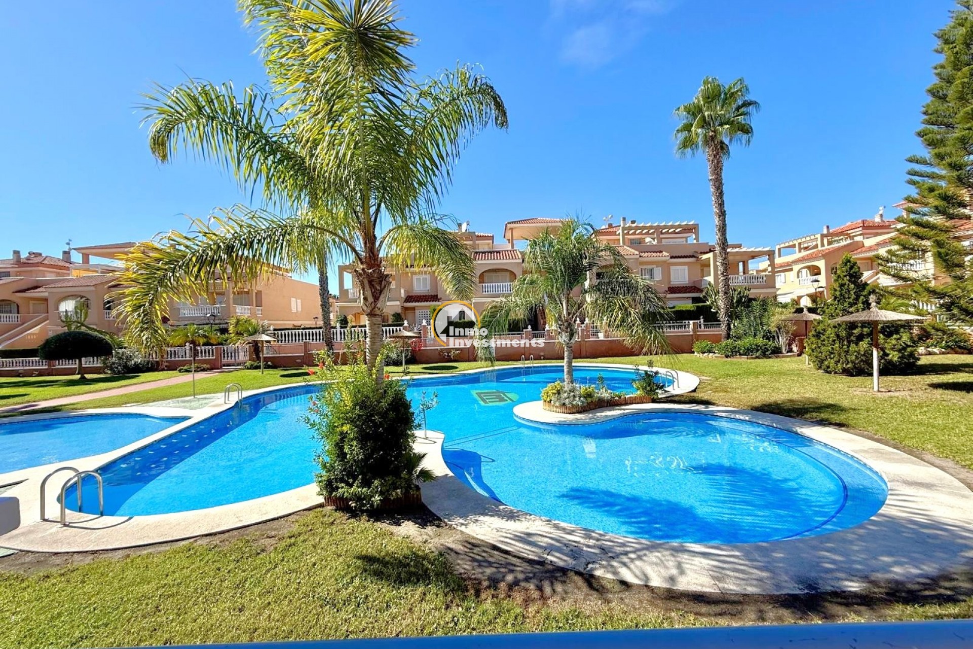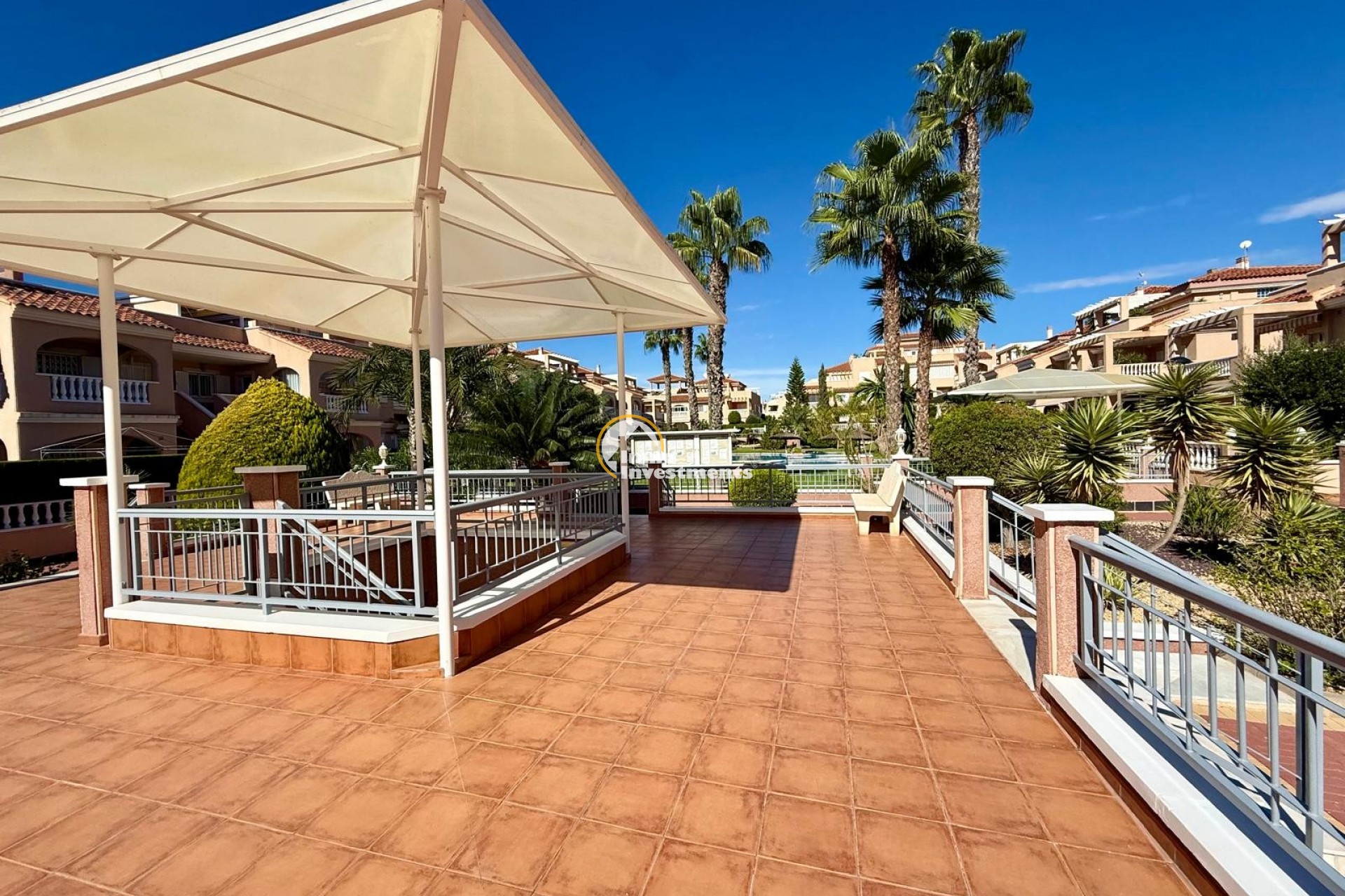 Denna attraktiva bostad har trevliga vyer över de vackert underhållna gemensamma trädgårdarna och det stora poolområdet.
