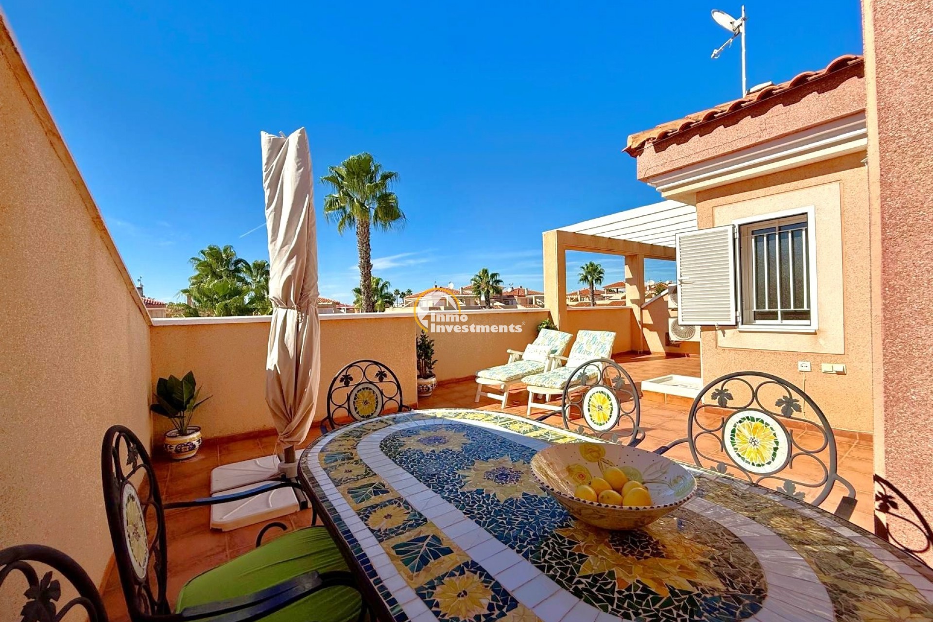 Det privata soltaket erbjuder både sol och skugga under hela dagen, vilket gör det till en perfekt plats för avkoppling eller umgänge.