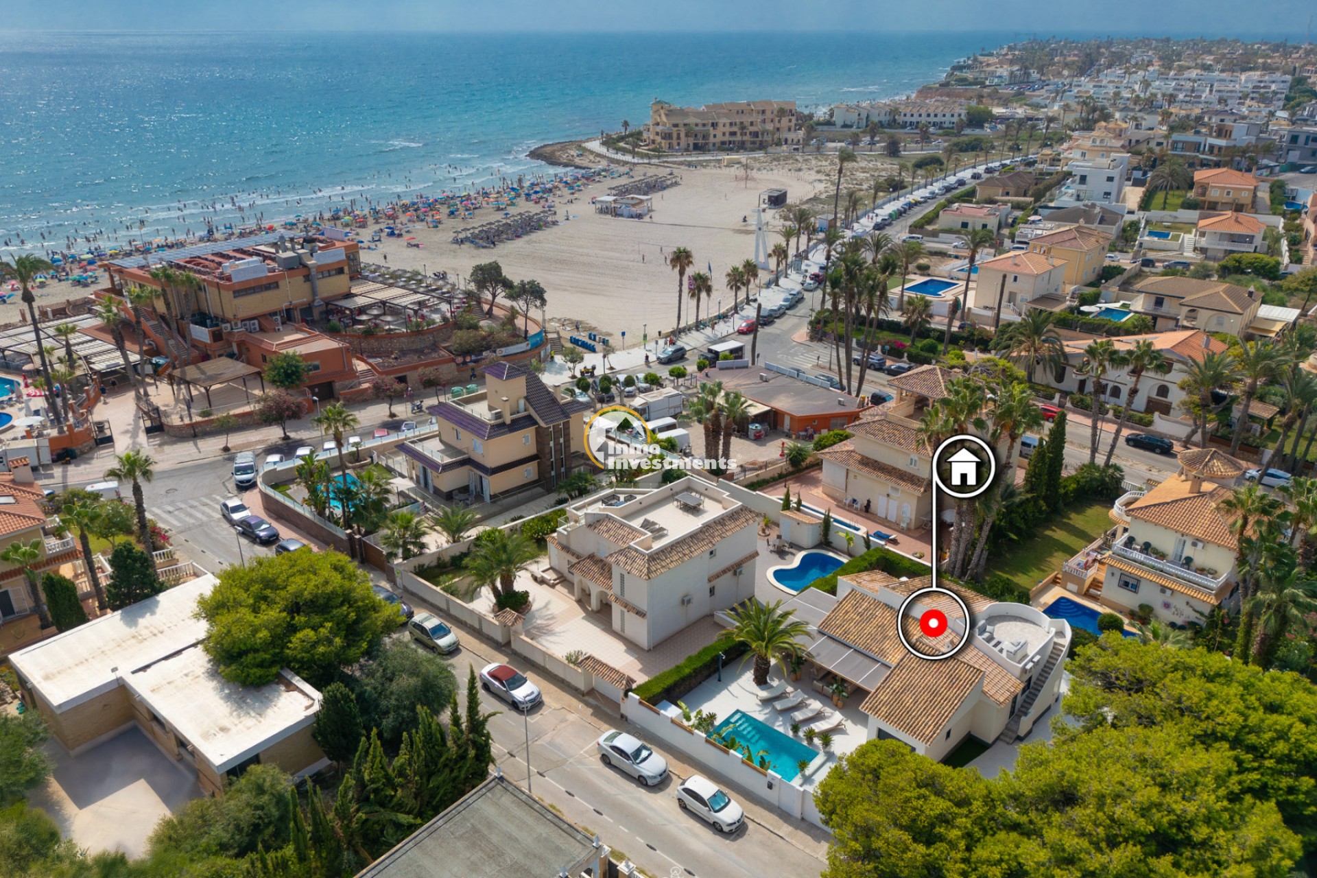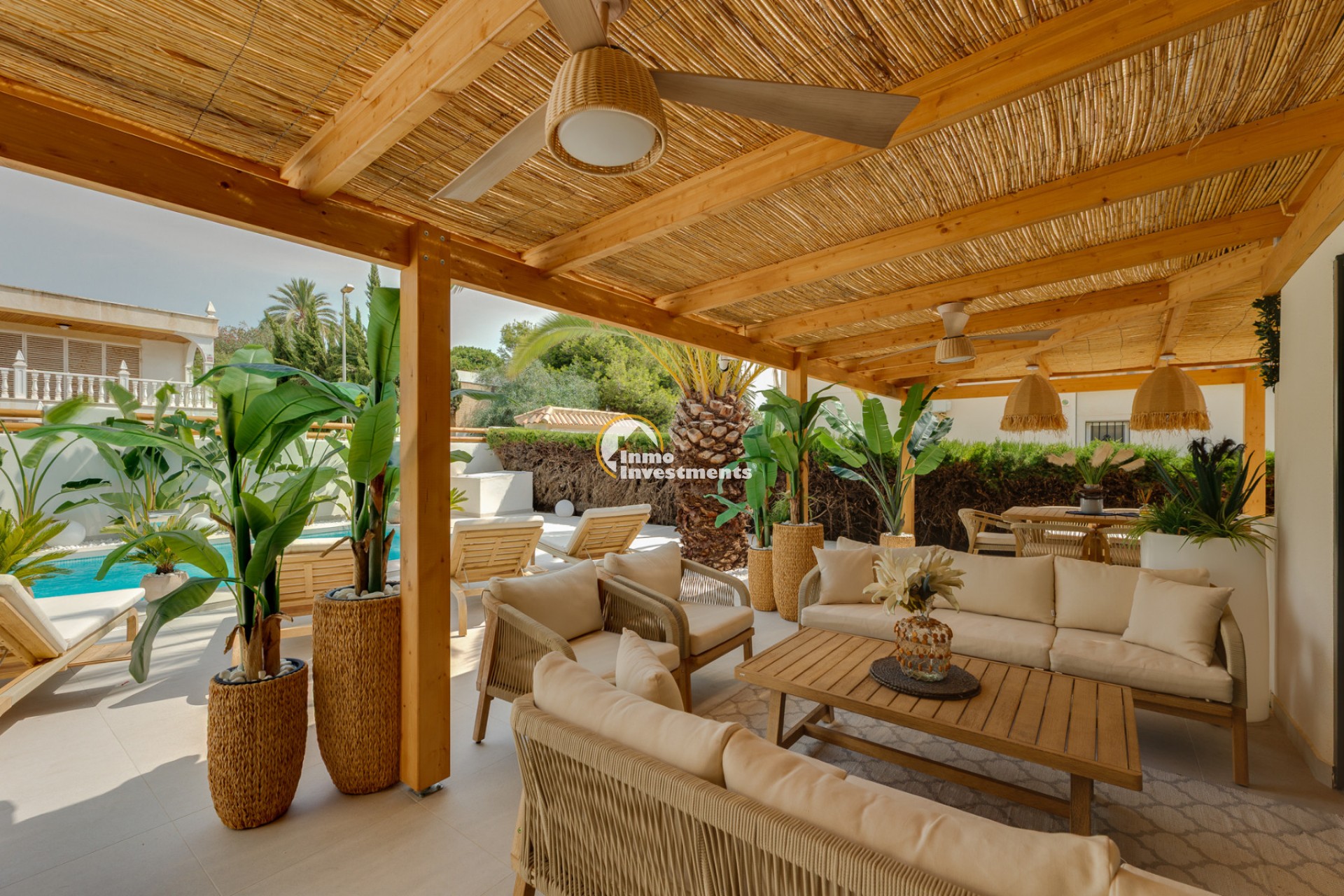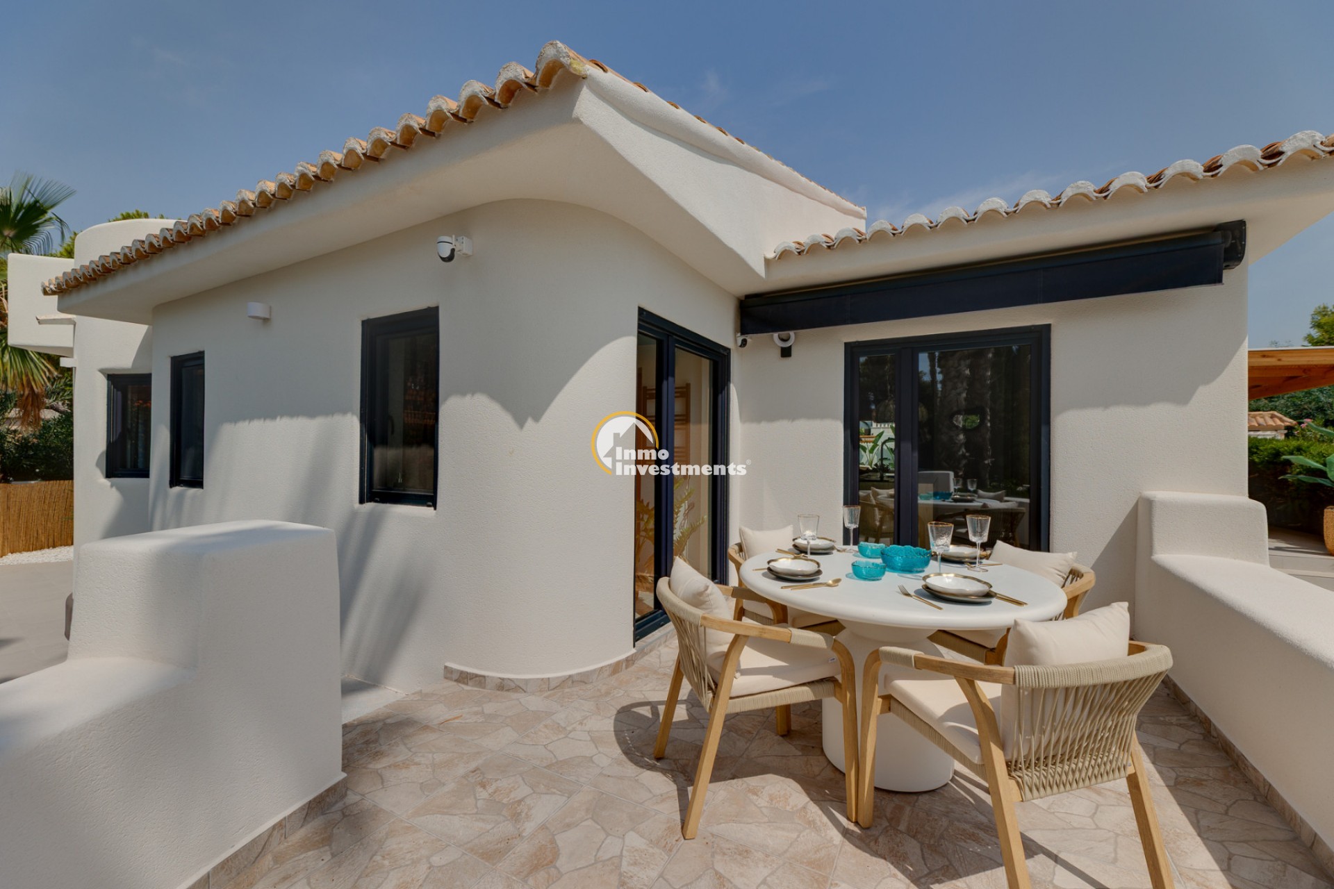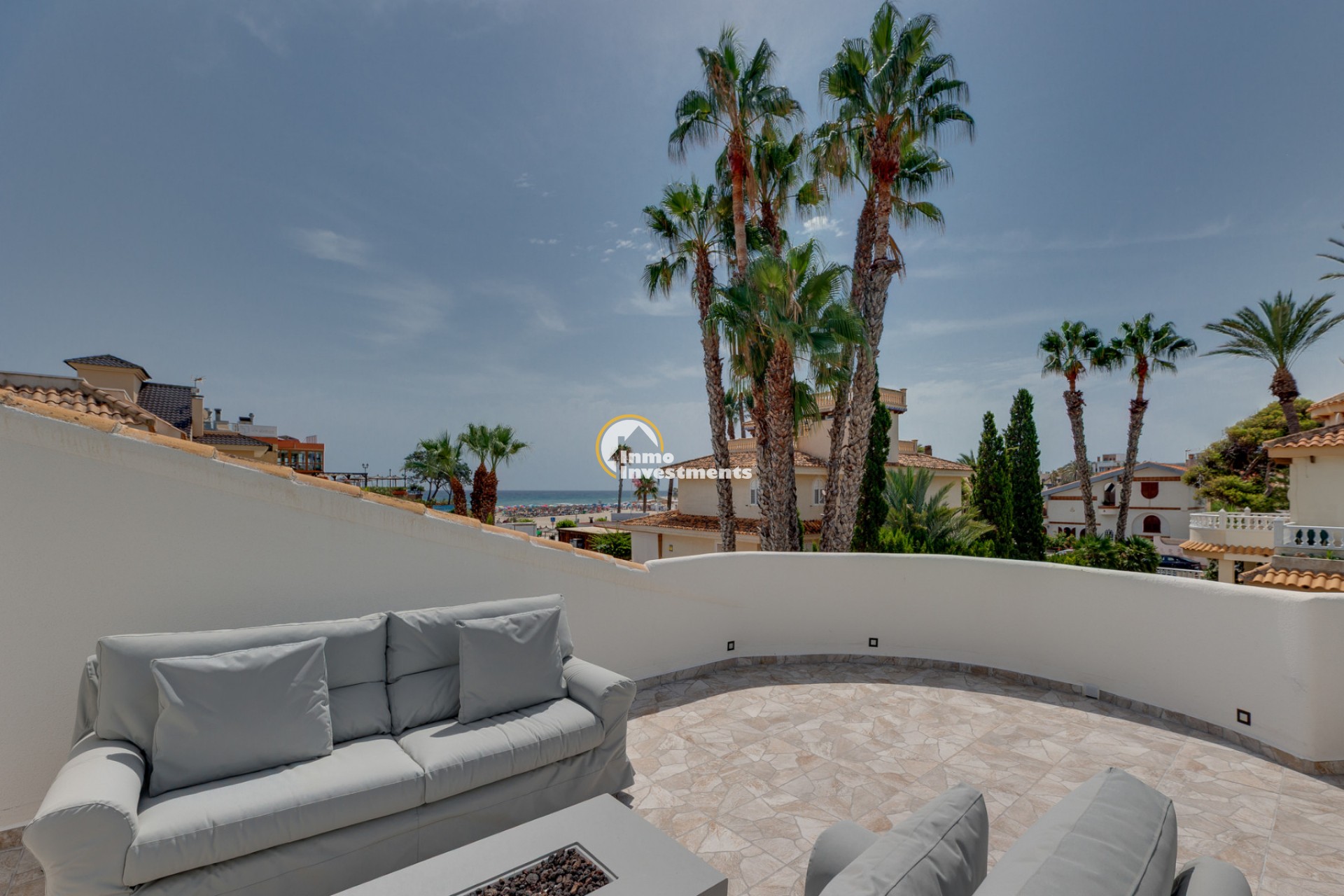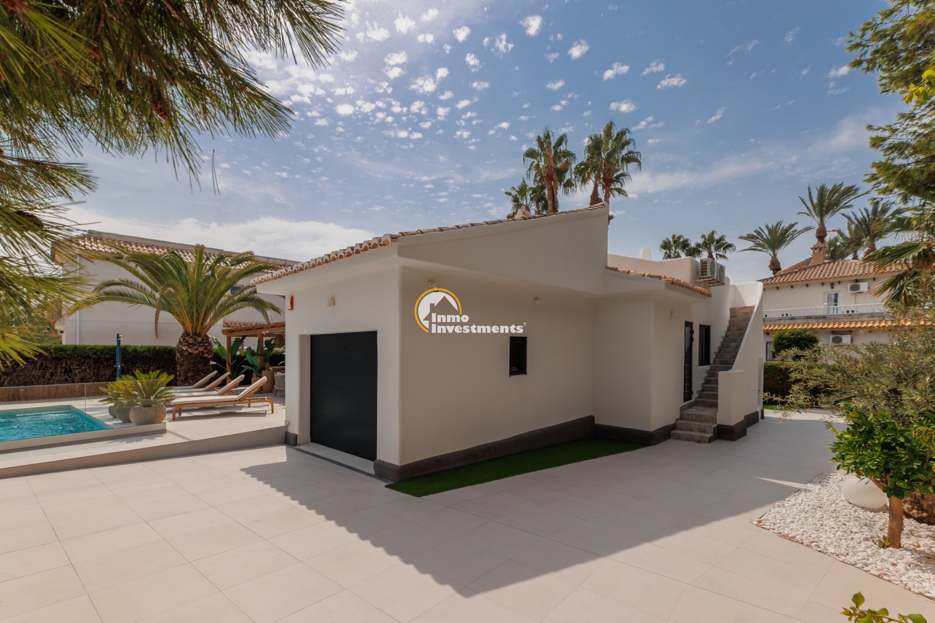 Denna välskötta villa i Ibiza-stil ligger i La Zenia, endast 200 meter från stranden La Zenia. Fastigheten har nyligen renoverats och erbjuder 134 m² boyta på en tomt på 600 m², omgiven av en välskött trädgård med palmer och fruktträd. Inomhus finns ett ljust vardagsrum med matplats, ett modernt kök med köksö, tre dubbelrum med inbyggda garderober, två badrum samt en gästtoalett.