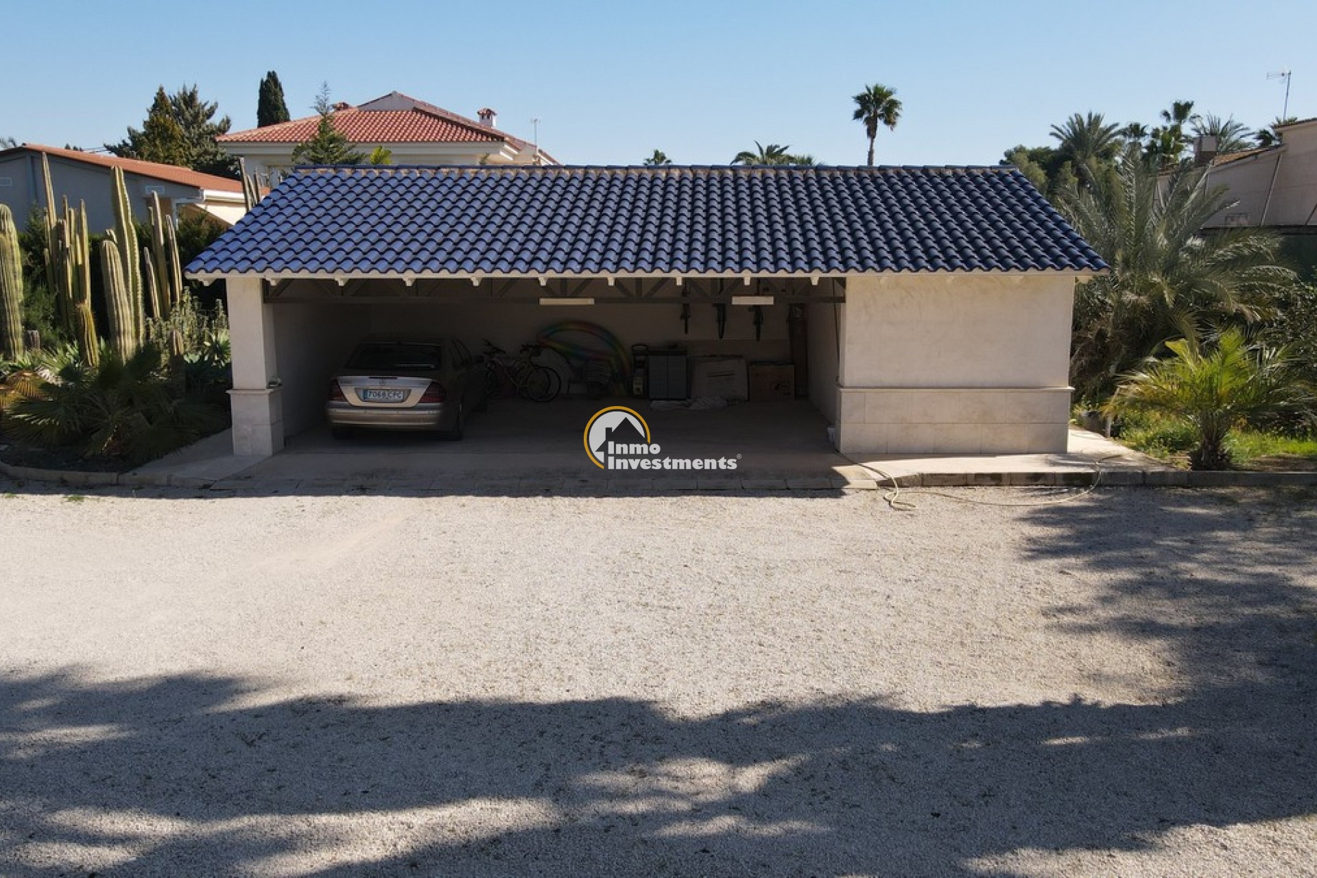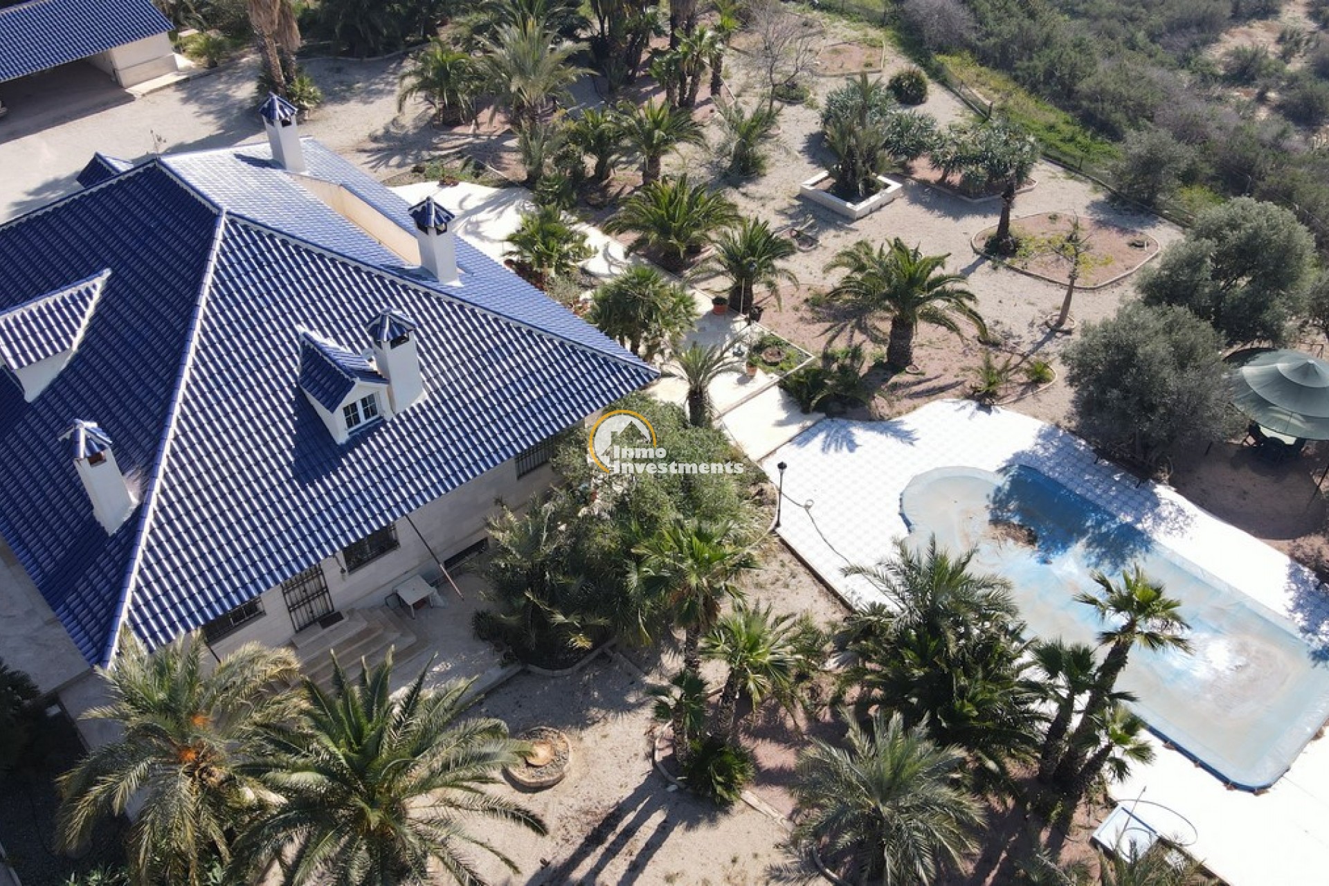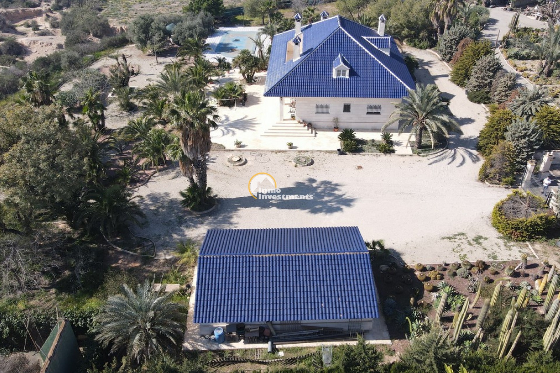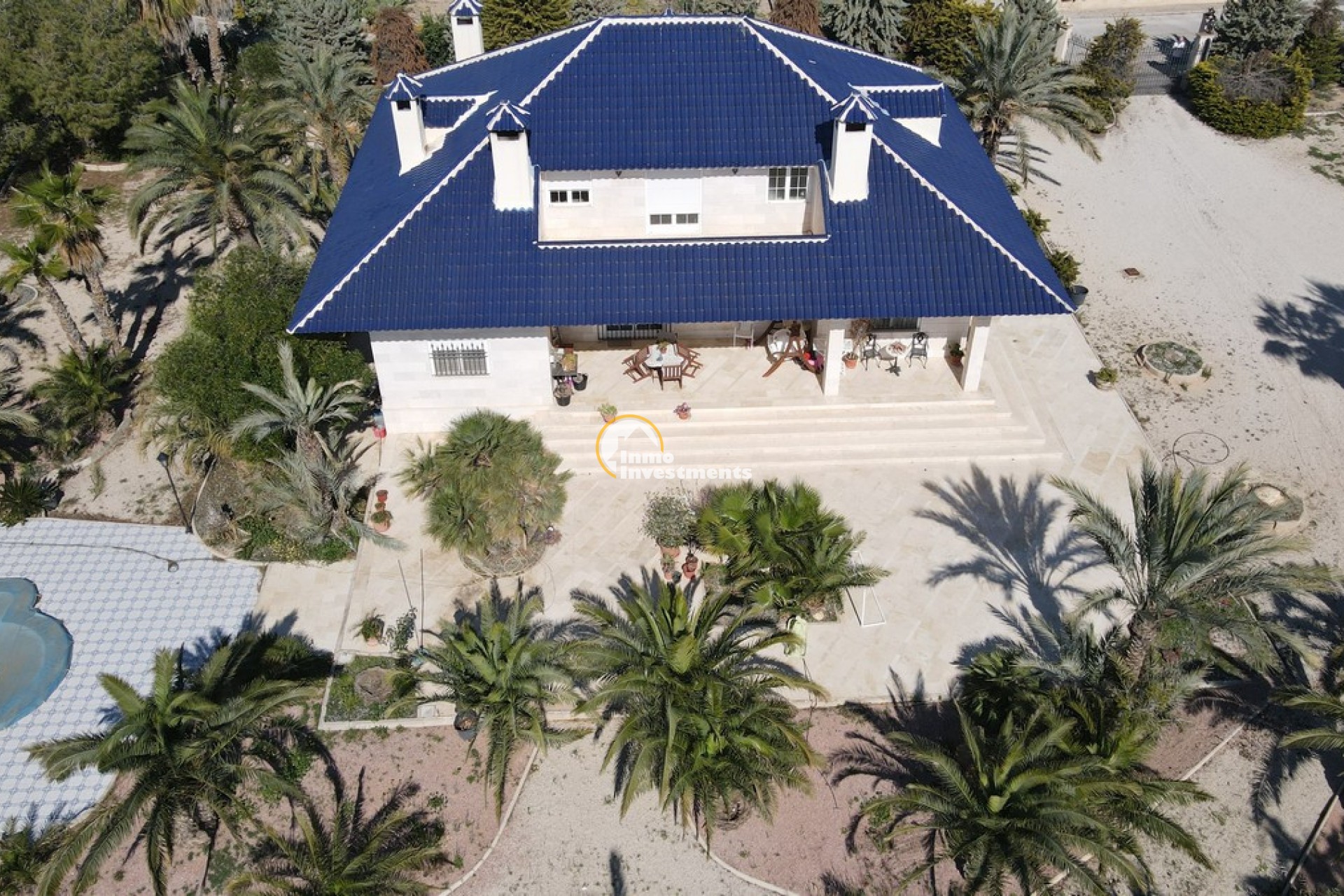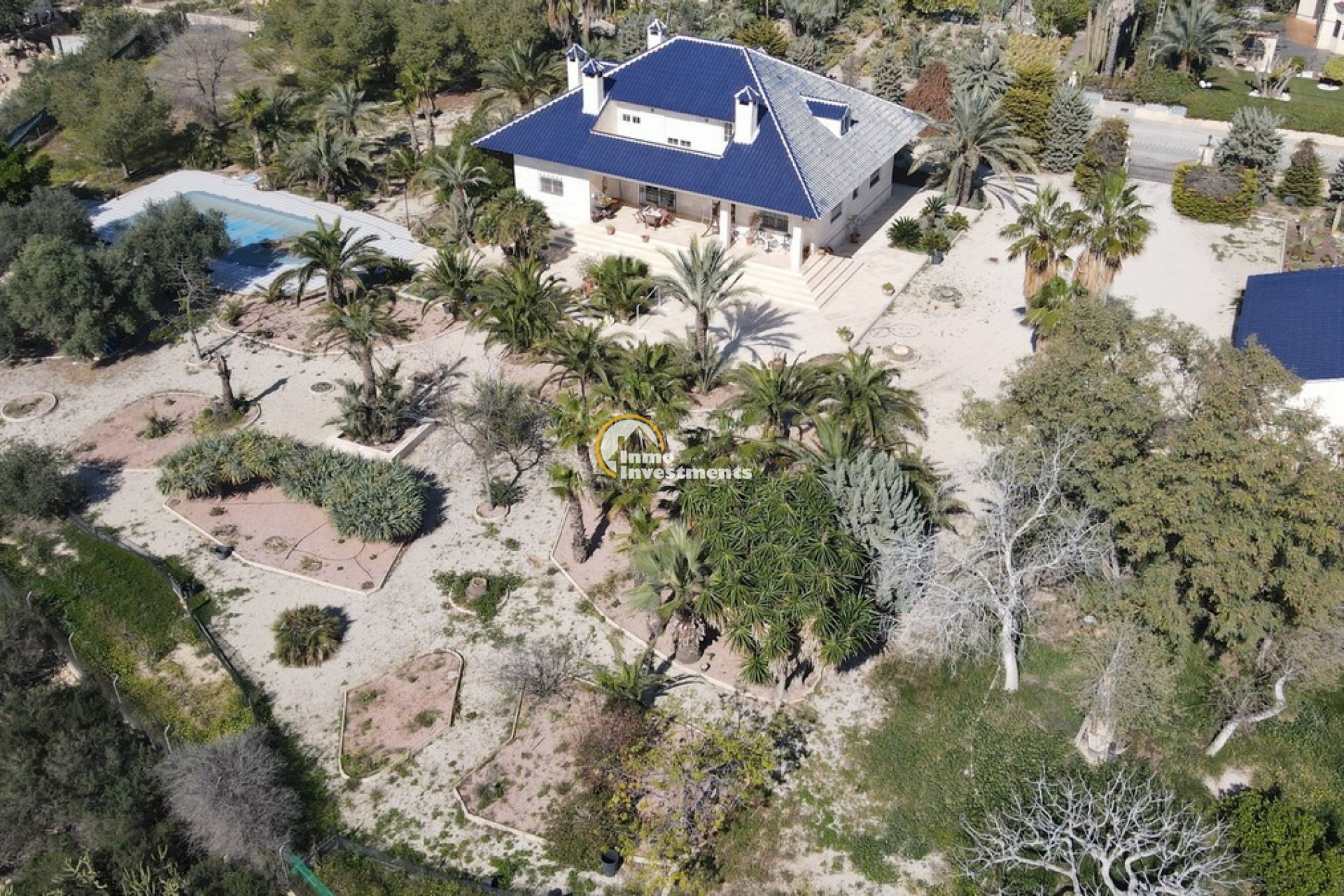 Södervänd villa belägen i den prestigefyllda urbanisationen Partida Llano San José i Elche. På bottenvåningen finns en stor entréhall som leder till köket och den formella matsalen, båda med utgång till en rymlig täckt terrass. Här finns även ett vardagsrum och ett stort kök med frukostplats. På motsatt sida av bostaden finns tre sovrum och två badrum. Övervåningen är avsedd för mastersviten, som inkluderar ett stort sovrum med utgång till en privat balkong, ett mycket rymligt badrum samt en stor walk-in-garderob och dressing room. Källarplanet på cirka 100 m² erbjuder ytterligare tre sovrum, ett badrum, ett stort spel- eller sällskapsrum samt en bodega.Utomhus erbjuder fastigheten ett separat garage med plats för minst tre bilar, en stor 10 x 5 pool med uteplats samt uppvuxna trädgårdar med en variation av etablerade växter och kaktusar.Fastigheten ligger längst in på en liten återvändsgata, vilket ger ett mycket lugnt och privat läge. Villan står på en tomt om cirka 5,000 m². I detta område är minsta tomtstorlekarna omkring 2,000 m², alla klassificerade som urban mark snarare än rustik, vilket ger gott om utrymme och avstånd mellan grannfastigheterna. Urbanisationen består huvudsakligen av permanentboende spanjorer, med några nord- europeiska familjer som också bor i området.